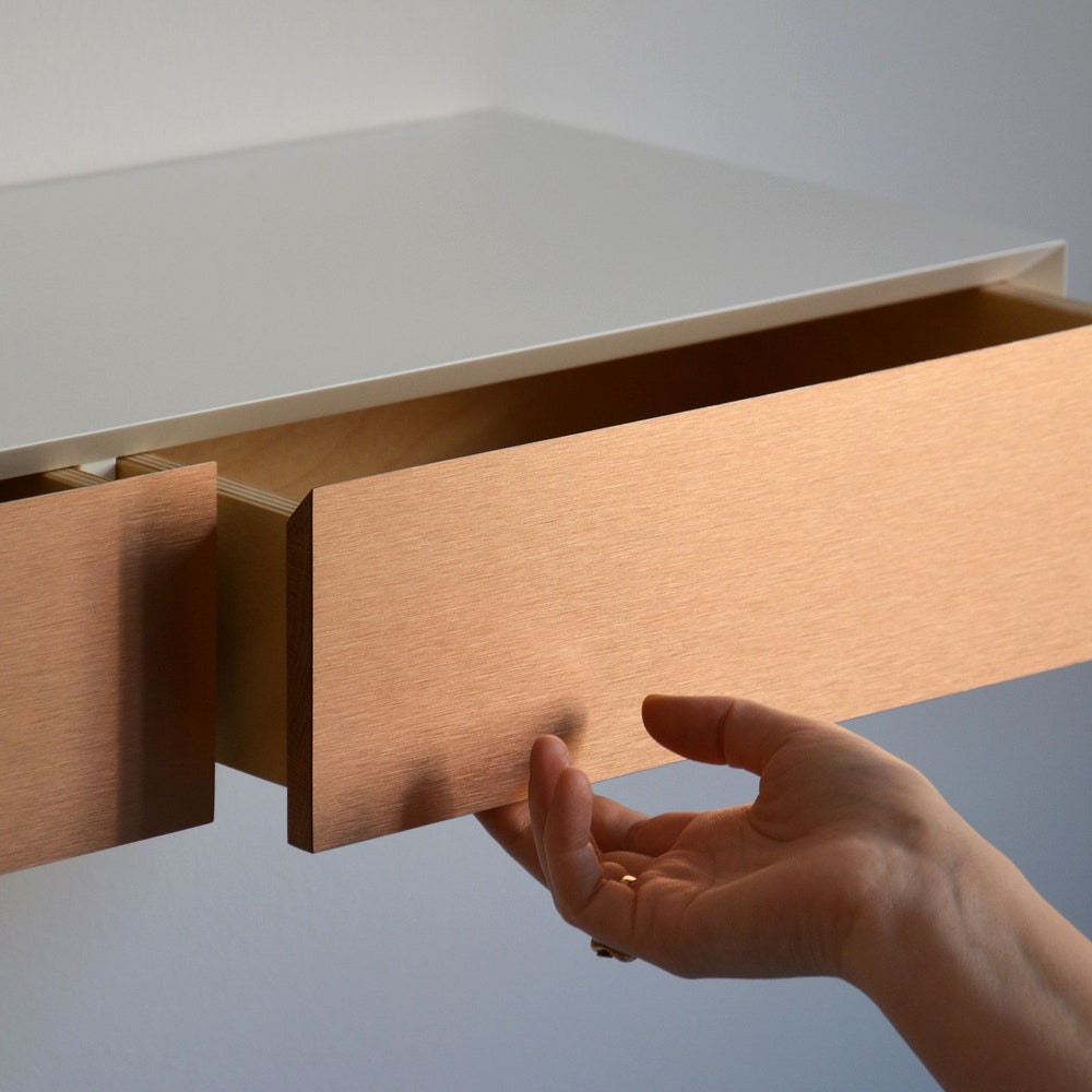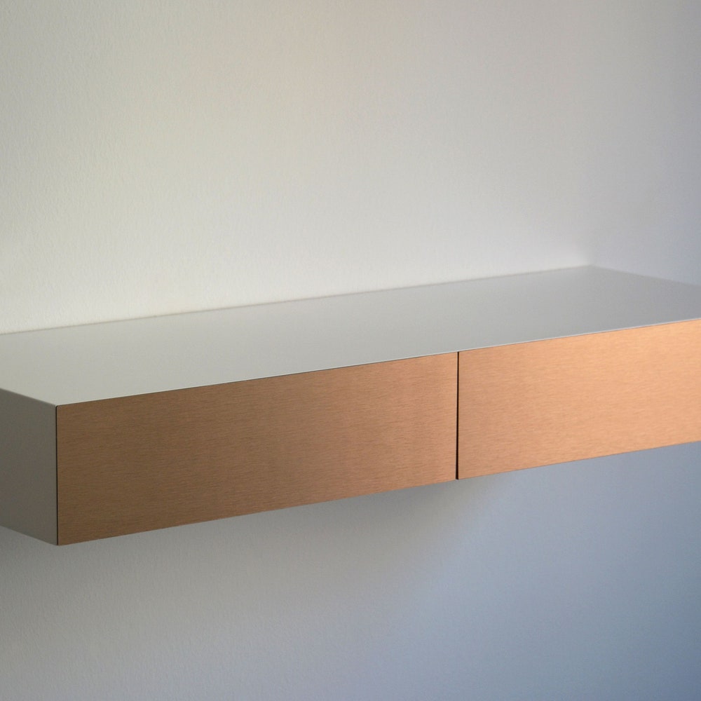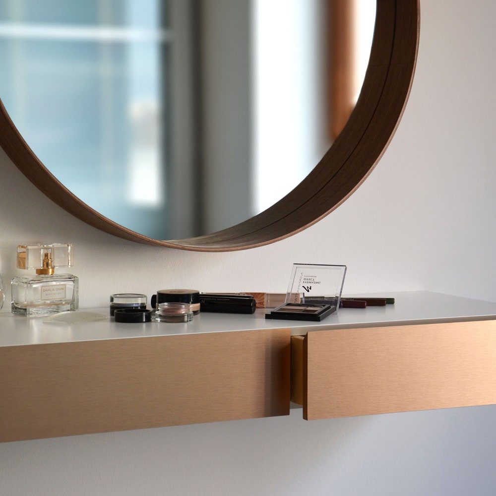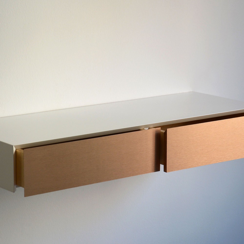 MINIMALIST white floating dressing table with COPPER drawers