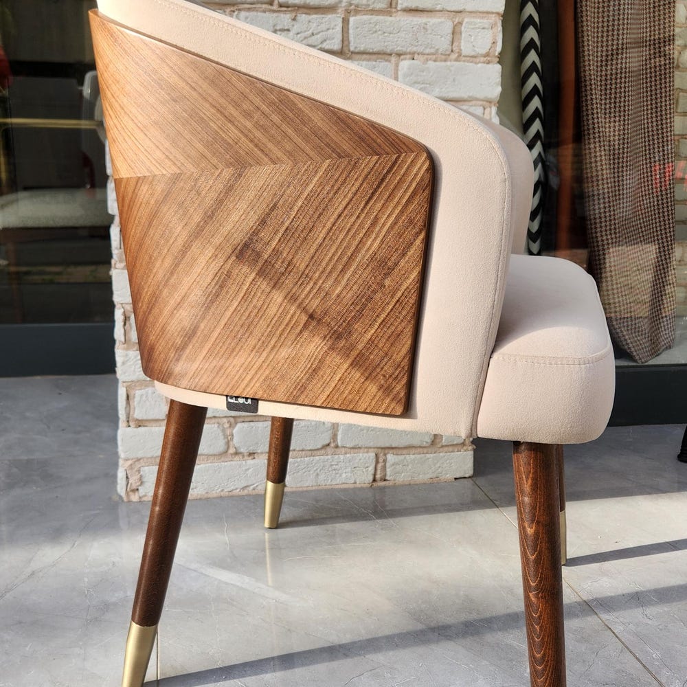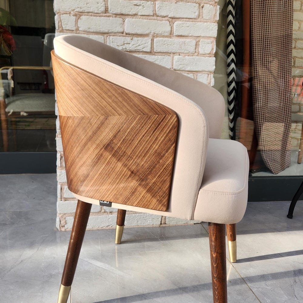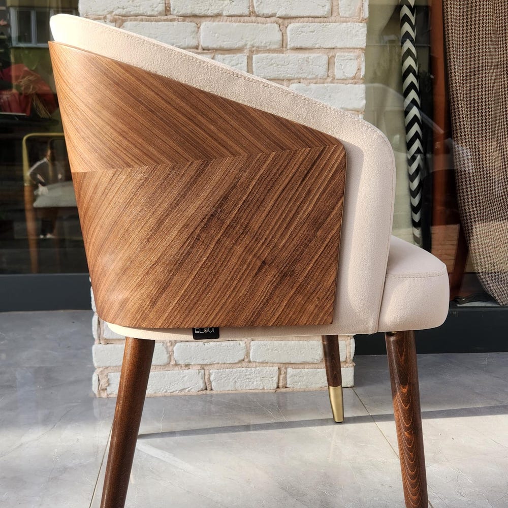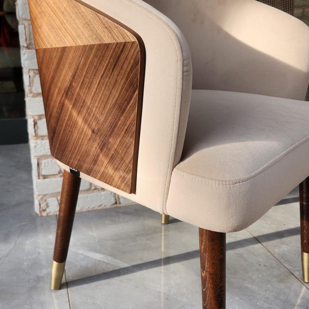 The seat and backrest are upholstered with a soft, textured fabric in a neutral beige tone, offering superior comfort for long meals or casual gatherings. The ergonomic design provides excellent back support, while the sleek, angled legs add a touch of mid-century modern charm.