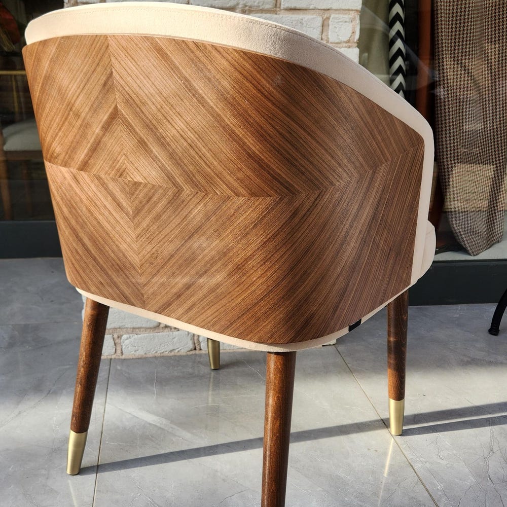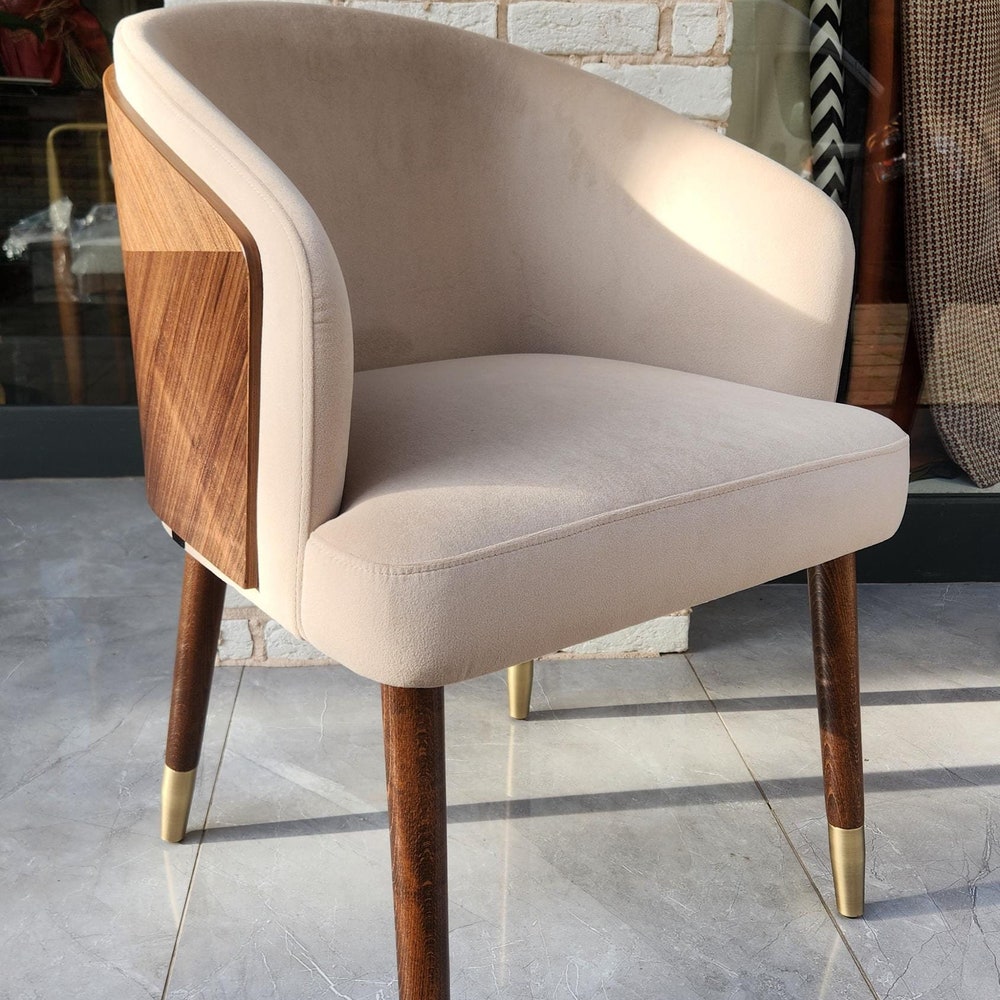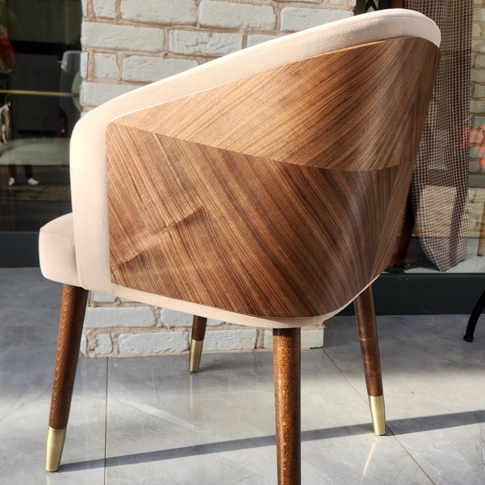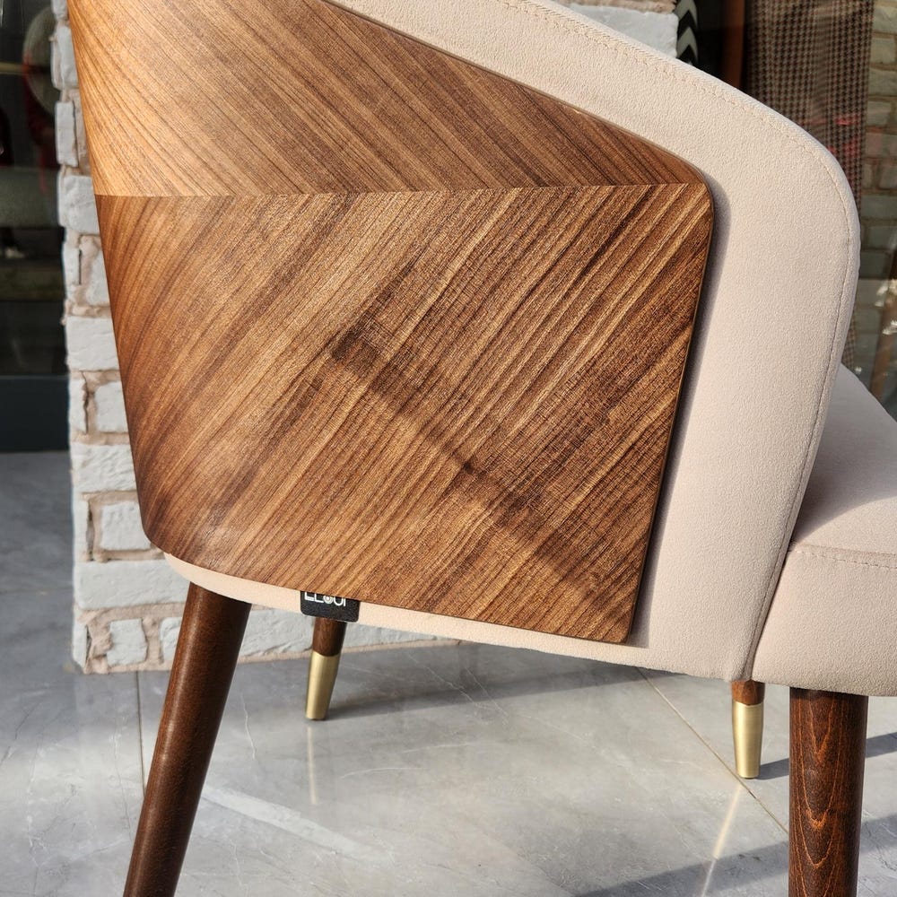 The seat and backrest are upholstered with a soft, textured fabric in a neutral beige tone, offering superior comfort for long meals or casual gatherings. The ergonomic design provides excellent back support, while the sleek, angled legs add a touch of mid-century modern charm.