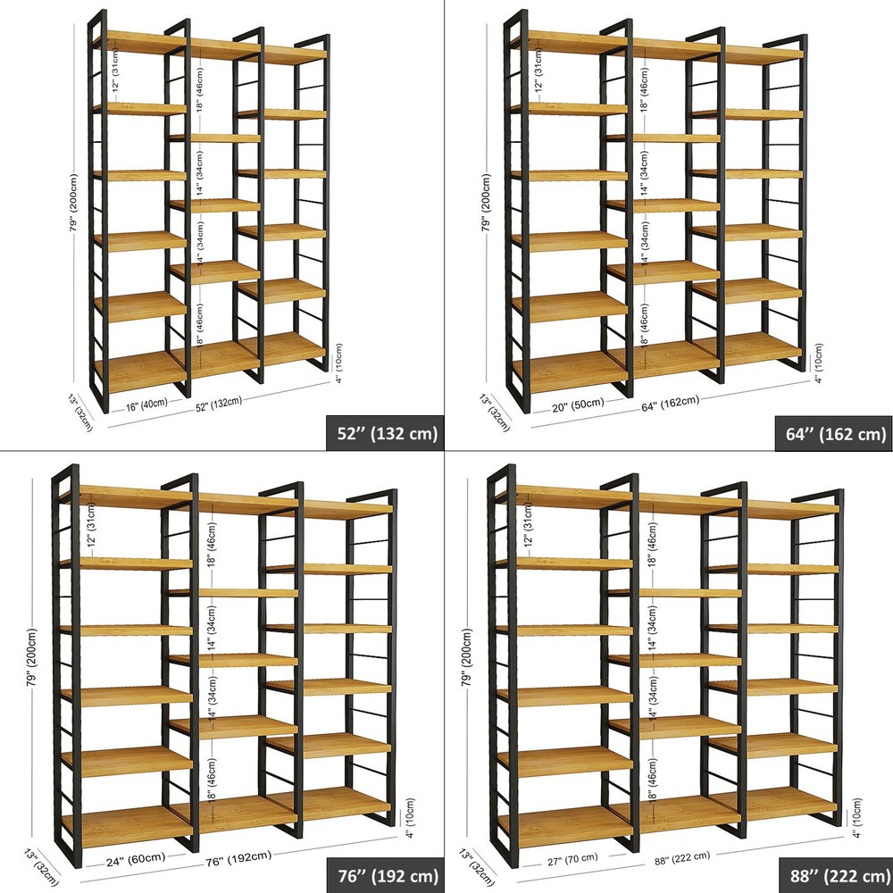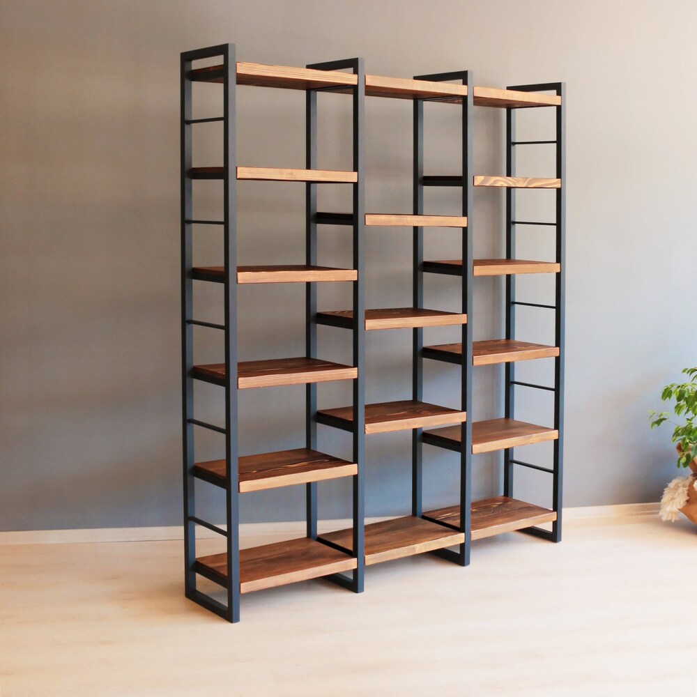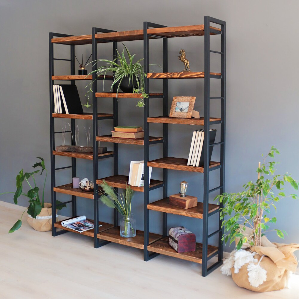 Modern Bookshelf and Shelving Unit , Solid Wood Bookcase with Metal Racks , Large Farmhouse Wall Unit