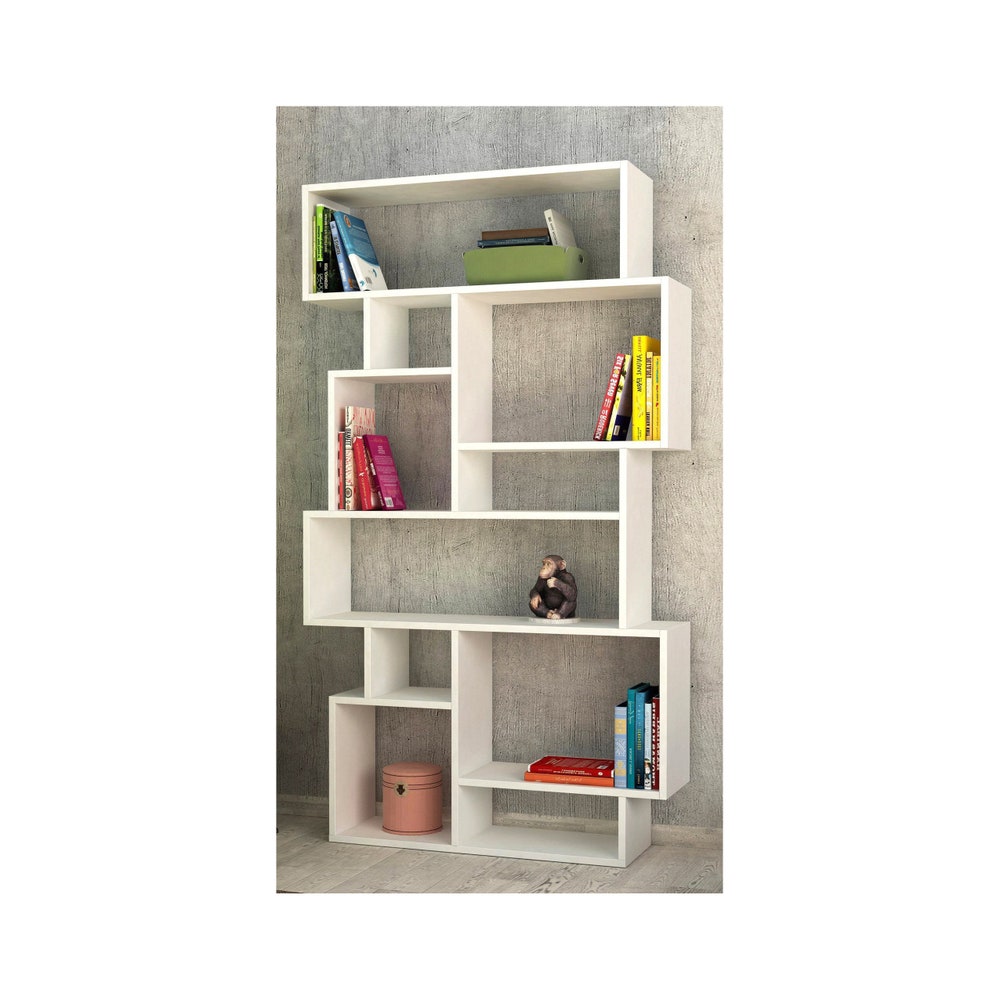 The asymmetrical design offers ten shelves, providing ample storage space for your favorite books, trinkets, and succulents.