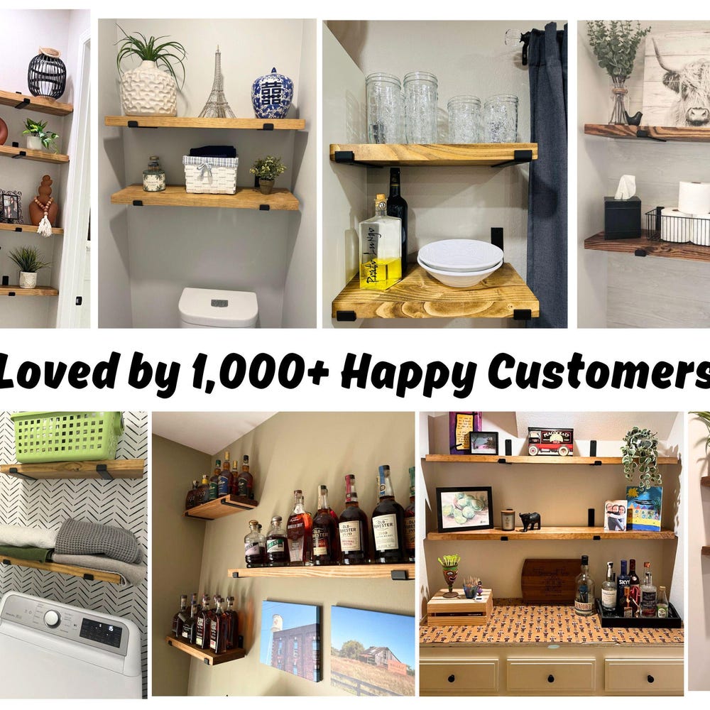 Built for both beauty and strength, our shelves are made from real, hand-selected wood. They’re approximately 1.45″ thick and can support up to 100 lbs per shelf when properly installed into wall studs. Universal wall anchors are also included, supporting up to 50 lbs per shelf.