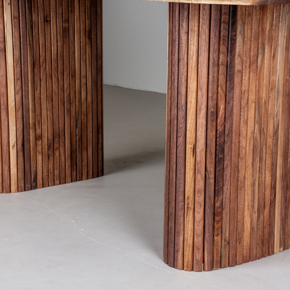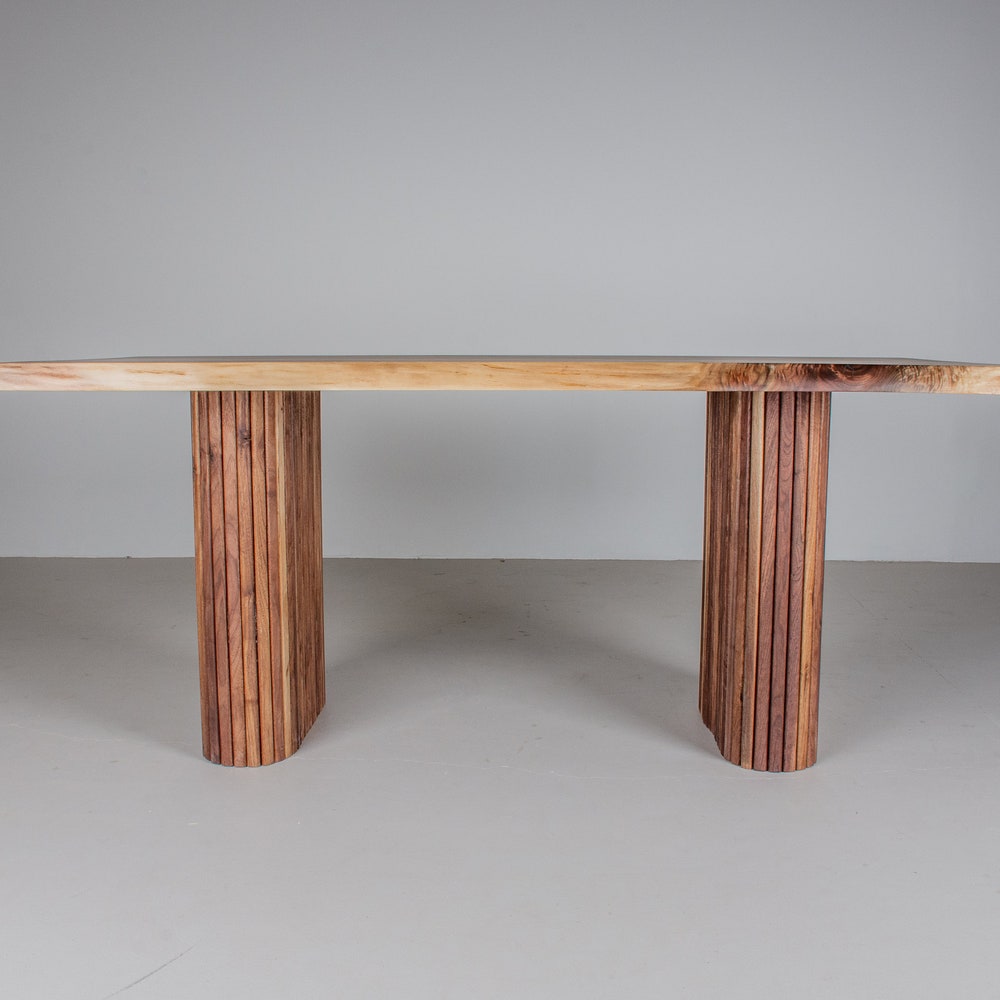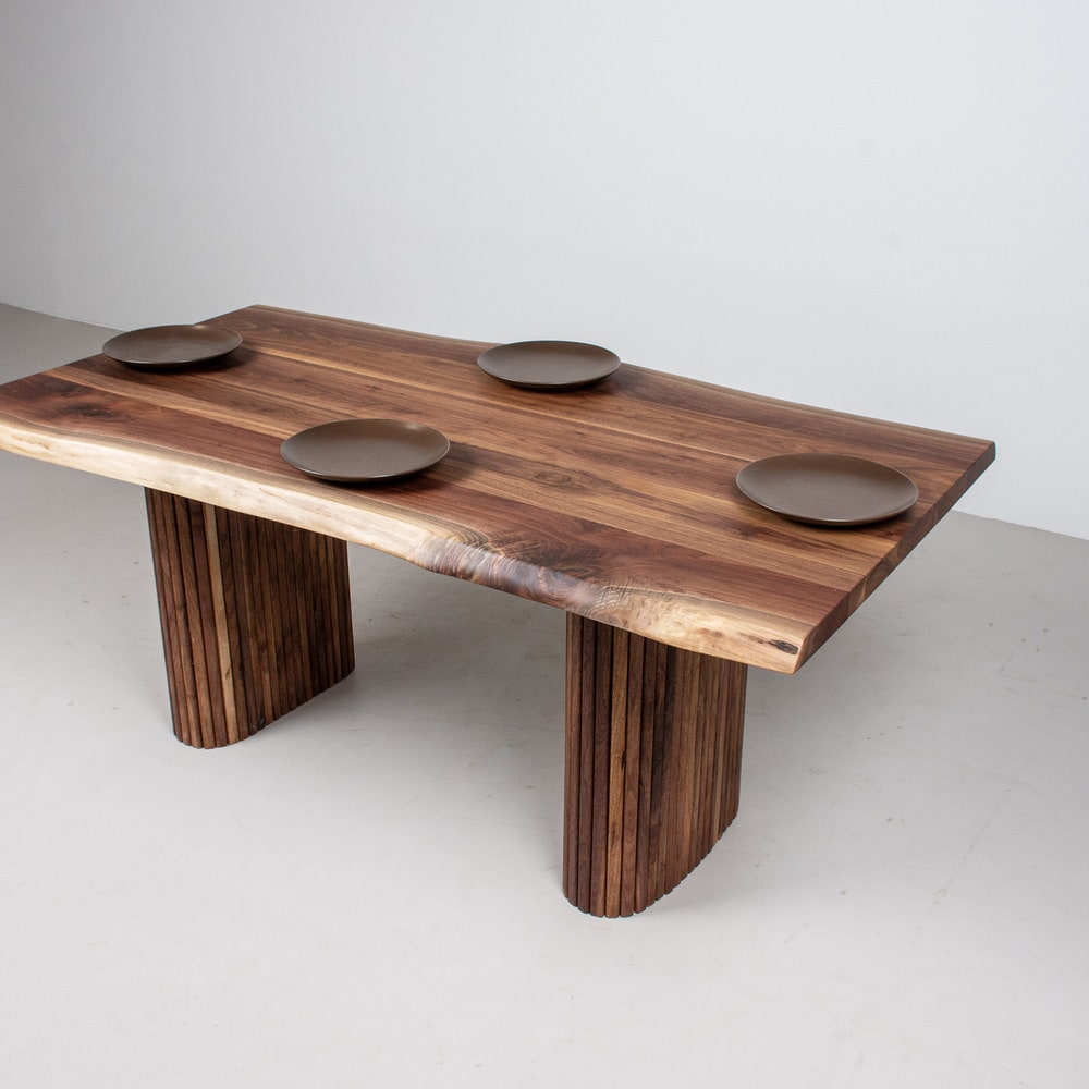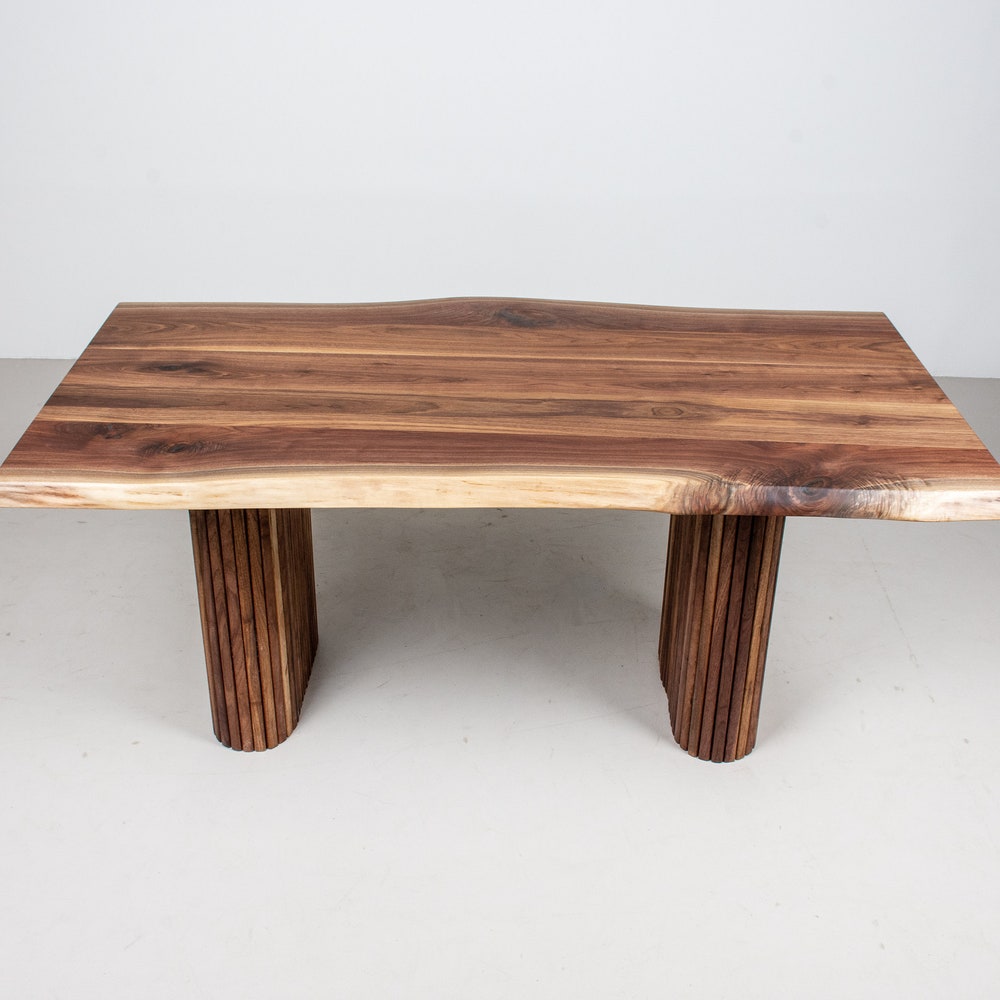 This classic live edge table gets a modern upgrade with this design. Typically live edge walnut is paired with steel legs; in this version however, it is paired with fluted walnut pillar legs. The result is an elegant modern live edge table. We build every table to order so there are many ways to make this table perfect for you.