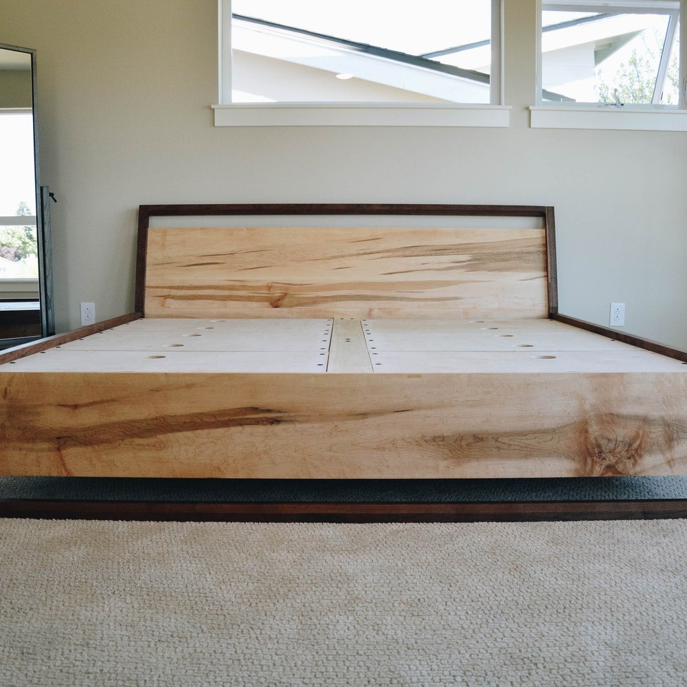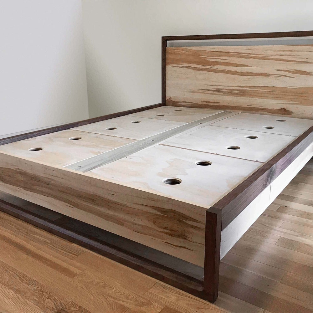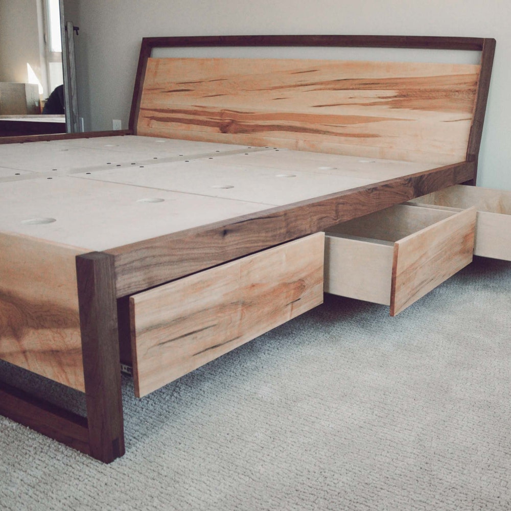 Modern Maple & Walnut Platform Bed with Storage, Bed with drawers, Underbed drawers, Queen bed, King Bed, Headboard with storage
