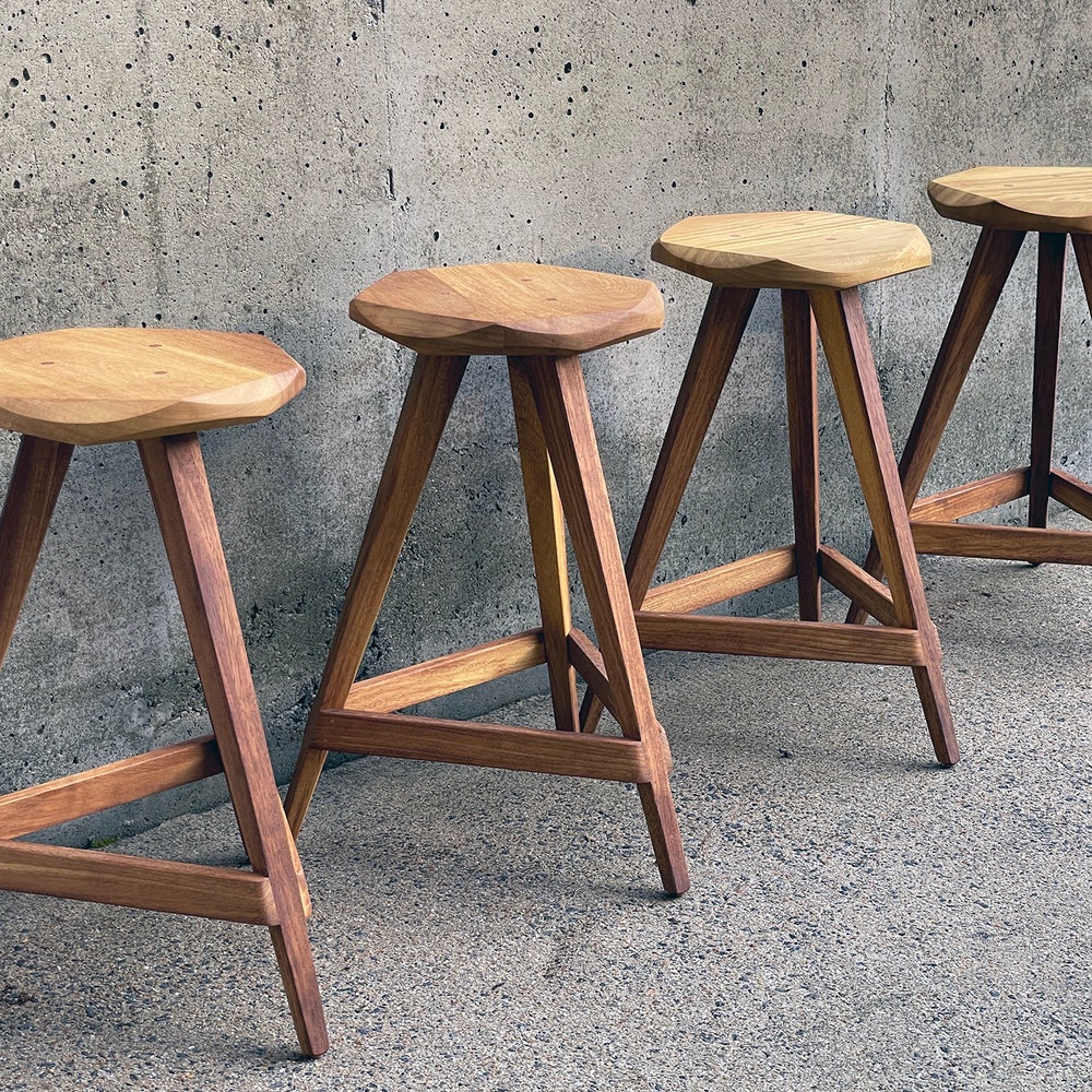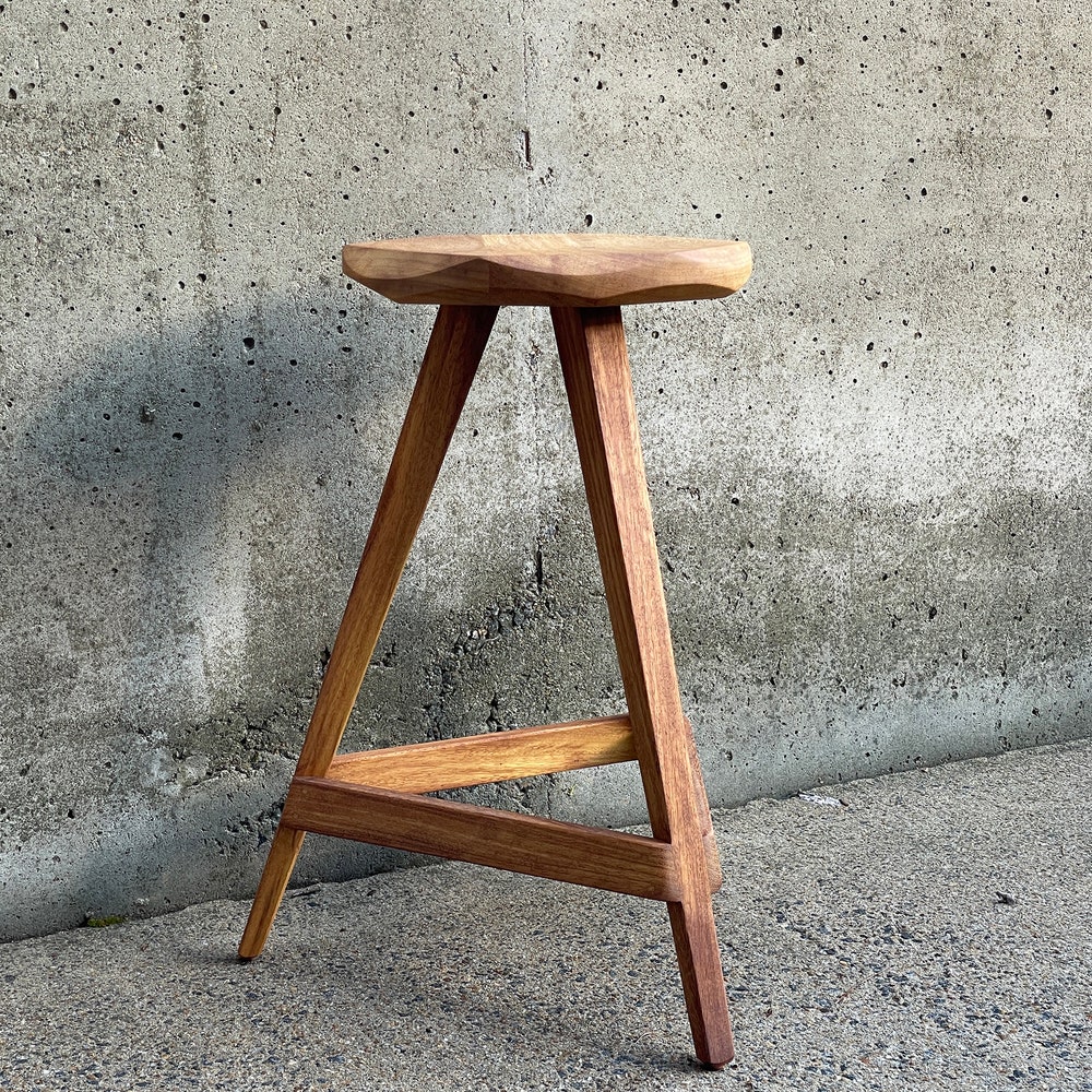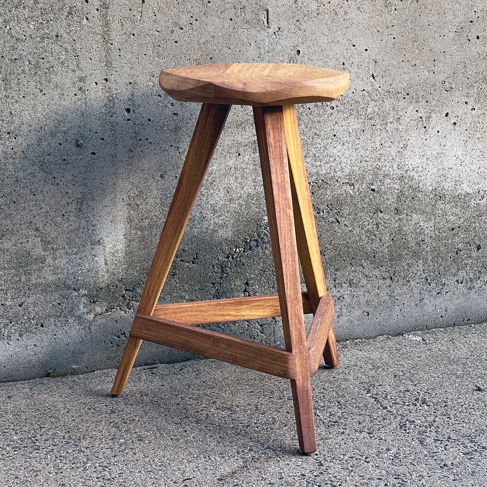 Contemporary tripod stool with hand-hewn seat and legs. Each seat is hand-carved producing unique facets on edges which provide a comfort and a clean contemporary look. Seat diameter shown is 13″ and is ideal for smaller counter spaces where the stool may need to be tucked under the counter. These are offered in grade-A teak or mahogany and are ideal for outdoor use. Nylon glides are fastened to each leg.