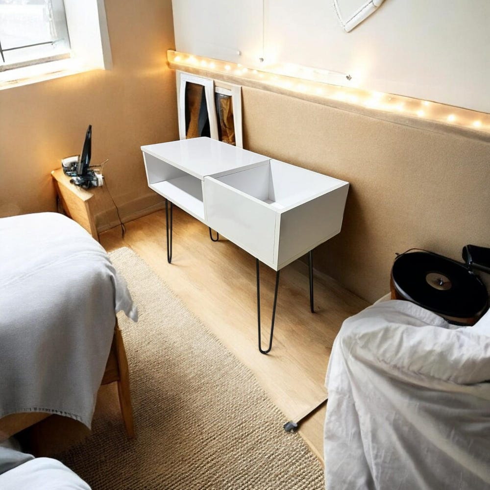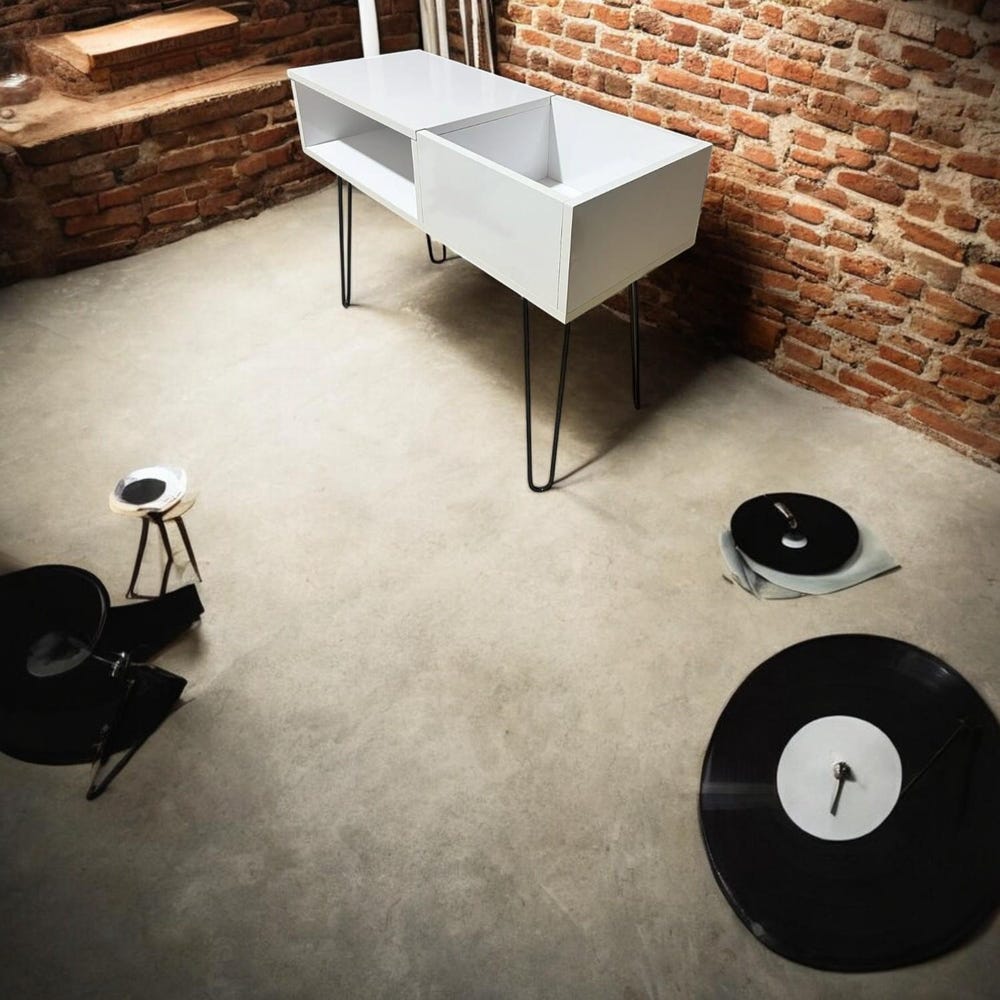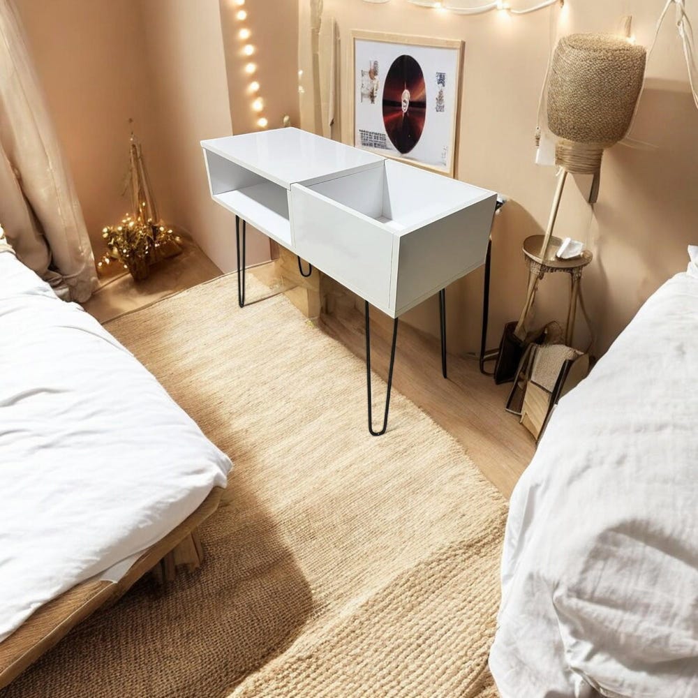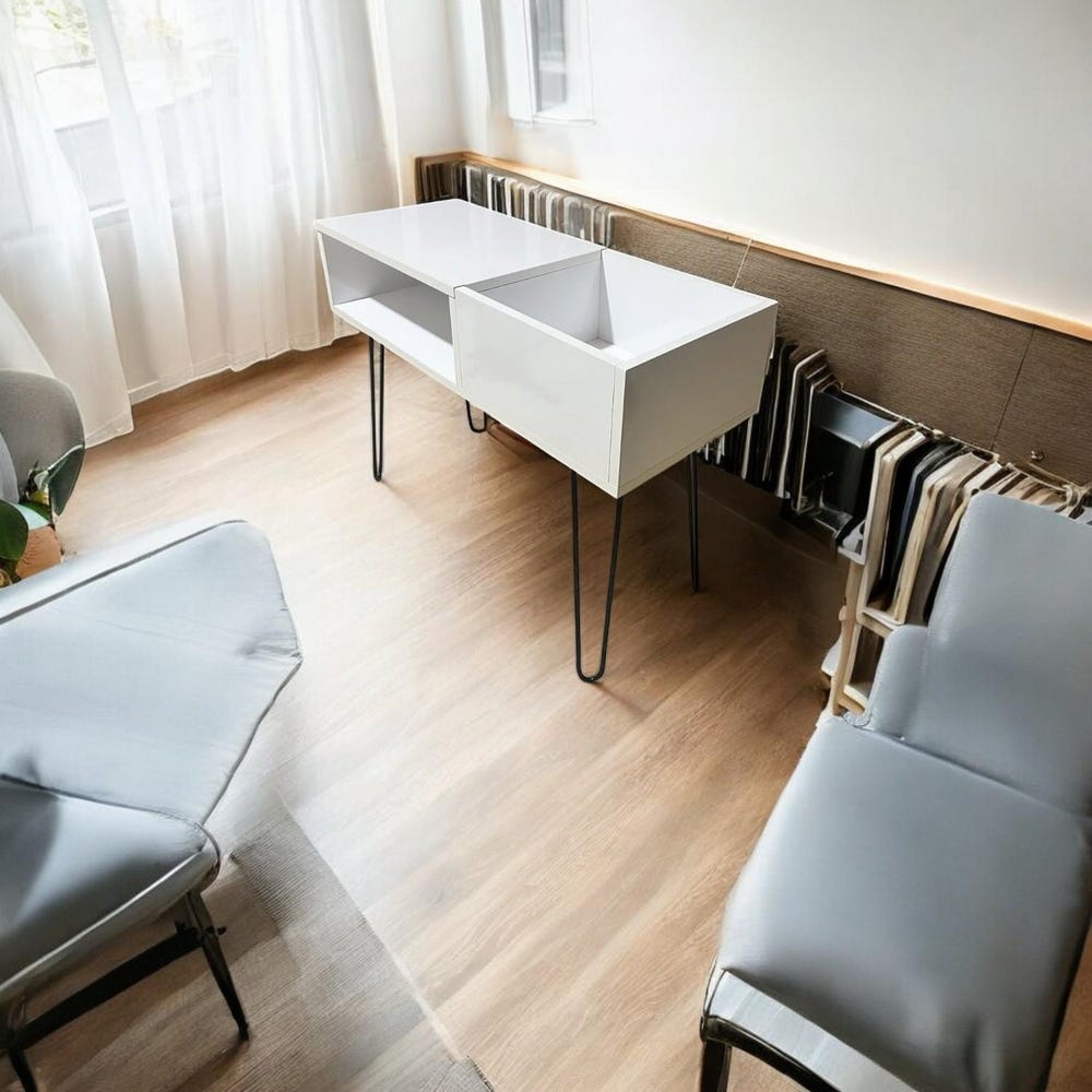 This modern record player stand with storage is the perfect centerpiece for music enthusiasts who value both design and functionality. Handcrafted with durable MDF and sleek black metal hairpin legs, this stand supports your turntable with style.