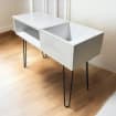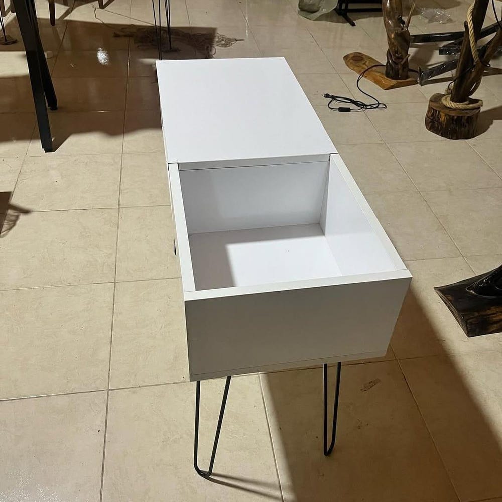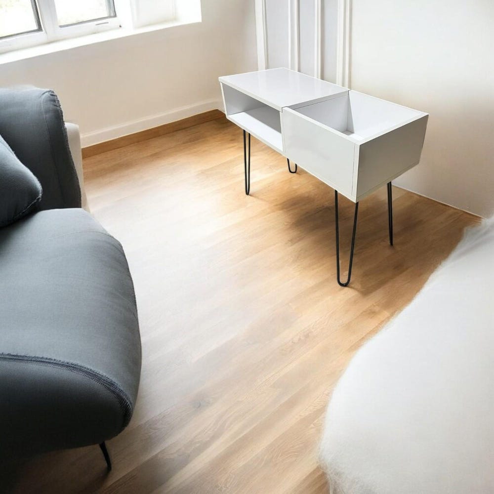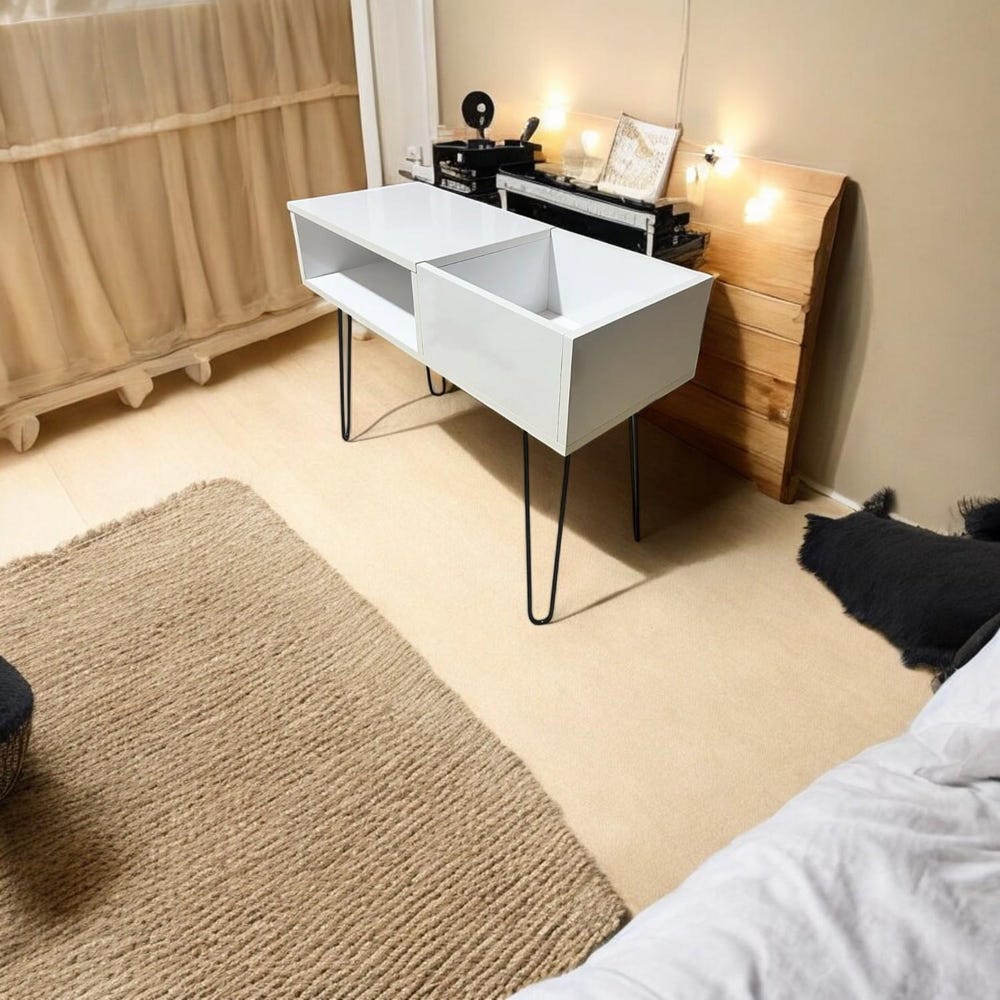 This modern record player stand with storage is the perfect centerpiece for music enthusiasts who value both design and functionality. Handcrafted with durable MDF and sleek black metal hairpin legs, this stand supports your turntable with style.