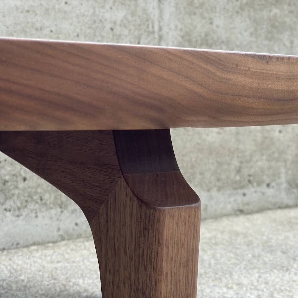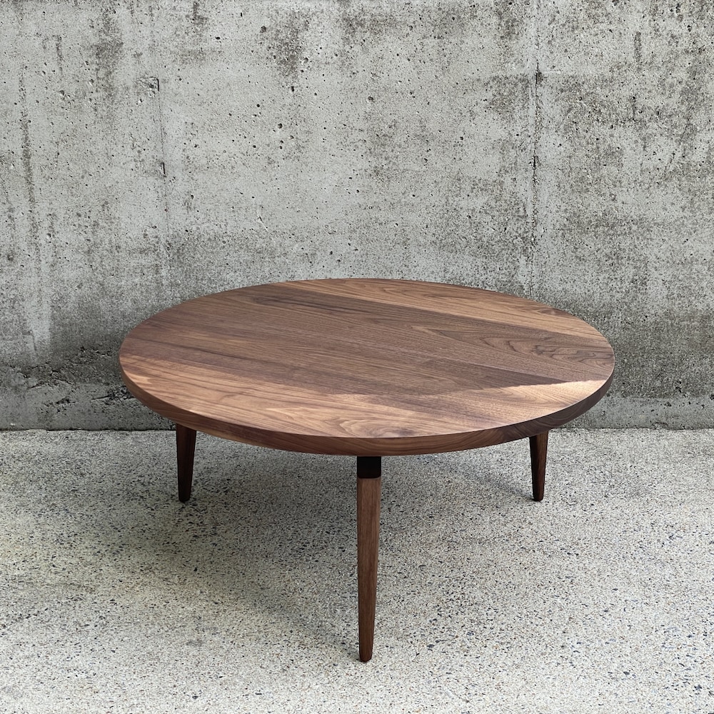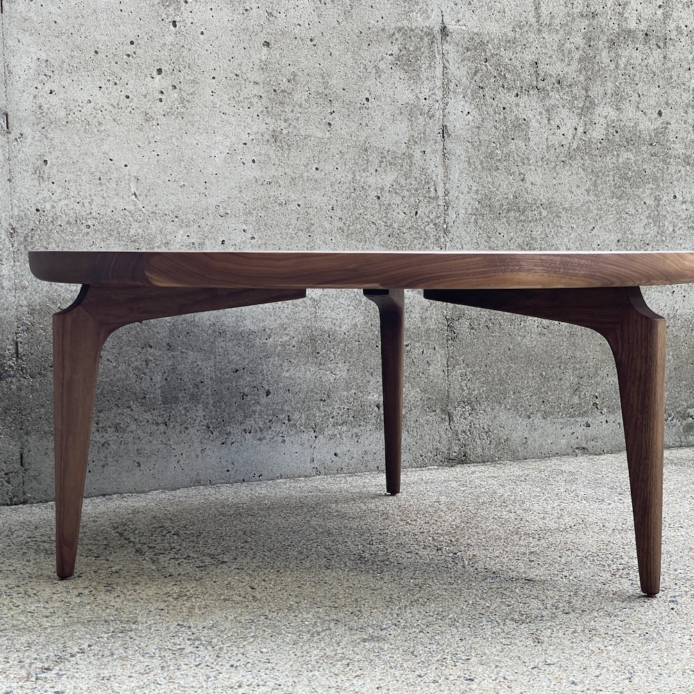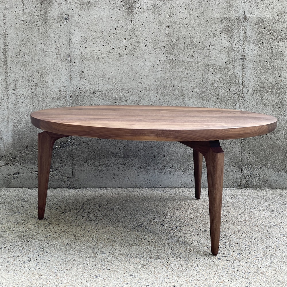 Simple, sculptural, and modern – this round coffee table sits on three sculpted legs, joined using mortise and tenon. The top is composed of 1.5″ thick solid walnut. Finished with Osmo PolyX hard wax/oil.