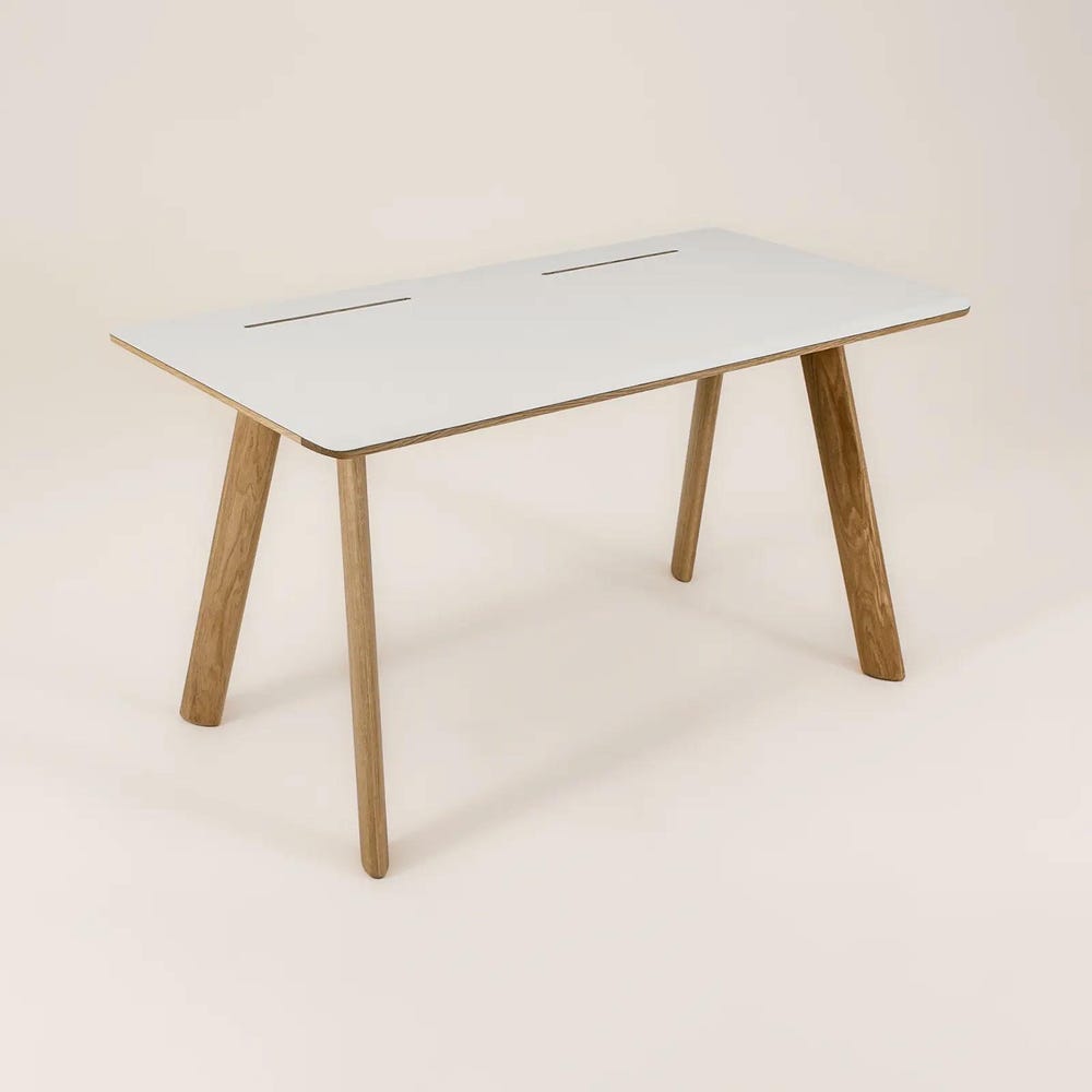 Linoleum Edition: A contemporary, special option featuring a luxurious matte linoleum finish for modern aesthetic. The linoleum is laminated onto the desktop, constructed with a solid oak edge-lipping and a durable engineered wood core. The legs are crafted from solid oak, ensuring a harmonious blend of strength and elegance.