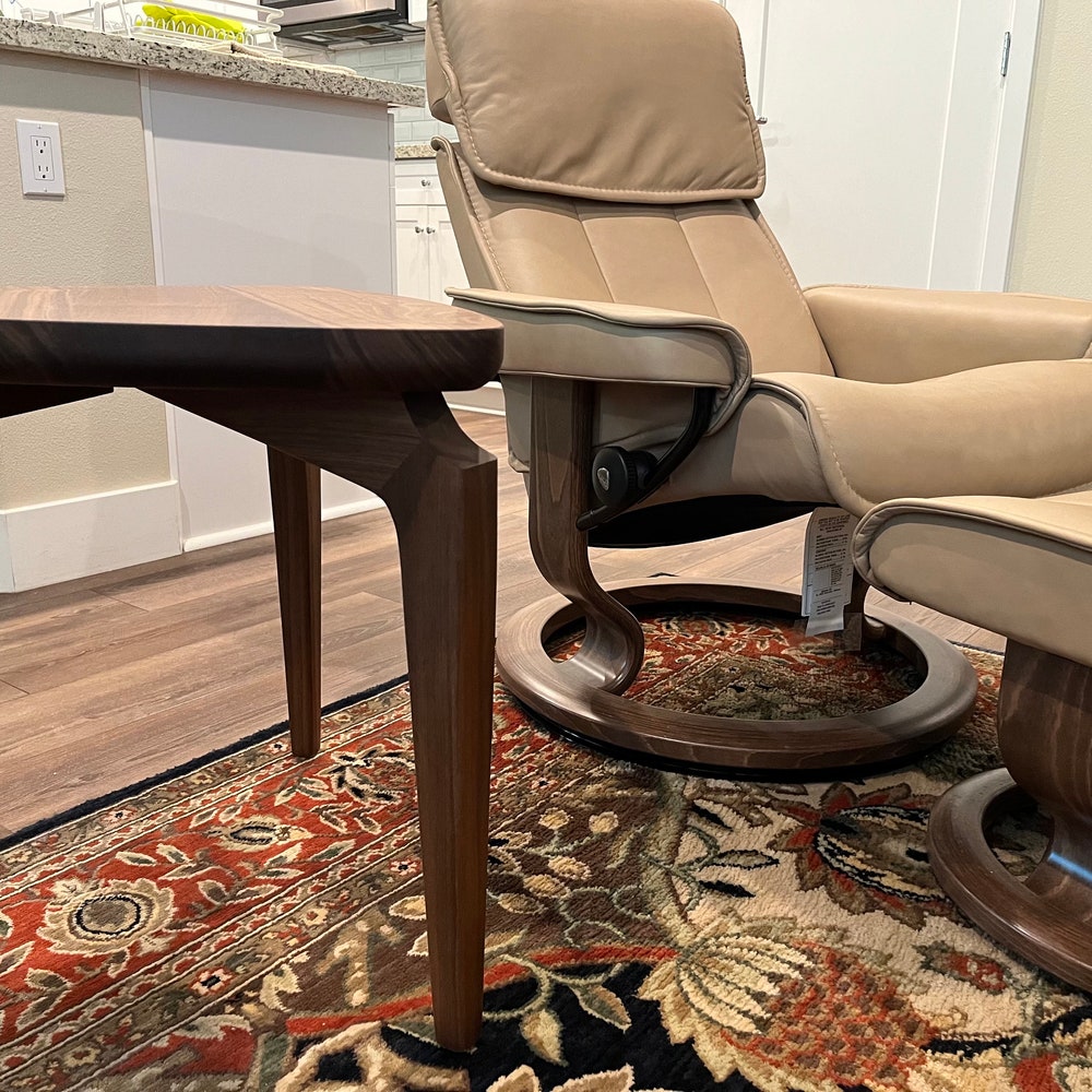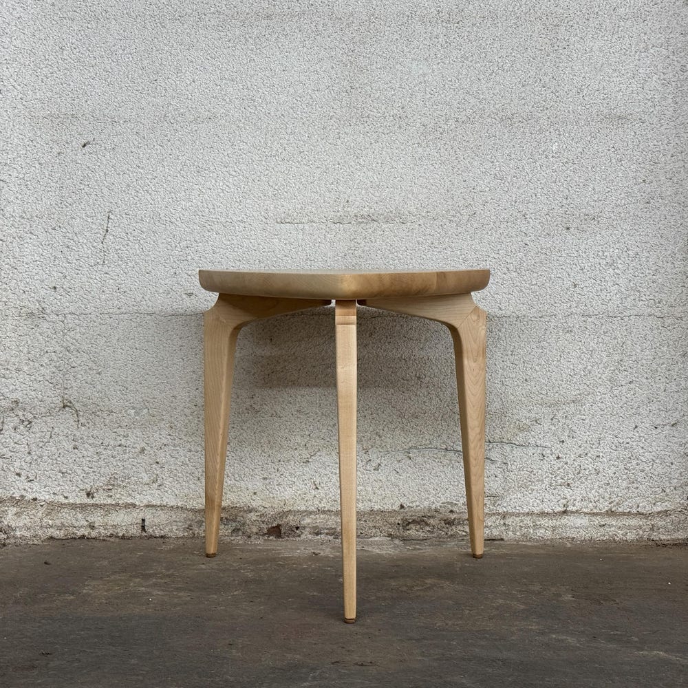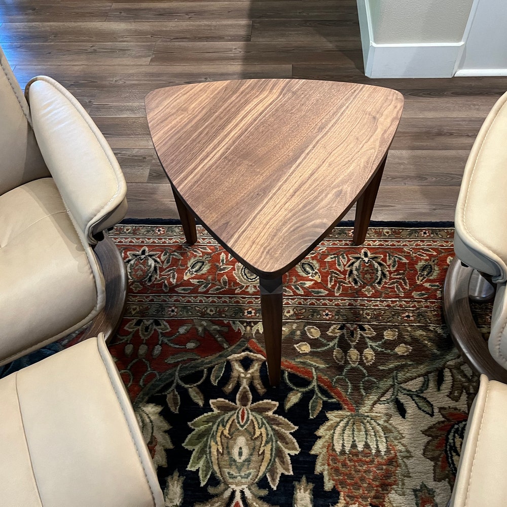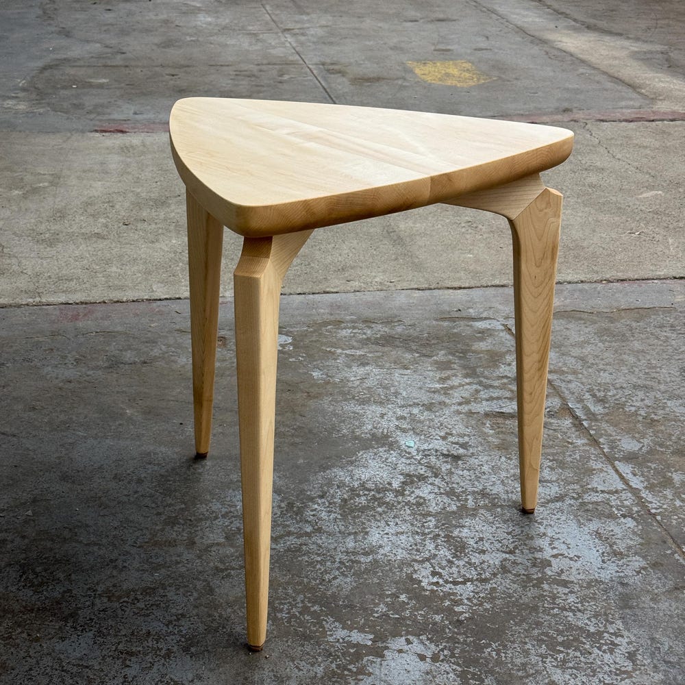Modern triangular side table with three hand-sculpted legs. Top has a generous roundover on lower edge, revealing the flowing curves of the sculpted legs below. Available in a variety of sizes and finishes.