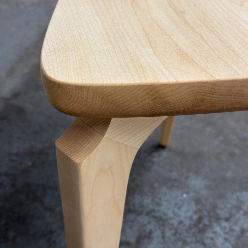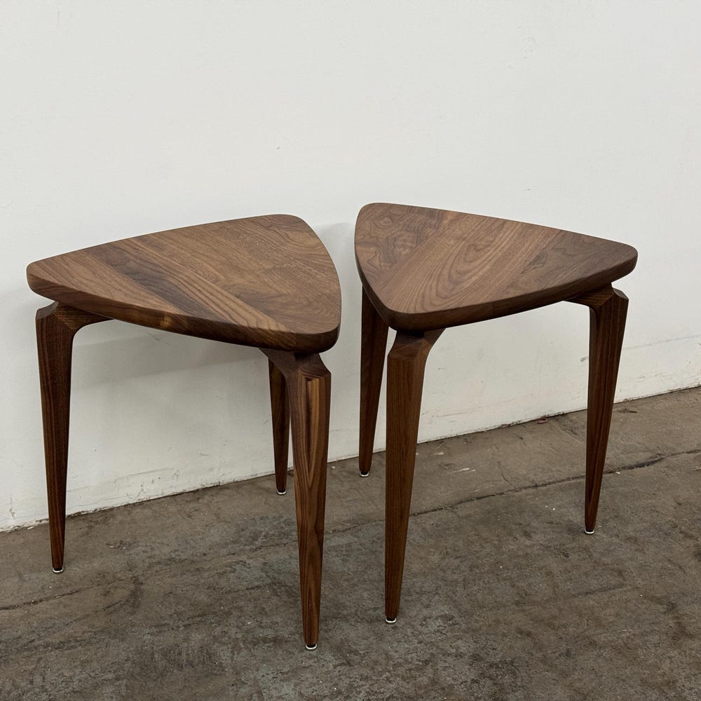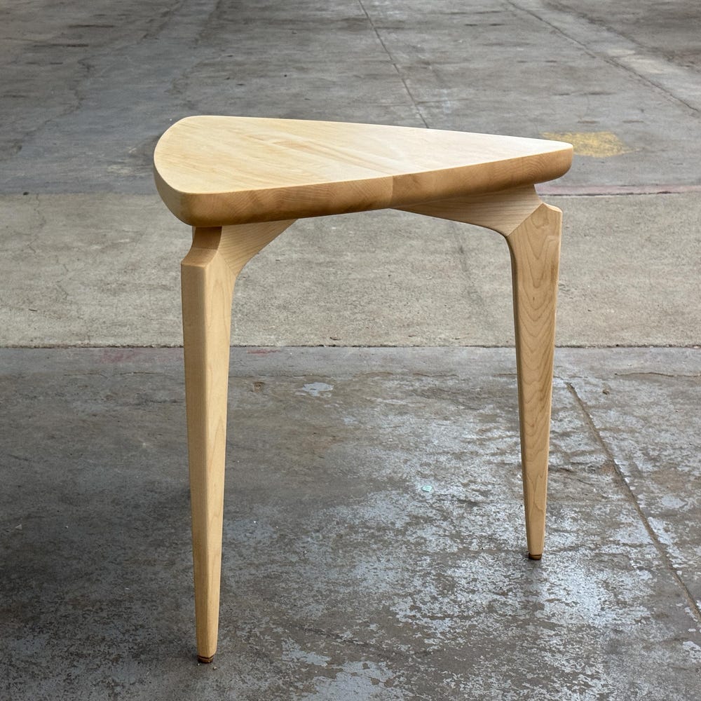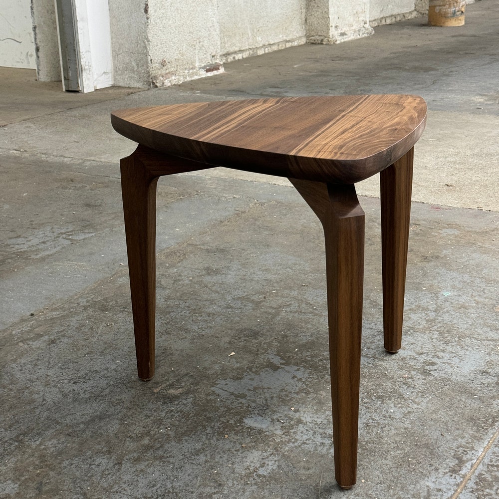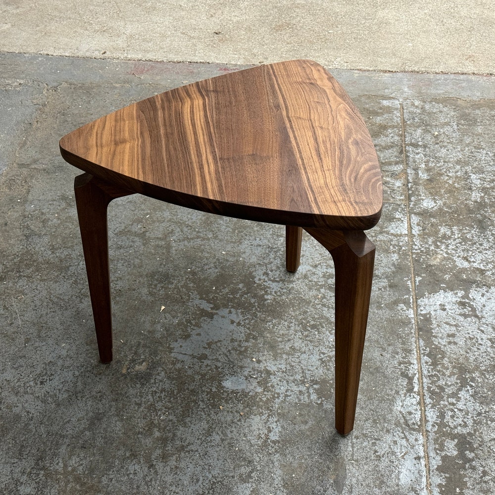 Modern triangular side table with three hand-sculpted legs. Top has a generous roundover on lower edge, revealing the flowing curves of the sculpted legs below. Available in a variety of sizes and finishes. Ships fully assembled.Made in Portland, OR. https://www.etsy.com/shop/MarcoBogazziStore