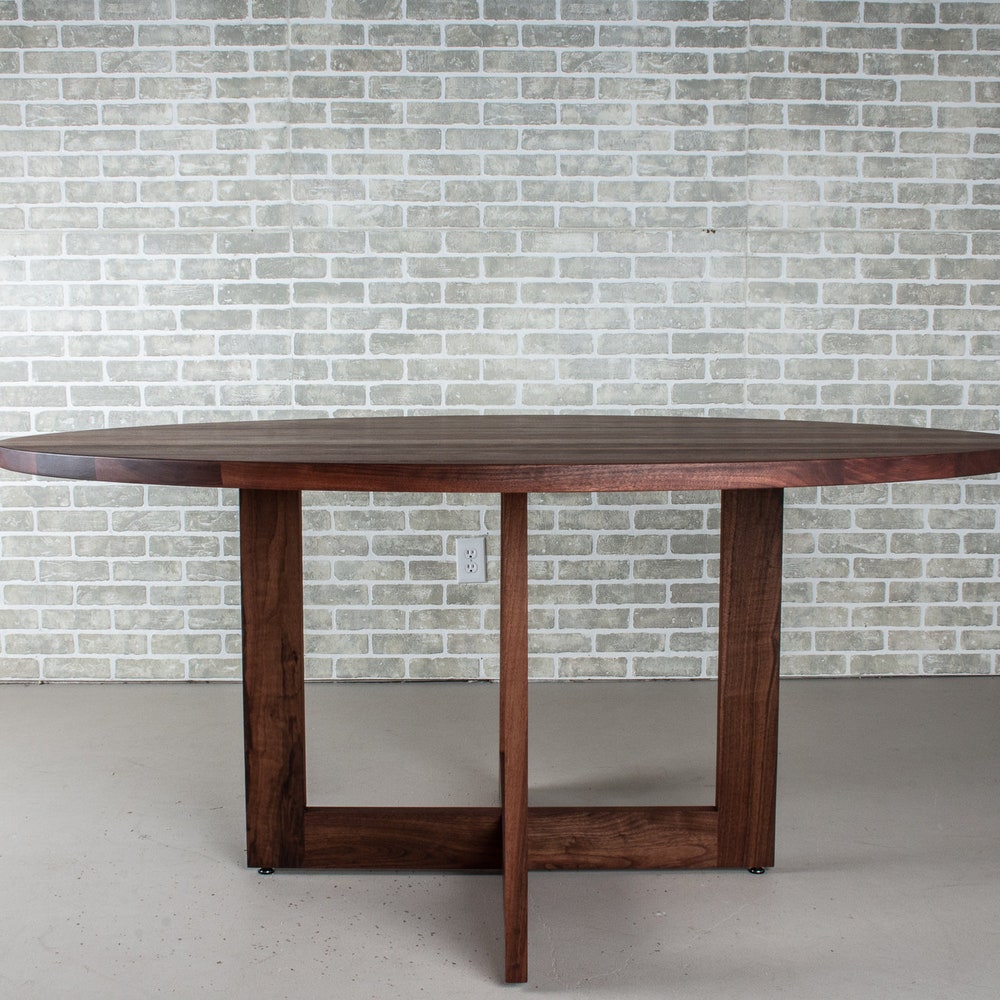 Bring family and friends together around a modern walnut table like this one. A round table lets everyone see each other and the pedestal base makes it easy to seat people. The cross style base is visually light, giving the table a modern feel. We build every table to order so there are many ways to make this table perfect for you.