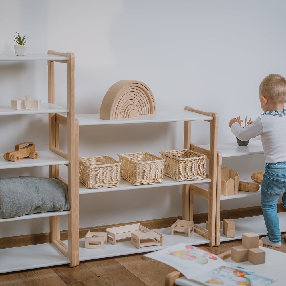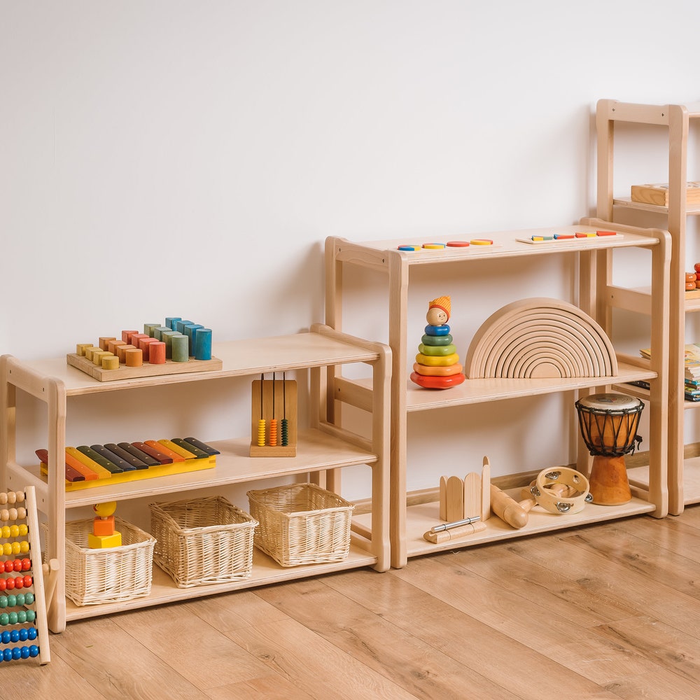 Discover the perfect harmony between organization and exploration with the Woodjoy Montessori MINI Shelf—a versatile addition to your child’s environment. The Montessori MINI Shelf features low, open shelves thoughtfully arranged across three levels. This design is tailored for storing toys and books, while also providing ample space for larger toys and accessories that encourage your child’s development. The open design of the Montessori MINI Shelf encourages independent exploration and organization, aligning with the Montessori philosophy of self-directed learning. Watch as your child discovers and engages with their toys and books, fostering a sense of autonomy and creativity.