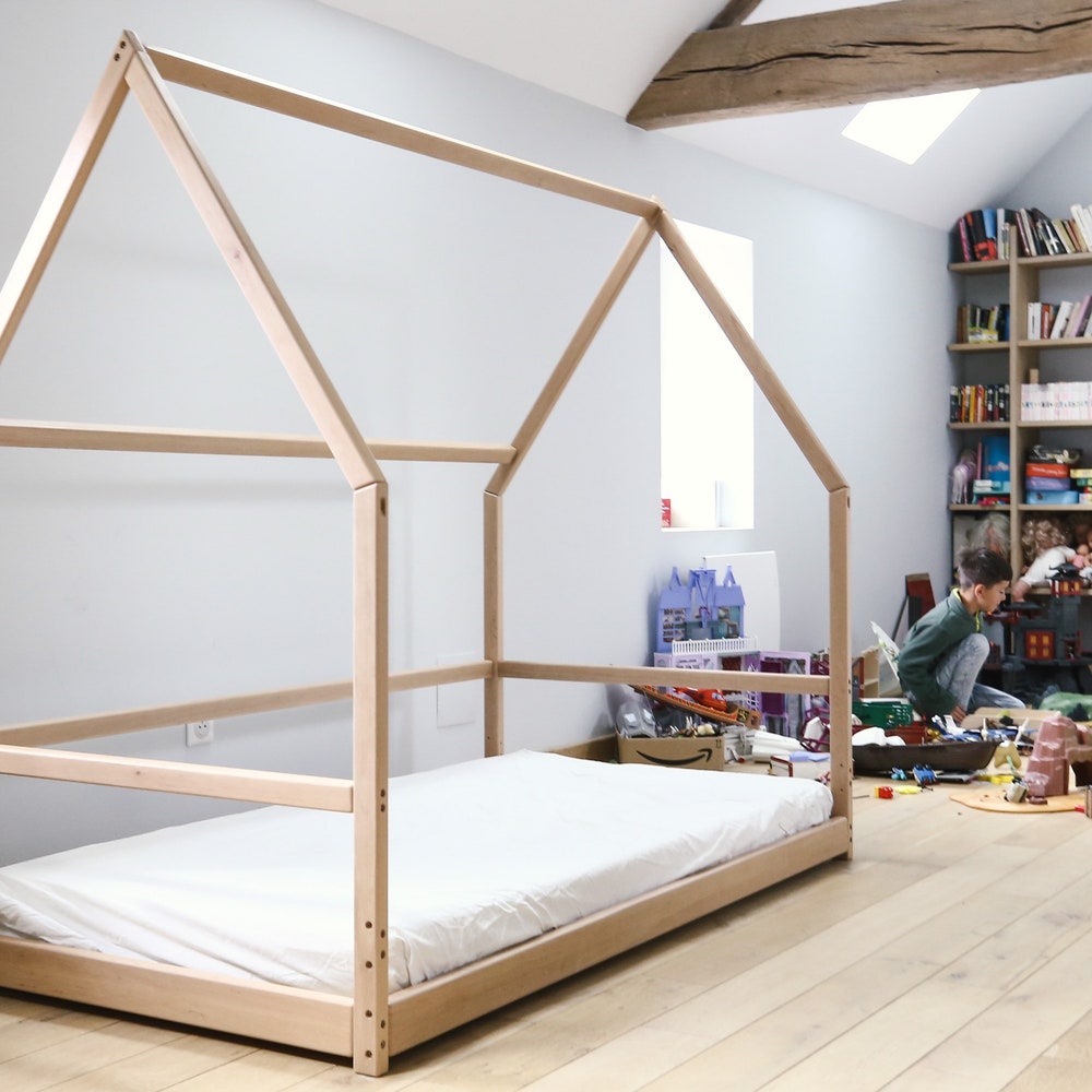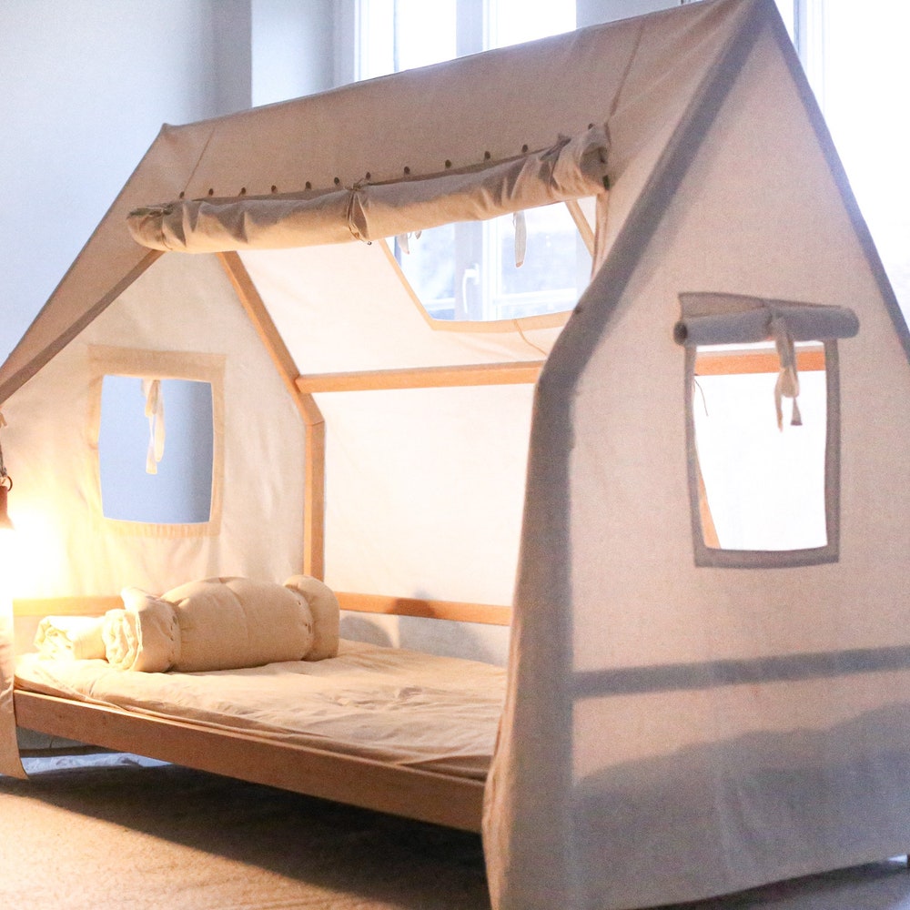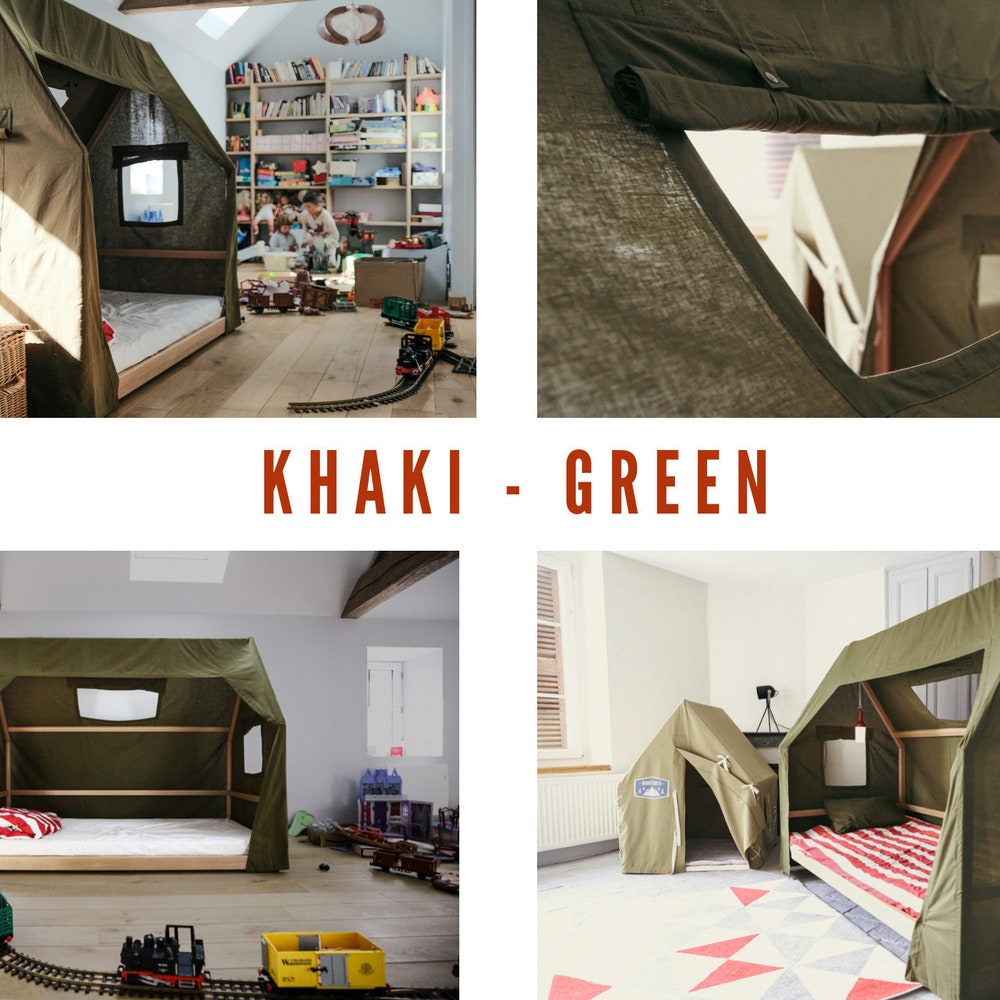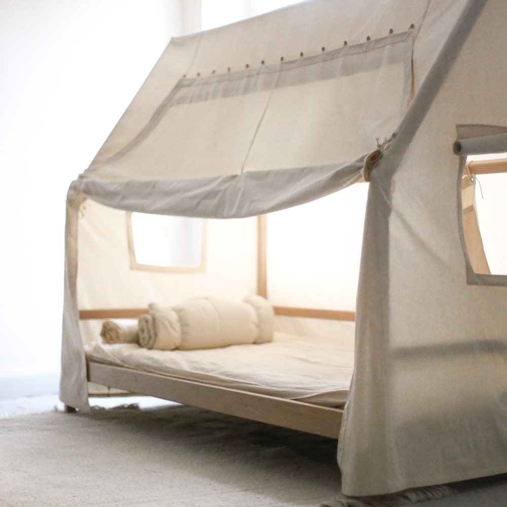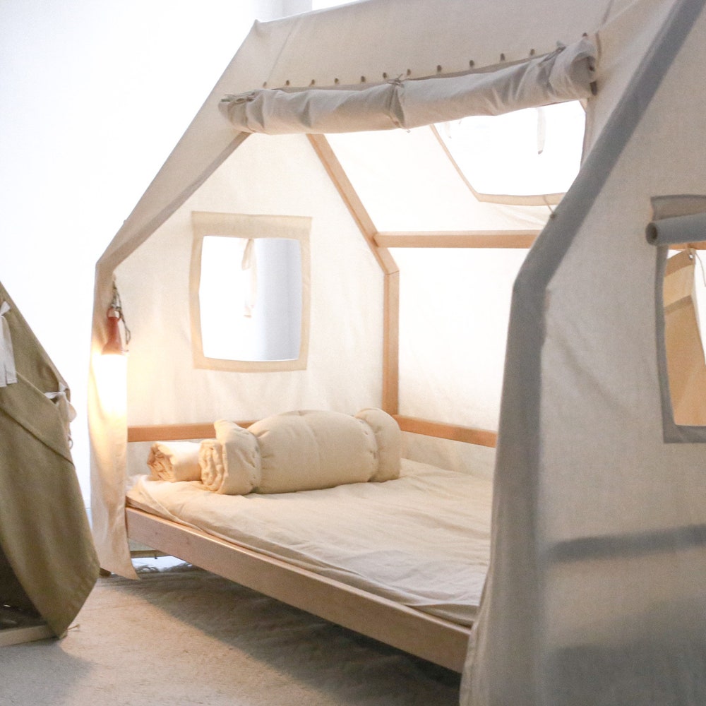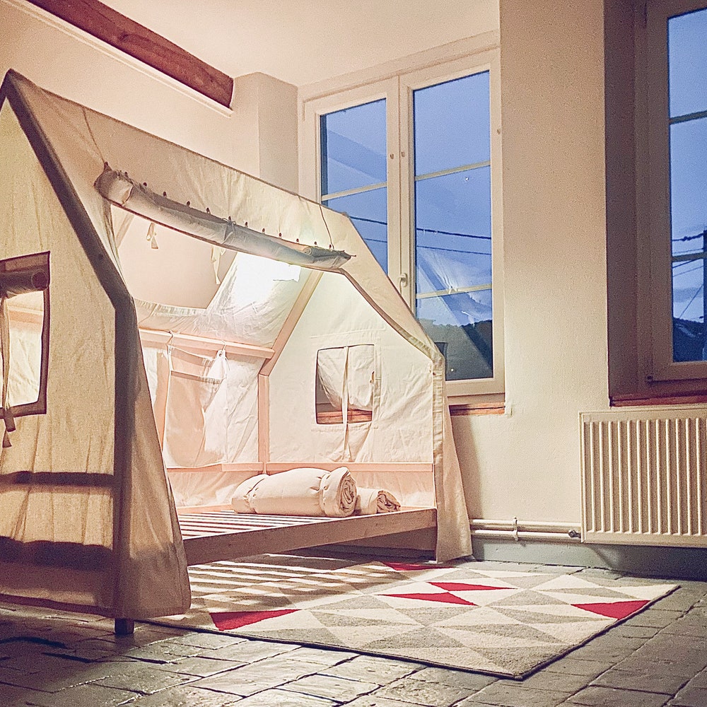 We have long wanted to combine a Montessori Bed House with ours Adventure playhouse. Now we are happy to present the brand new Floor bed with Canopy premium 100% cotton fabric.