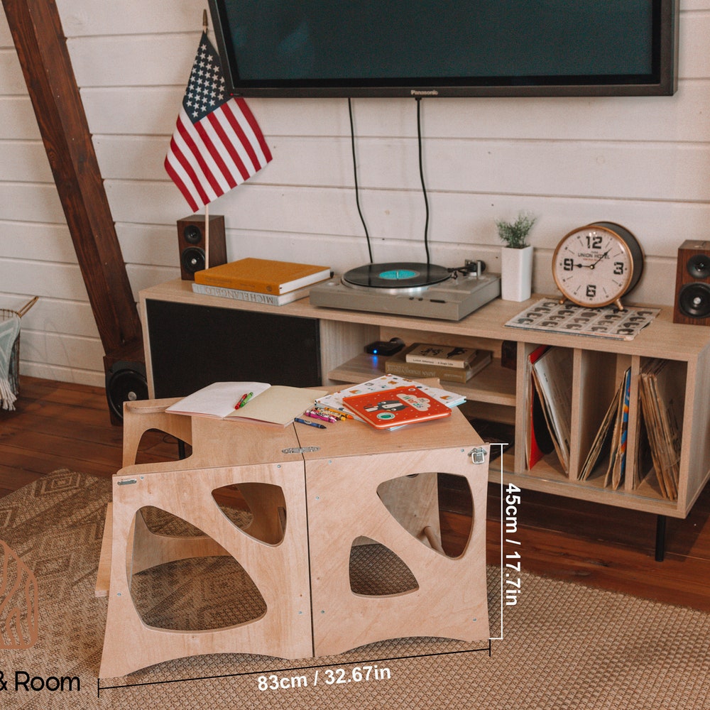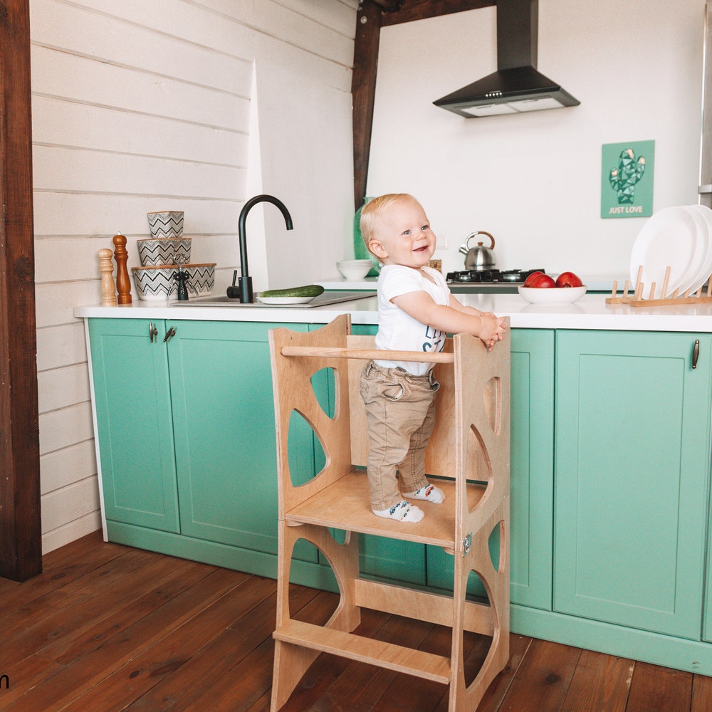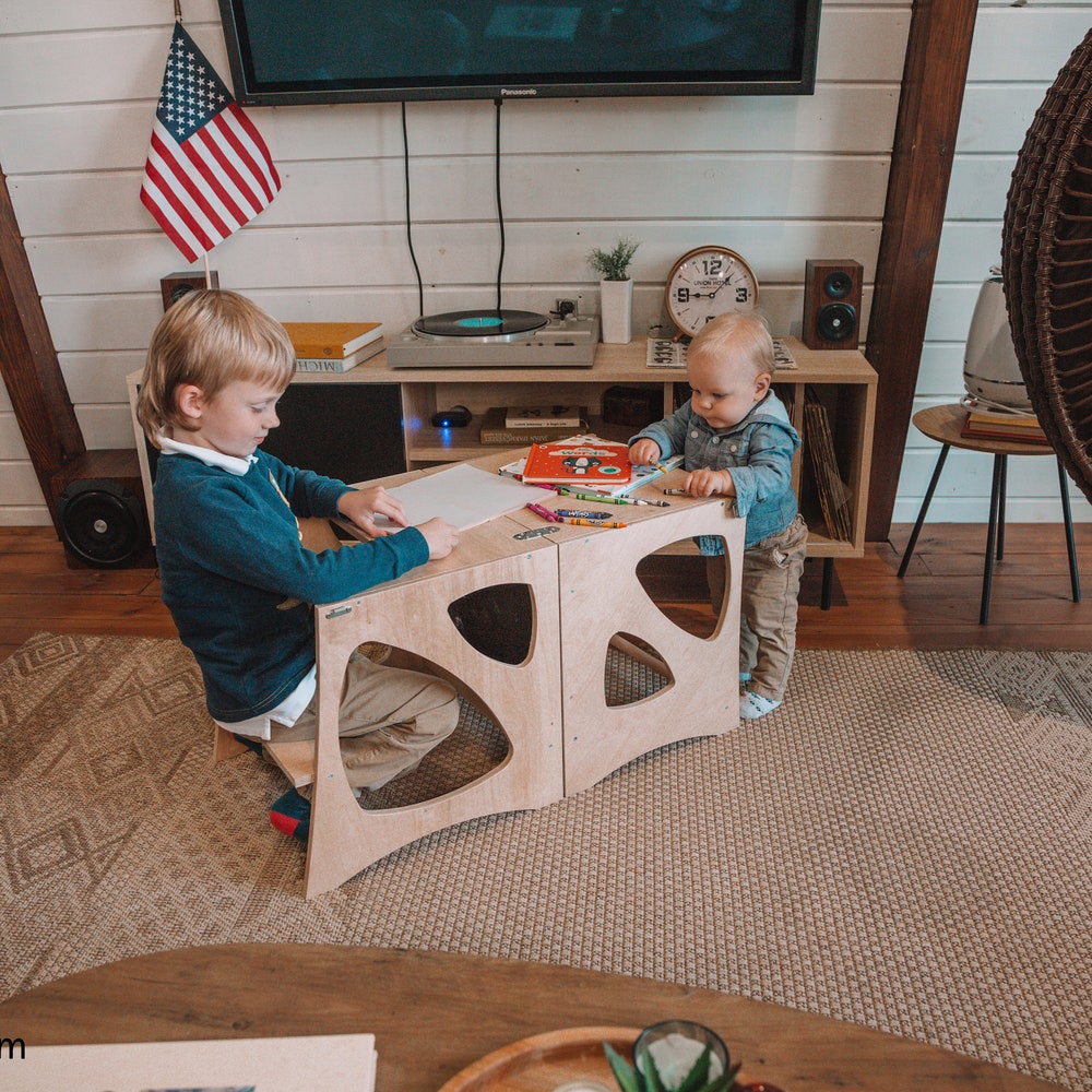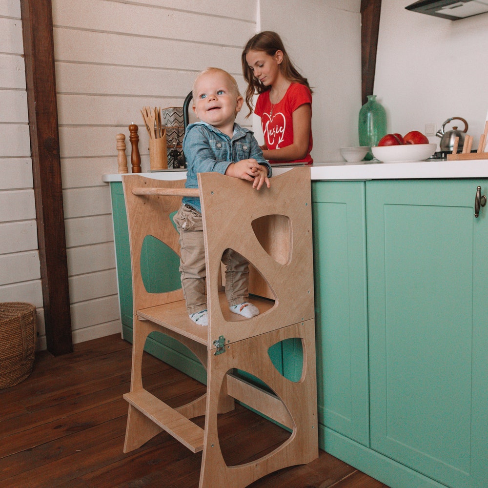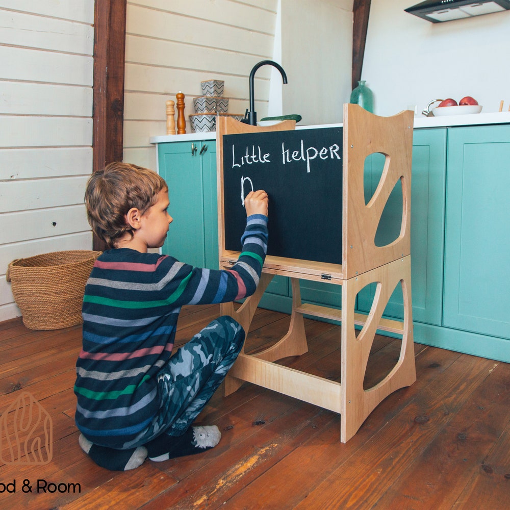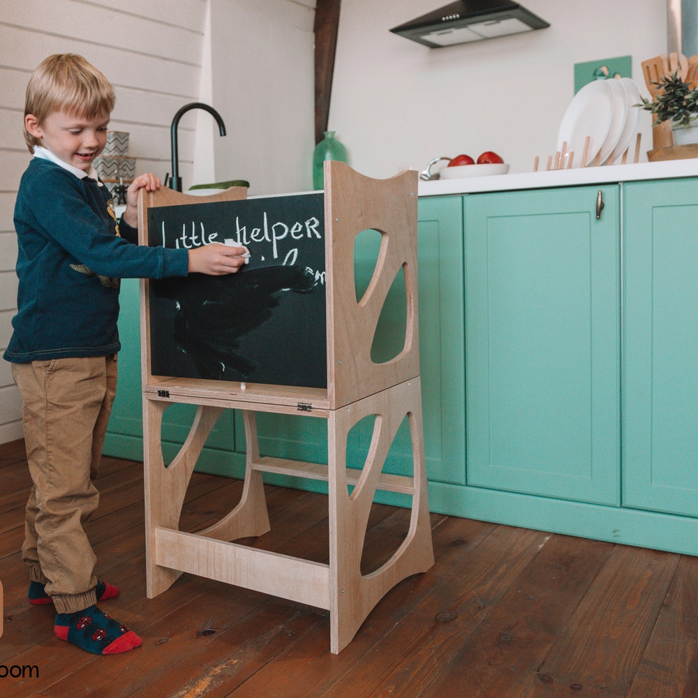 A helper tower, so your child can reach the kitchen counter or tabletops, can easily be transformed into a little chair with a table for play, drawings and other activities.