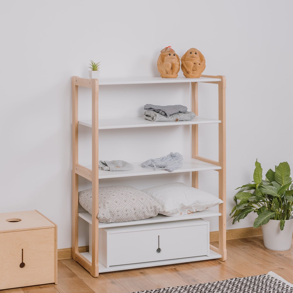 Our Montessori MAXI+ Shelf, designed with dimensions that match the MAXI Shelf but offer additional width, introduces extra storage possibilities. In contrast, the Montessori MAXI Shelf is tailored to be taller and slenderer. Both shelves have open shelving, arranged across five levels, creating the perfect organizational space for toys and books. This design encourages a tidy, clutter-free, and engaging environment that supports your child’s development.