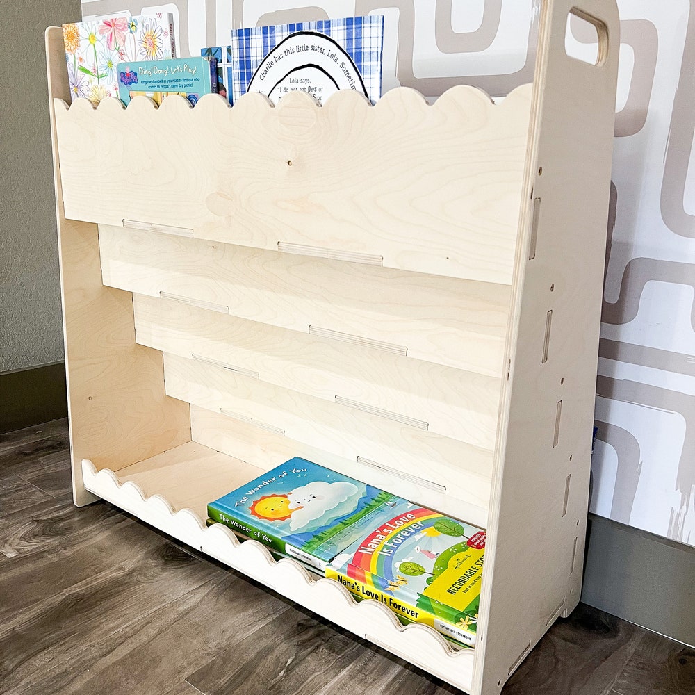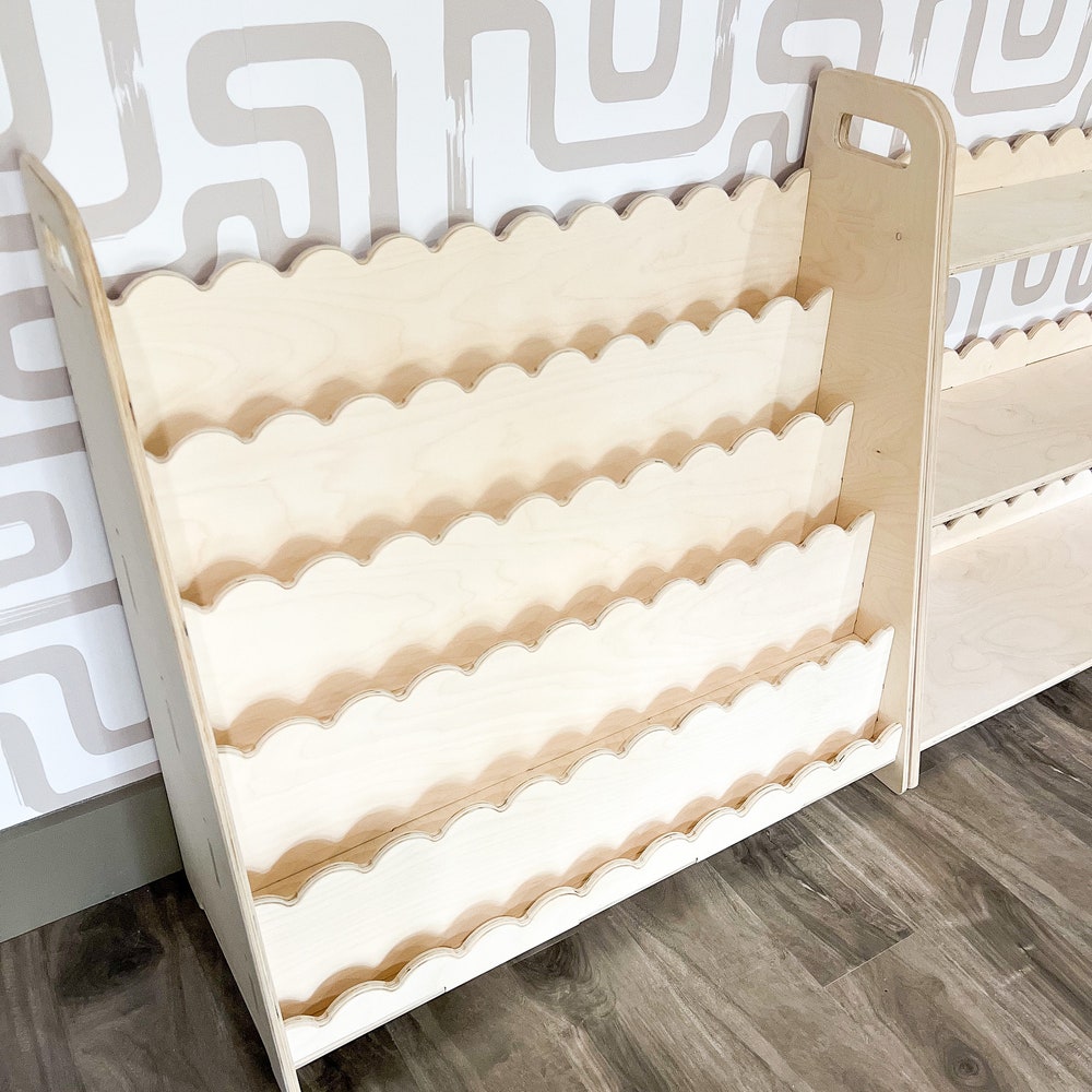 Scalloped Montessori Toy Shelf and Bookshelf. Bookshelf has hidden back storage! Side Panels Double as Handles!
