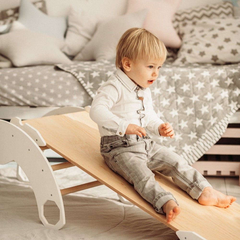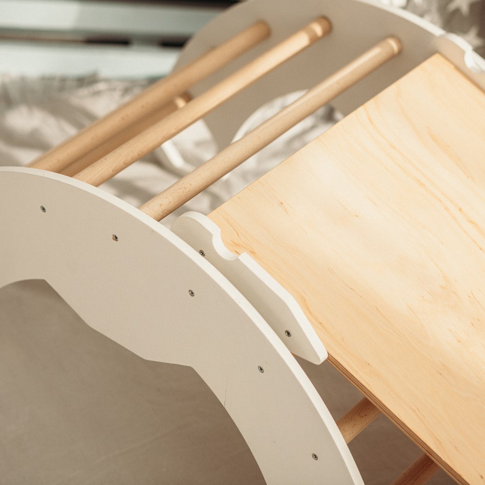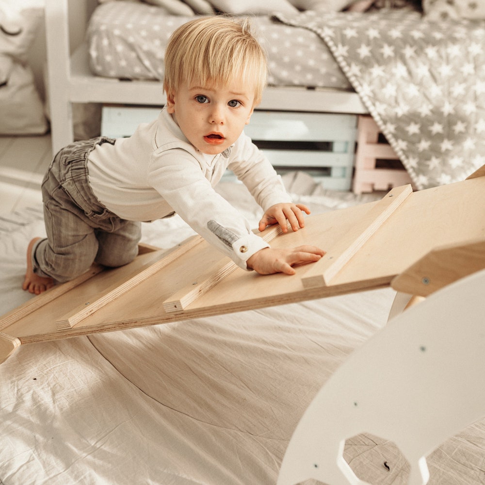 ONE Climbing Ramp in color WHITE + NATURAL WOOD – ladder/slide or climbing rocks/slide