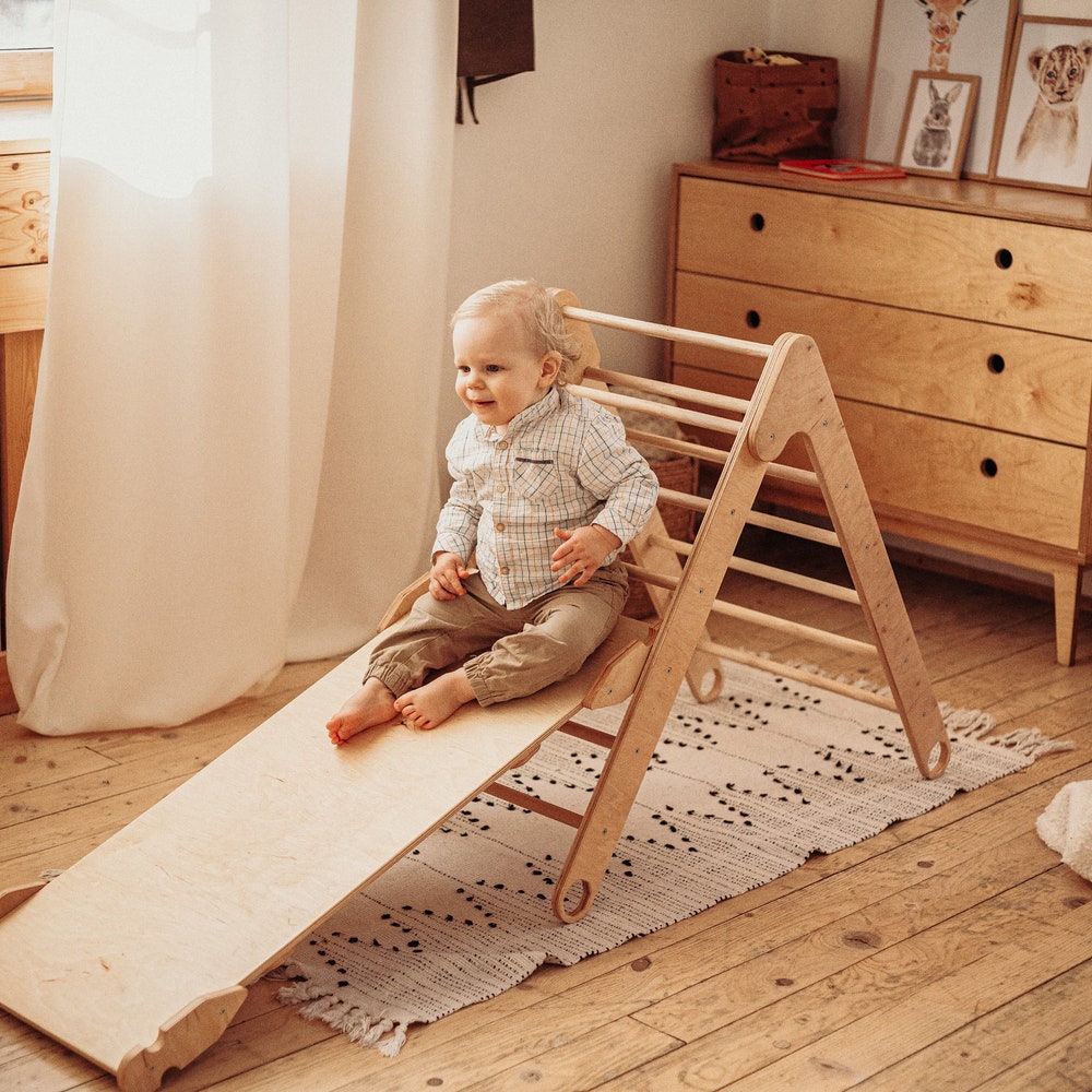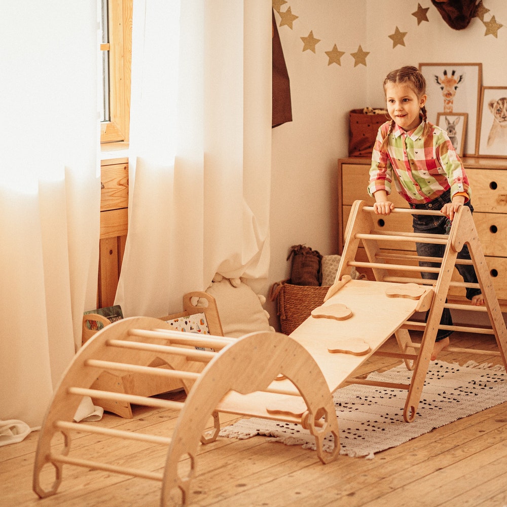 Montessori Set of three items – Climbing Arch + Foldable Triangle + Climbing ladder/slide, Wooden gym dreieck Montessori furniture