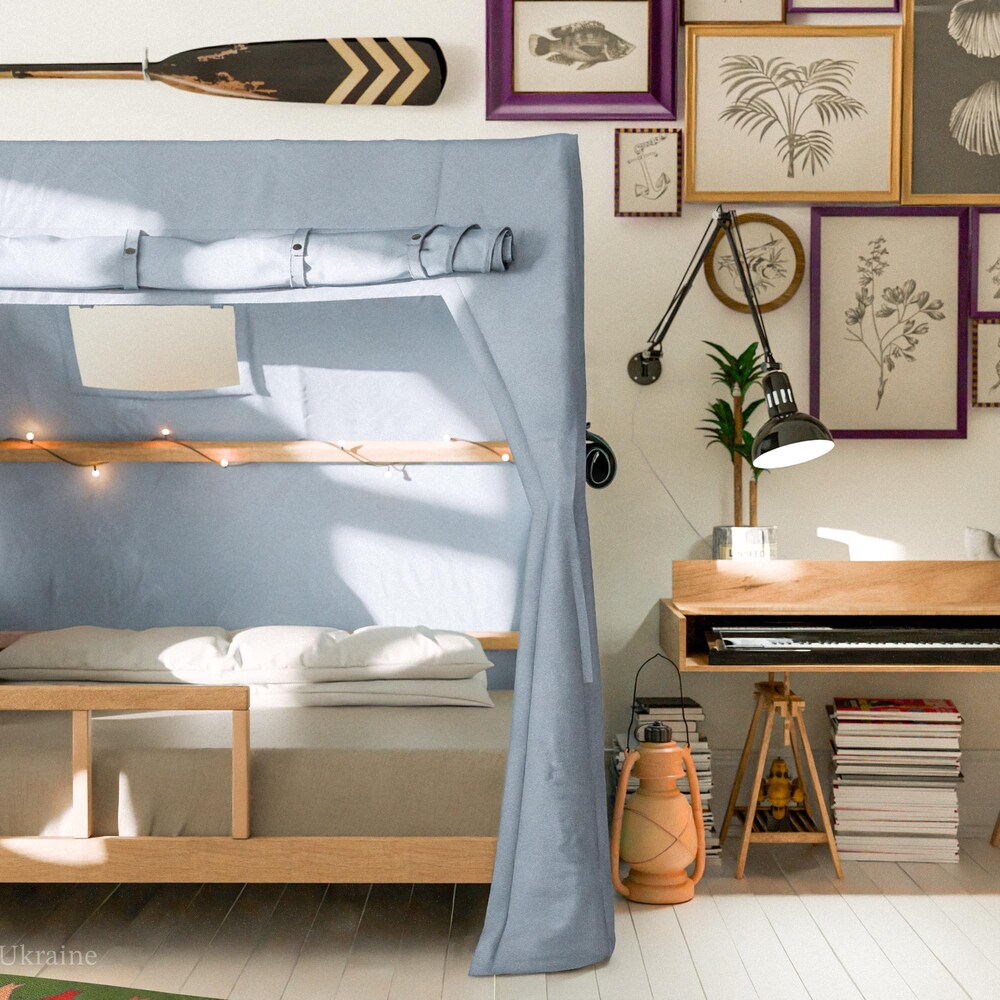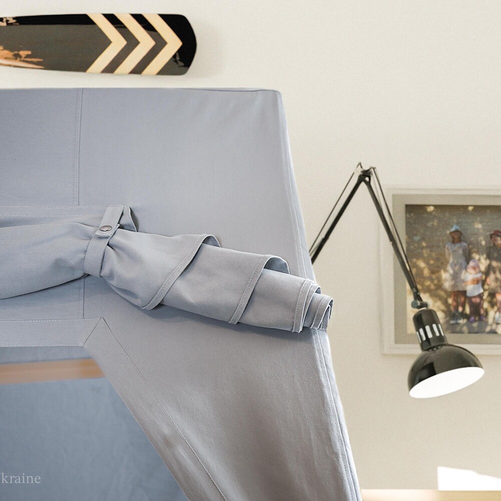 Bed Canopy made from 100% natural, dense cotton fabric, with two side windows and one roof window, all with curtains, and an adjustable front door curtain with three positions.