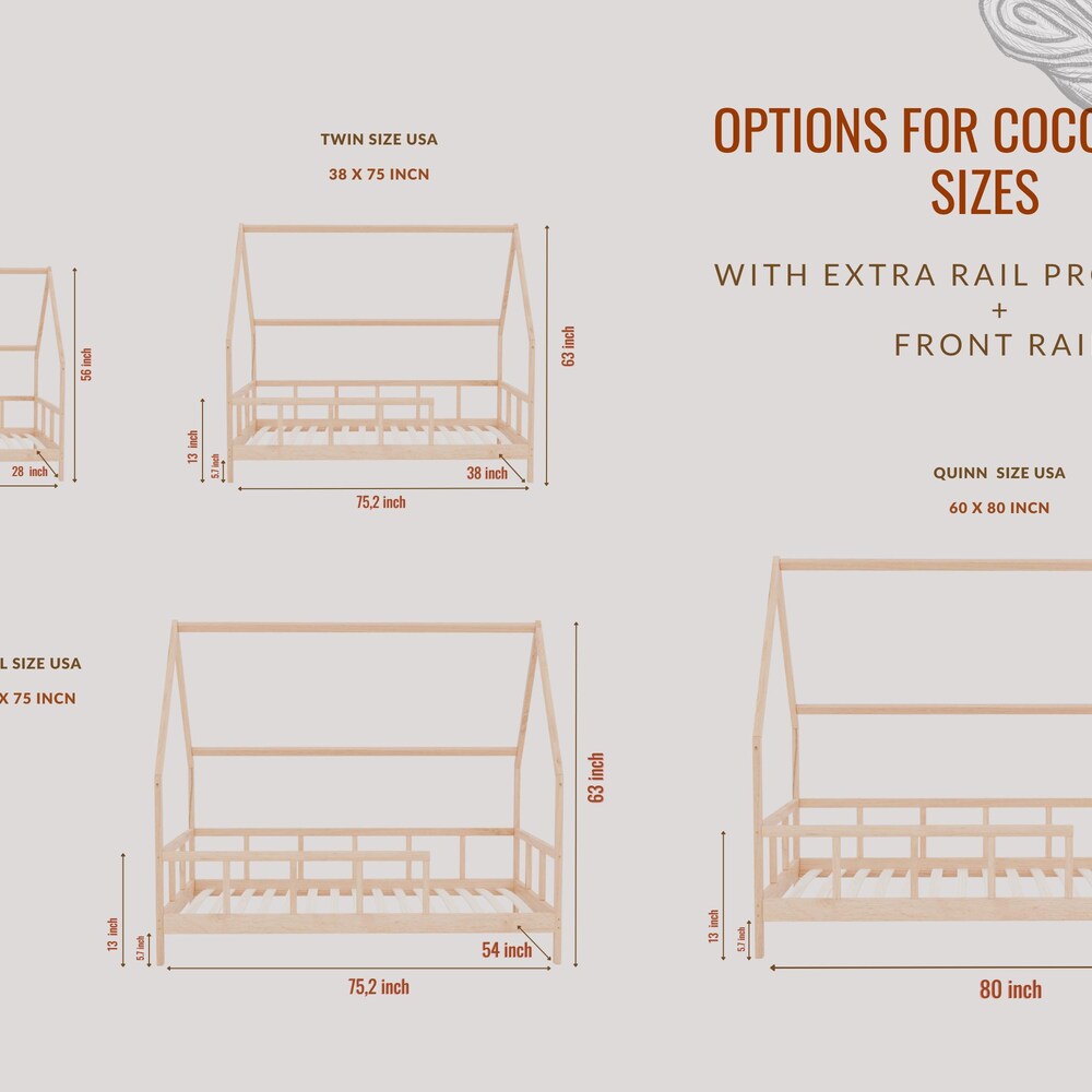 | Bed rails +slats + canopy | Crib 52 x 27.5 in, Twin 75 x 38 in, Full 75 x 53 in, Queen 80 x 60 in |