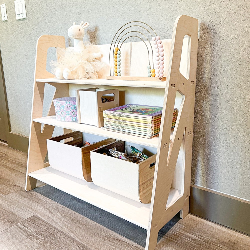 Medium 3 Shelf Montessori Toy Shelf and Bookshelf. Bookshelf has hidden back storage! Side Panels Double as Handles!