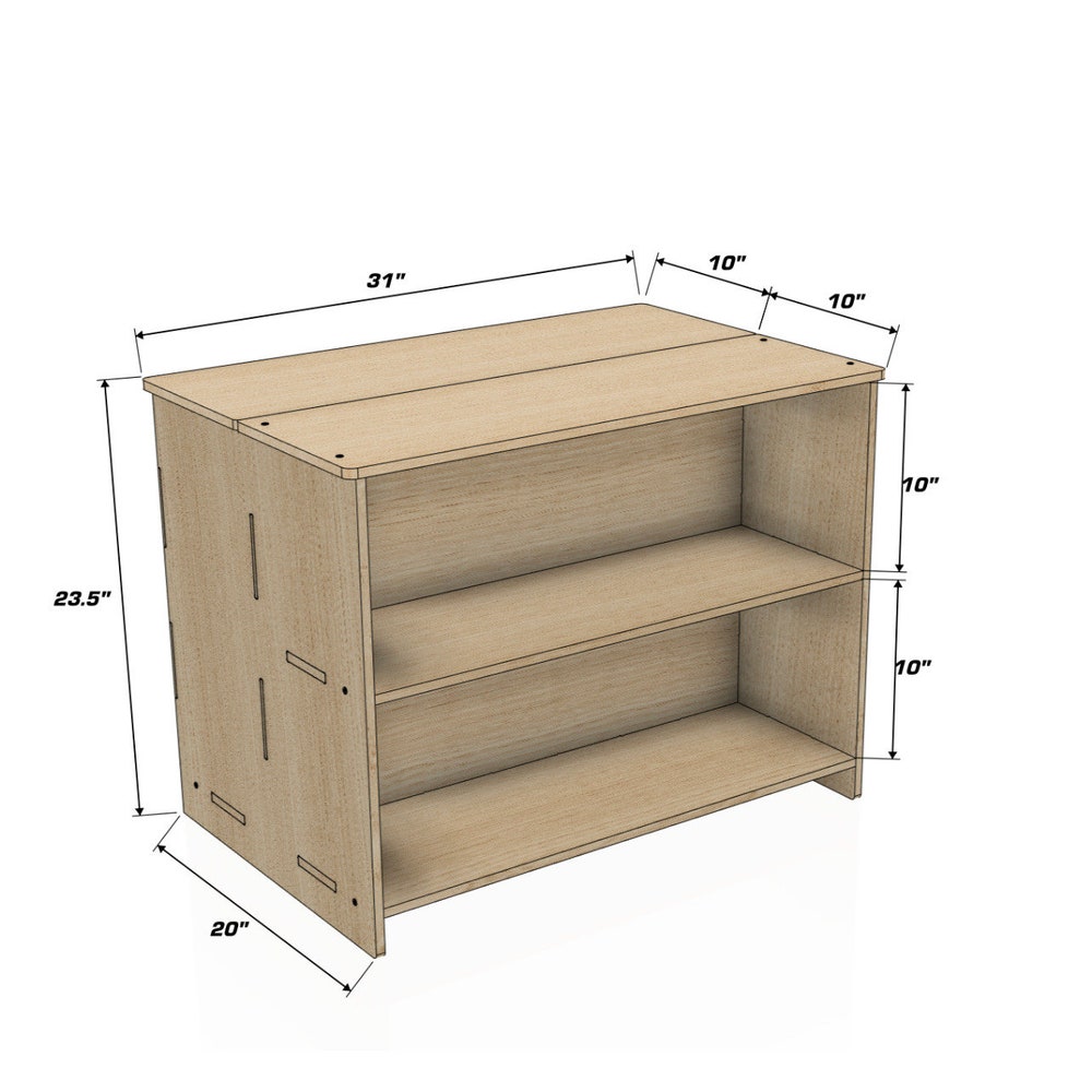 ★ Toy shelf is 20″ deep, 23.5″ tall, and 31″ wide.