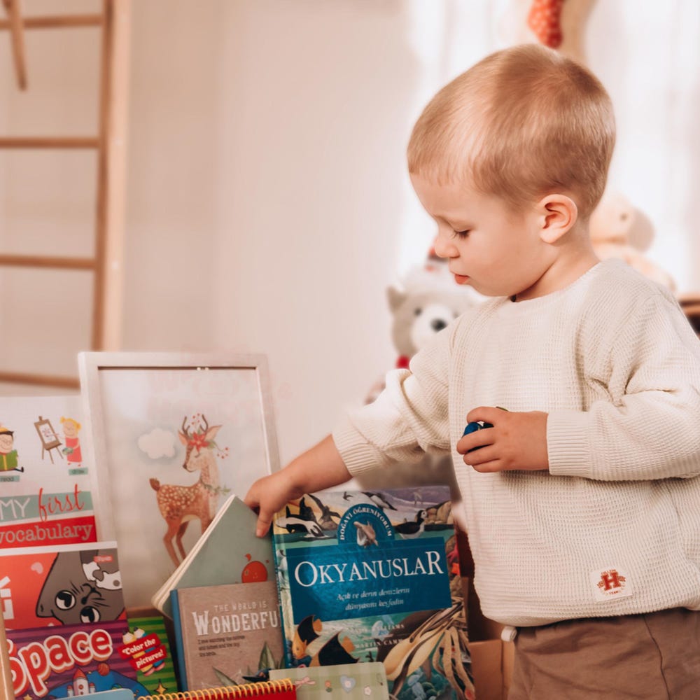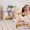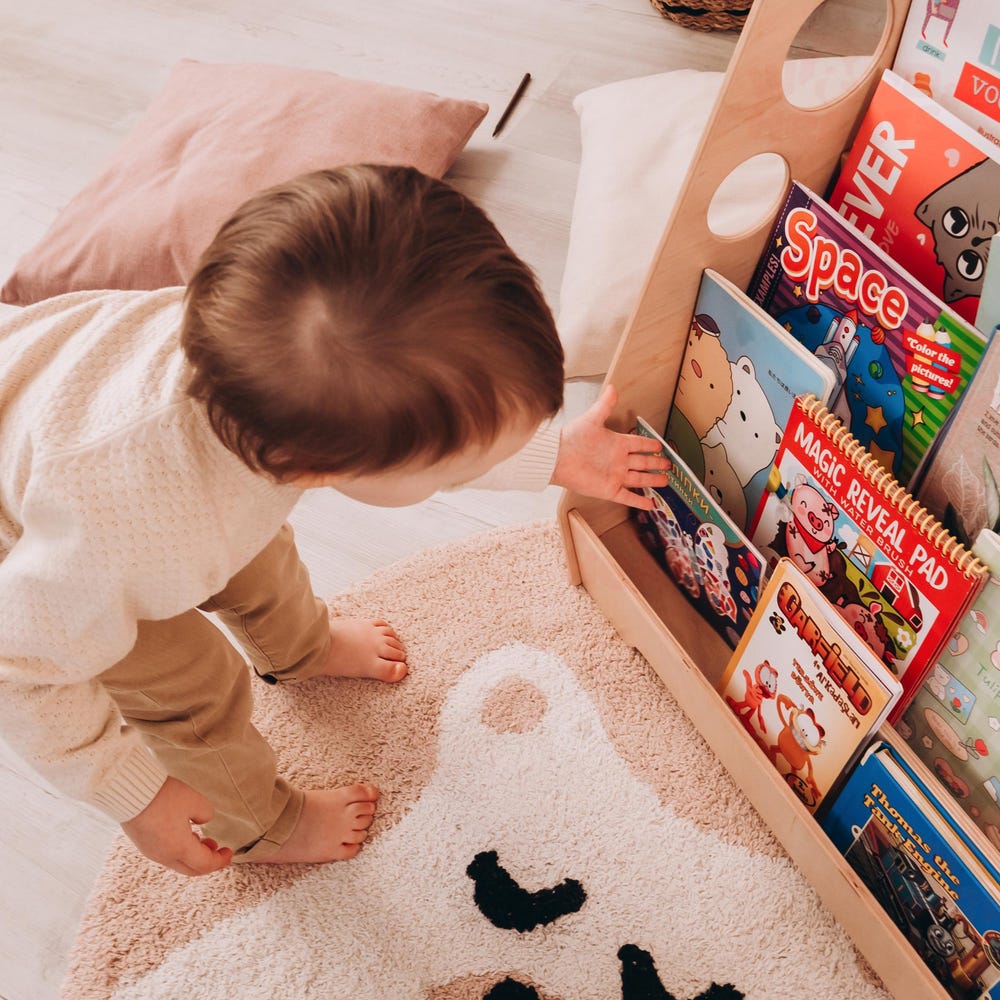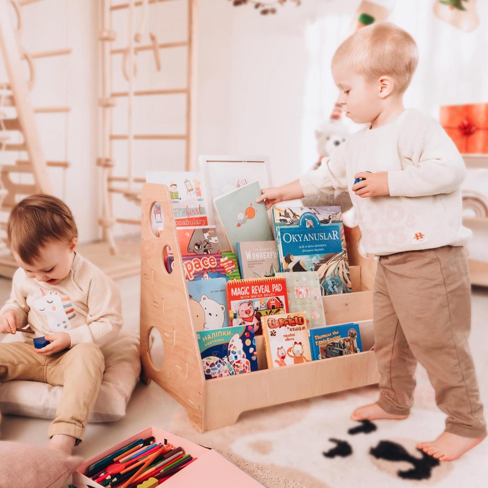 This stylish bookshelf promotes active reading and fosters independent decision-making among children, aligning with the methods of Montessori education.