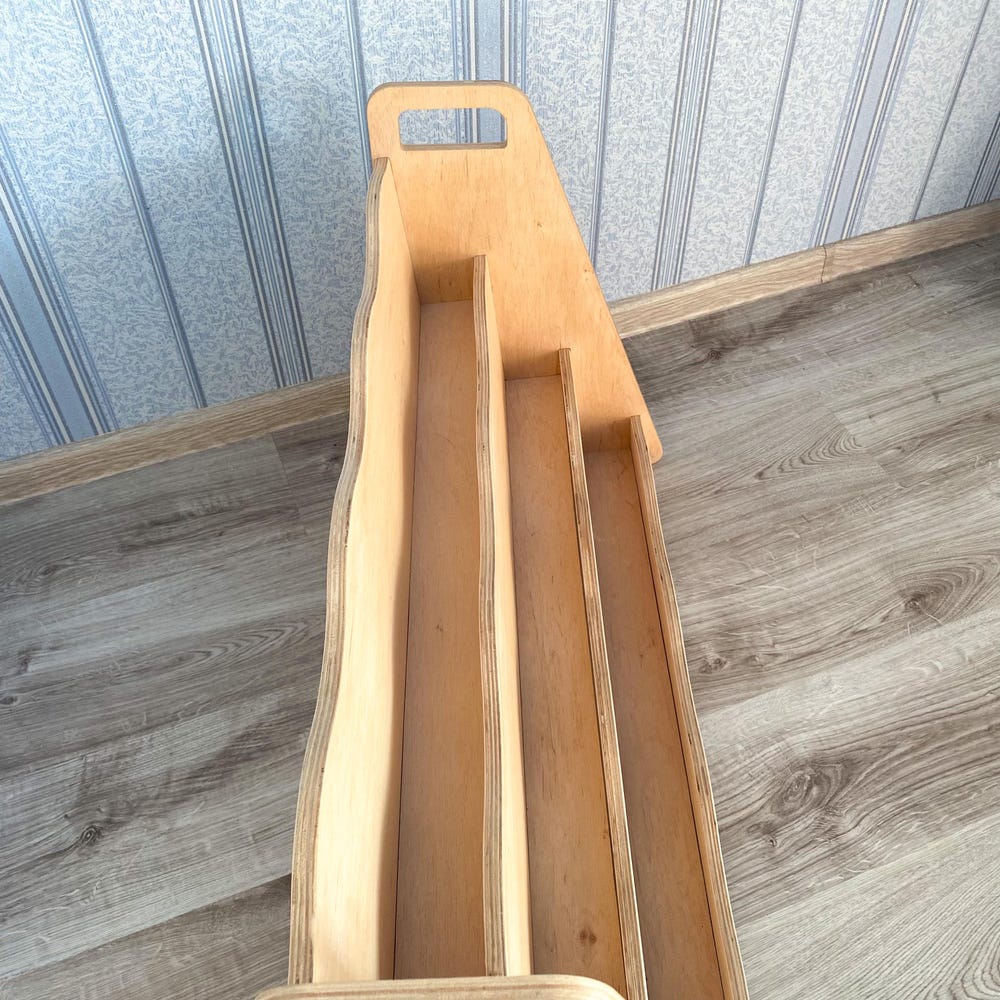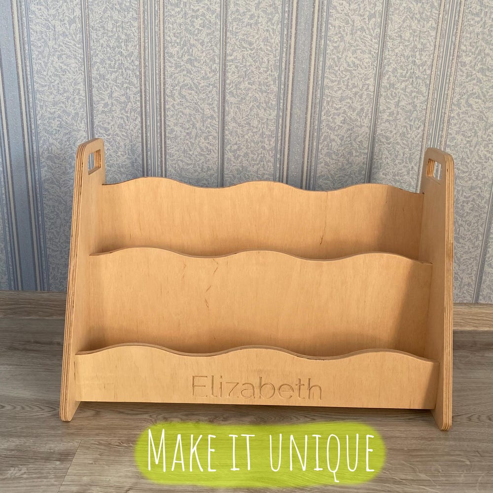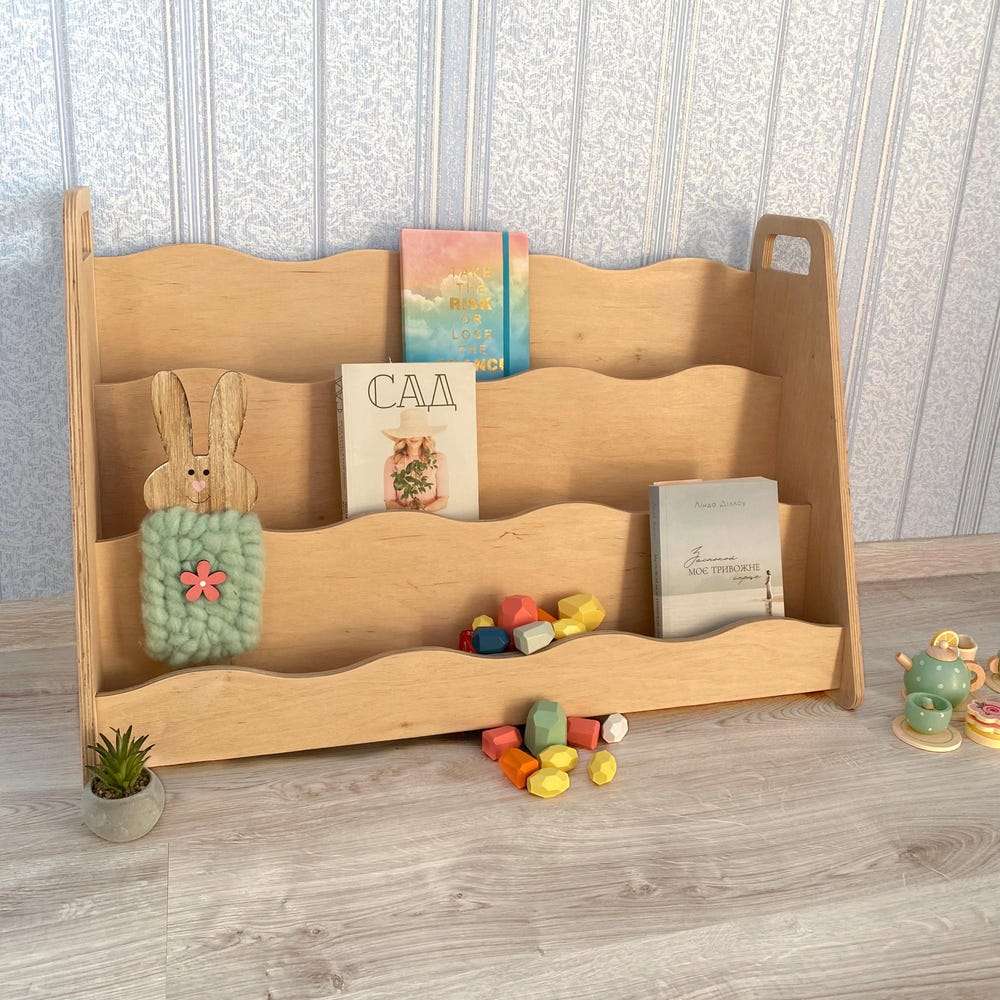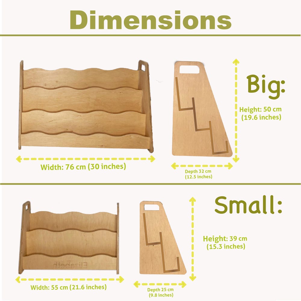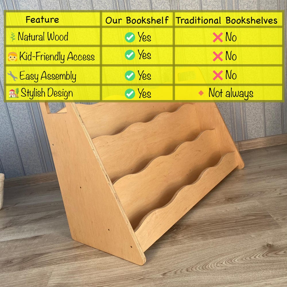 Give your child the gift of organization and independence with our handcrafted Montessori wooden bookshelf. Designed to encourage a love for reading, this natural wood book display makes books easily accessible for little hands.