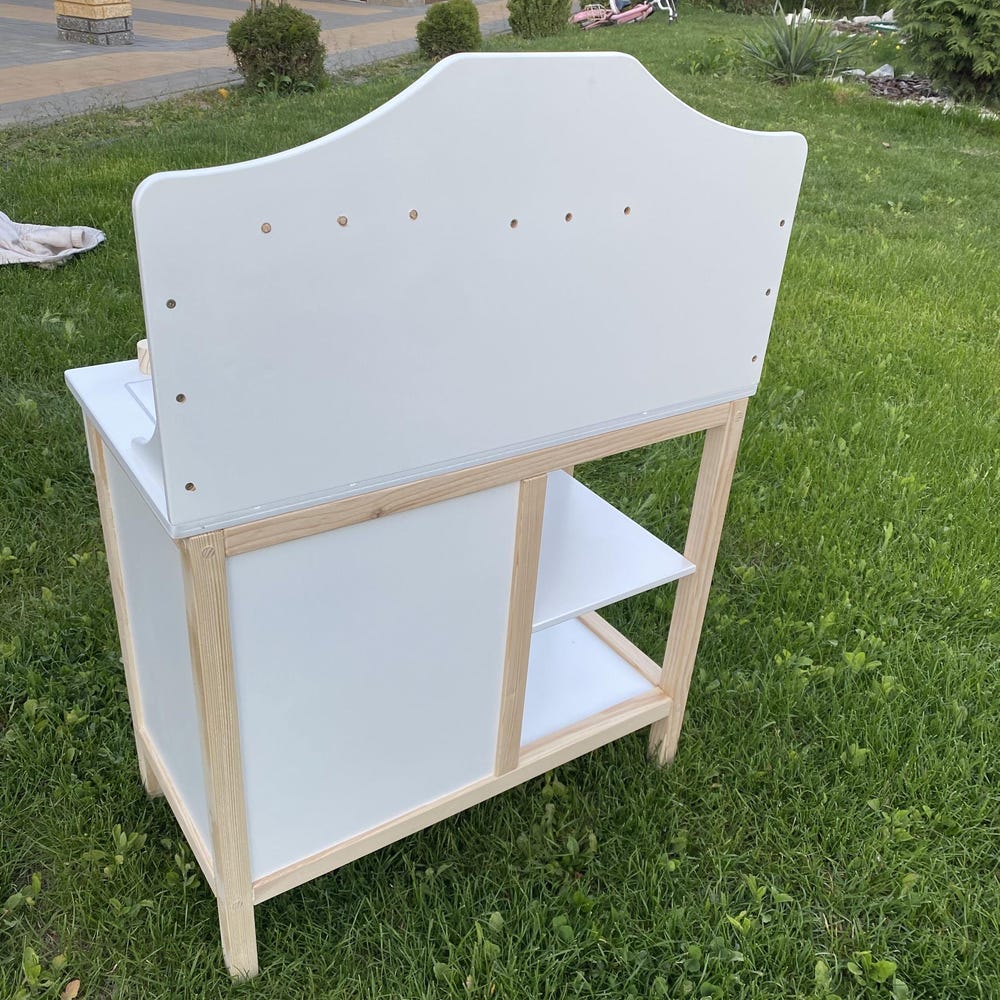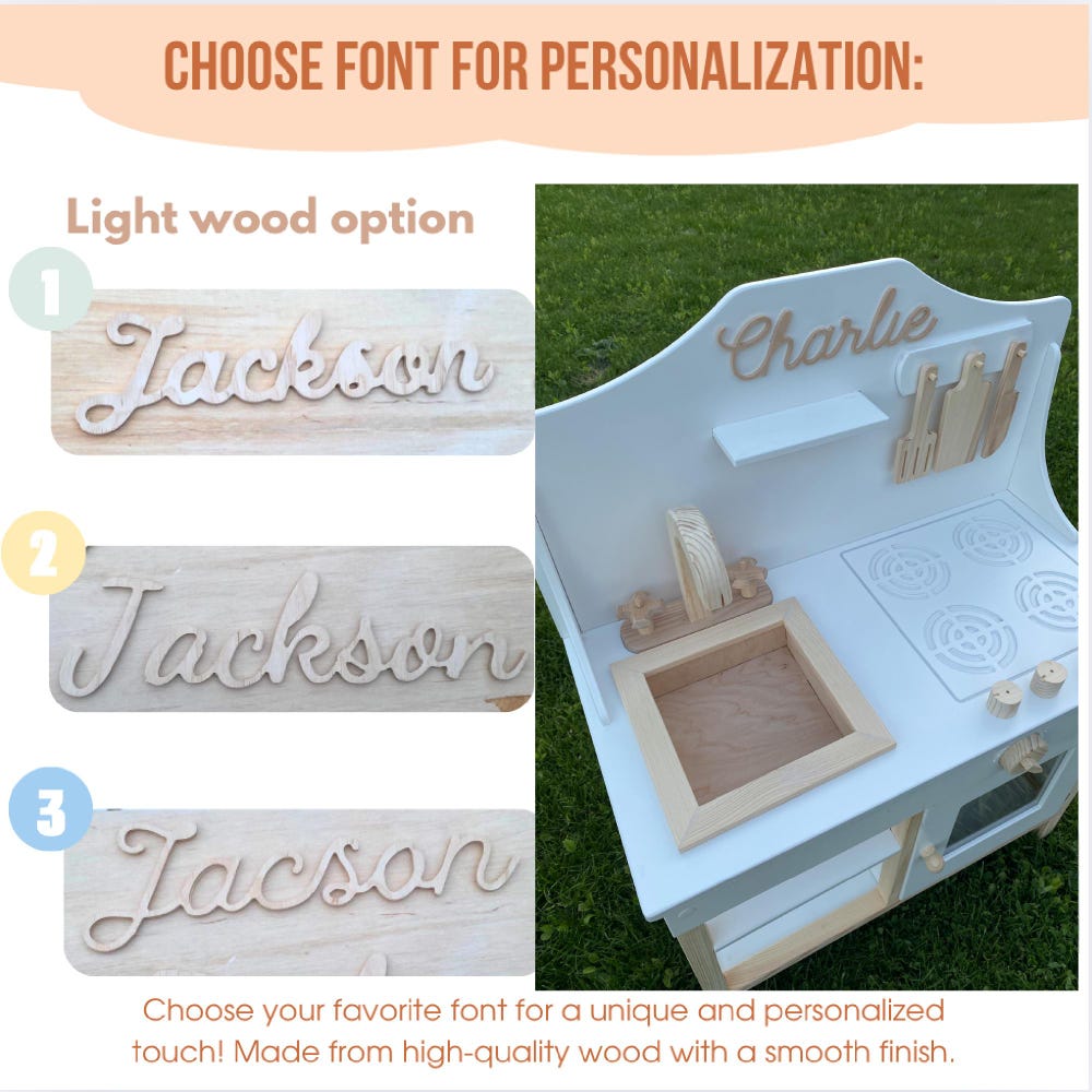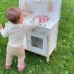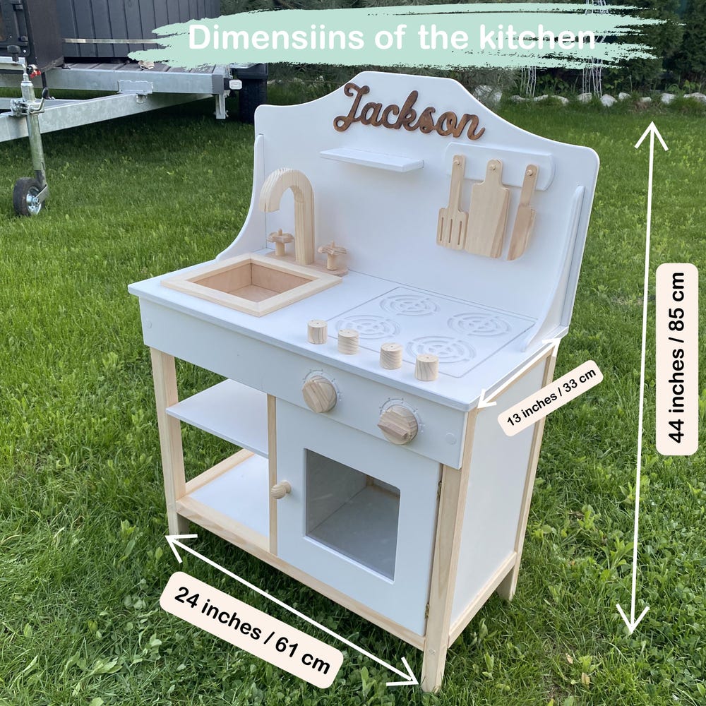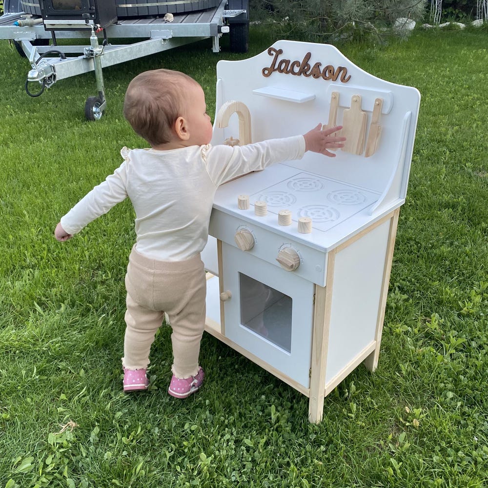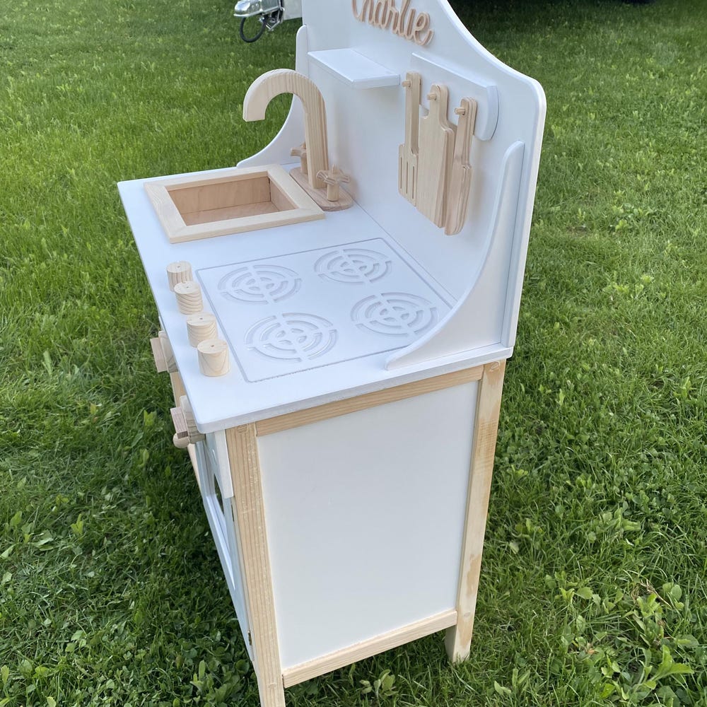 Beautiful Montessori wooden play kitchen – eco-friendly and handmade, ideal gift for toddlers. Encourages imaginative & independent play.