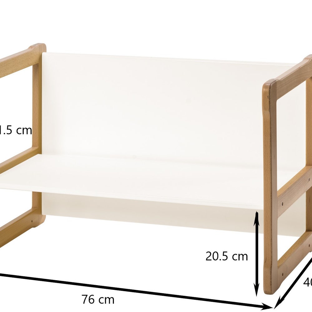 The Woodjoy Multifunctional Desk_Bench is a versatile piece, that can be turned around to serve as a bench with two different seat heights or as a functional desk. Crafted with precision, it offers flexibility and comfort for both study and relaxation. It’s paired with these innovative chairs, that can be rotated into three different positions or heights – from a chair with a backrest at 14 cm and 21 cm to a stool at 34 cm. Designed with your child’s safety in mind, they feature high sides to prevent falls, and their rounded shapes minimize the risk of injury. As your child grows, these chairs can transform into bedside tables or regular shelves, maximizing their utility.