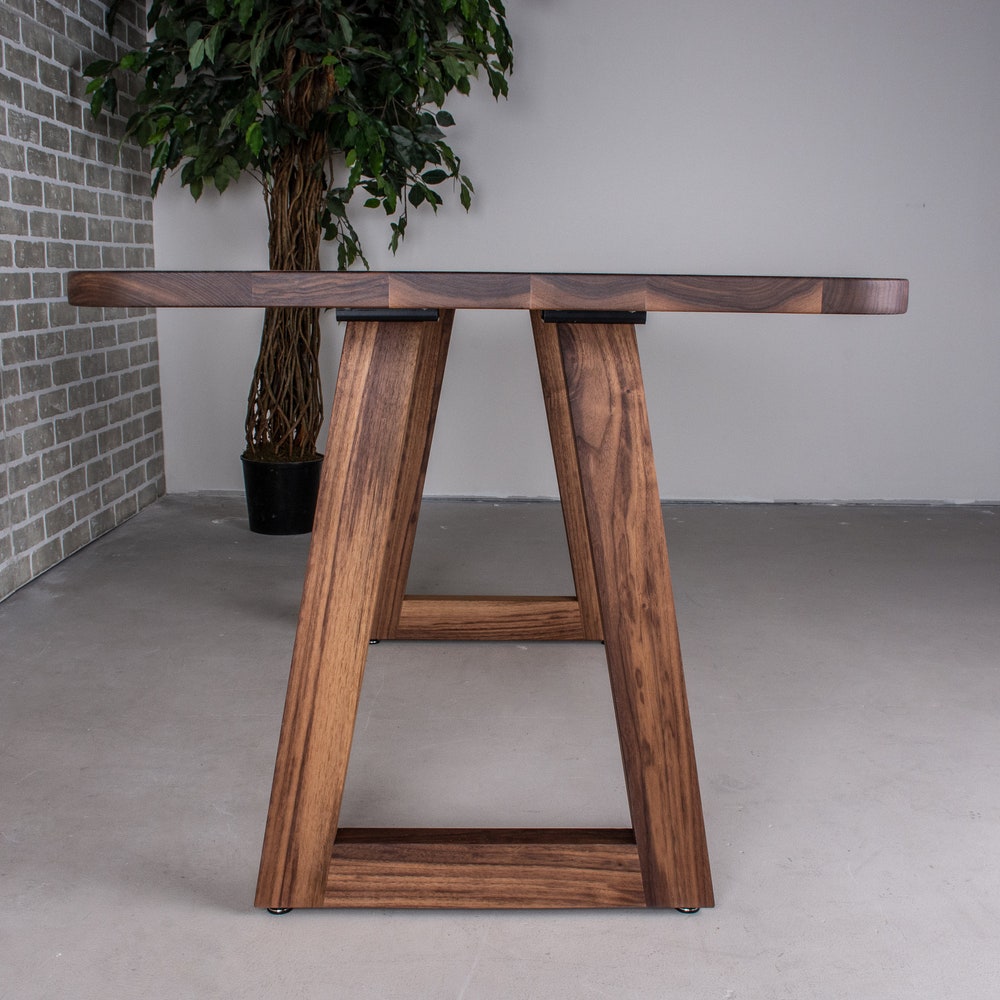 This narrow walnut table makes a great desk or small dining table. The angled walnut legs are an upgrade on the classic steel legs, giving it a timeless appeal. We build every table to order so there are many ways to make this table perfect for you.