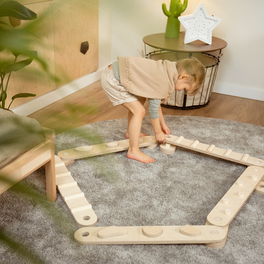Balance beam set from 6 beams helps to learn different shapes, learn how to balance body and develop gross motor skills. Different shaped obstacles improves feet sensory stimulation and are recommended to gain barefoot sensations.