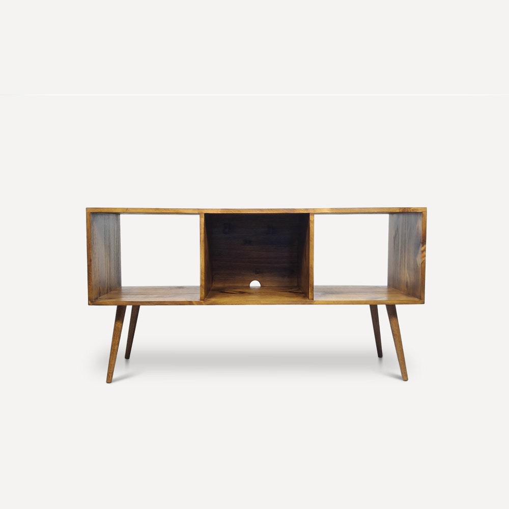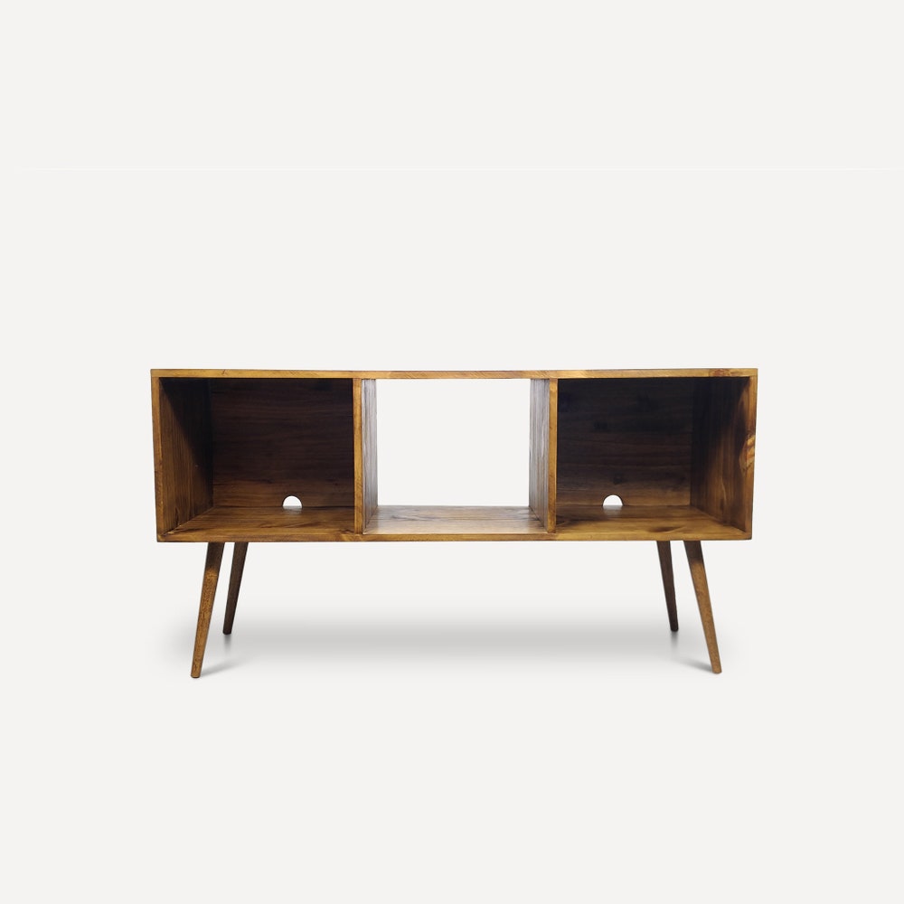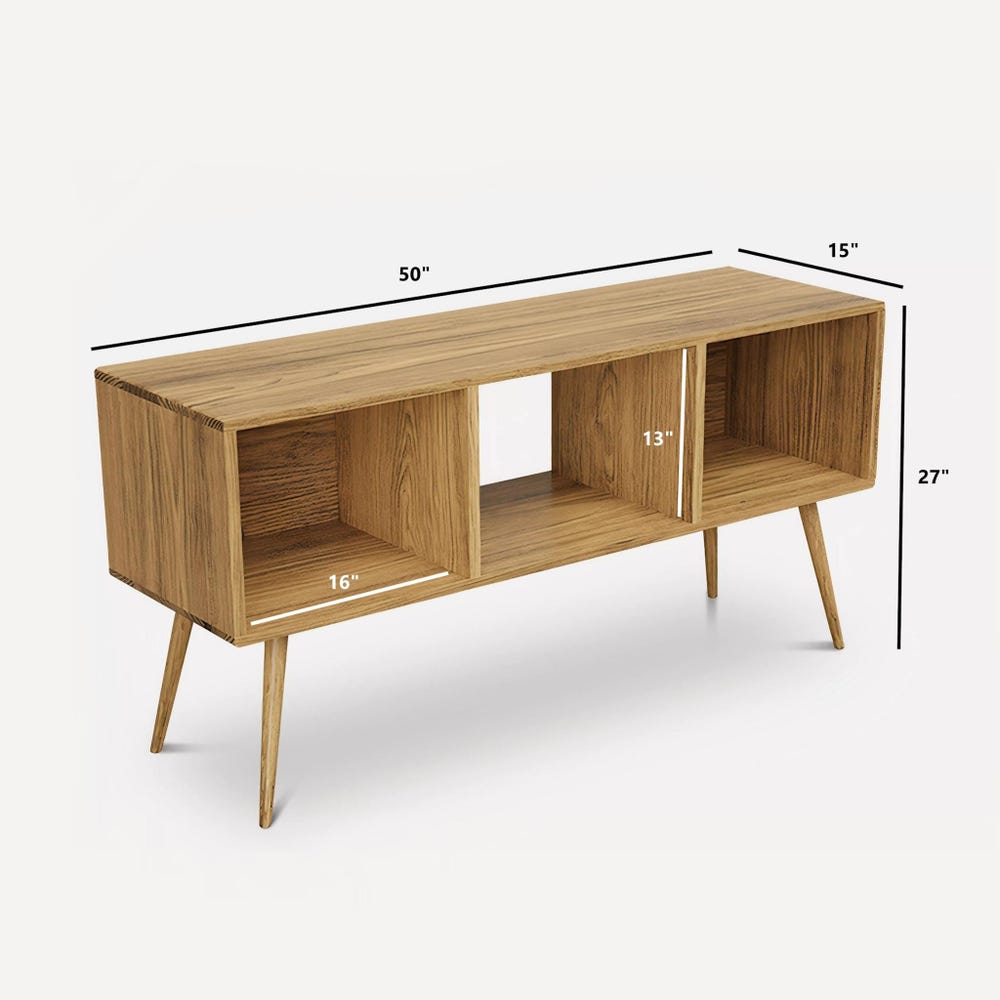 Blend the science of cutting-edge technology with the craft of raw industry with this spacious media console. Choose from your favorite stain and let your sparkling electronics stand out against a backdrop of honey woods and faux rough cuts.