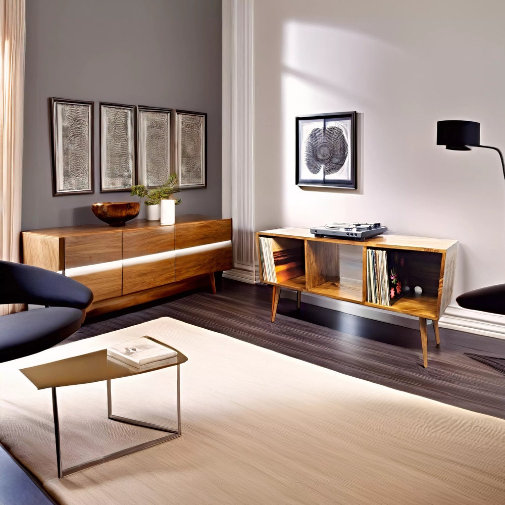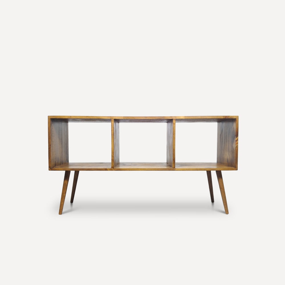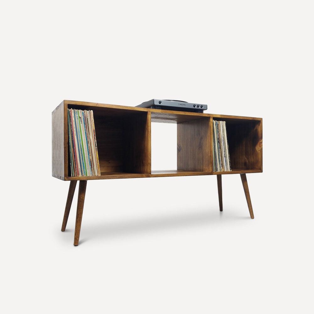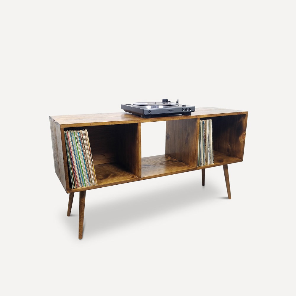Blend the science of cutting-edge technology with the craft of raw industry with this spacious media console. Choose from your favorite stain and let your sparkling electronics stand out against a backdrop of honey woods and faux rough cuts.