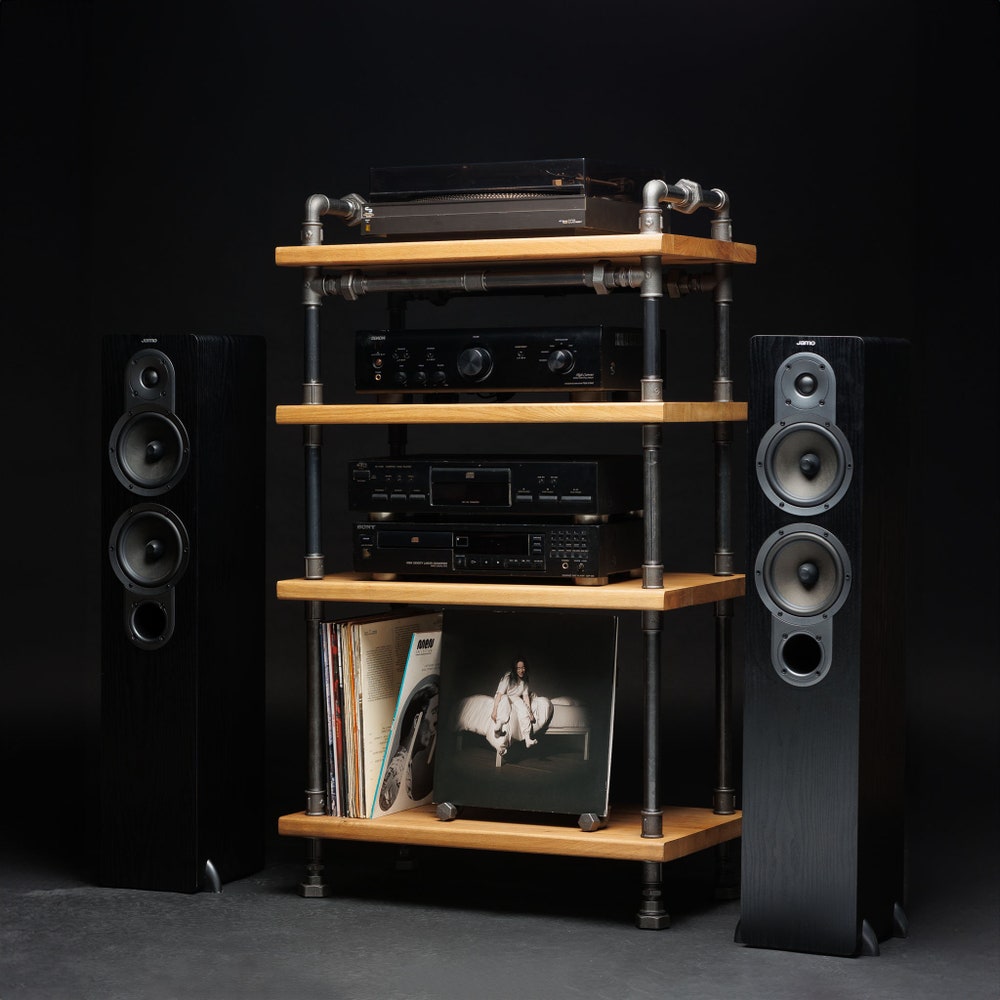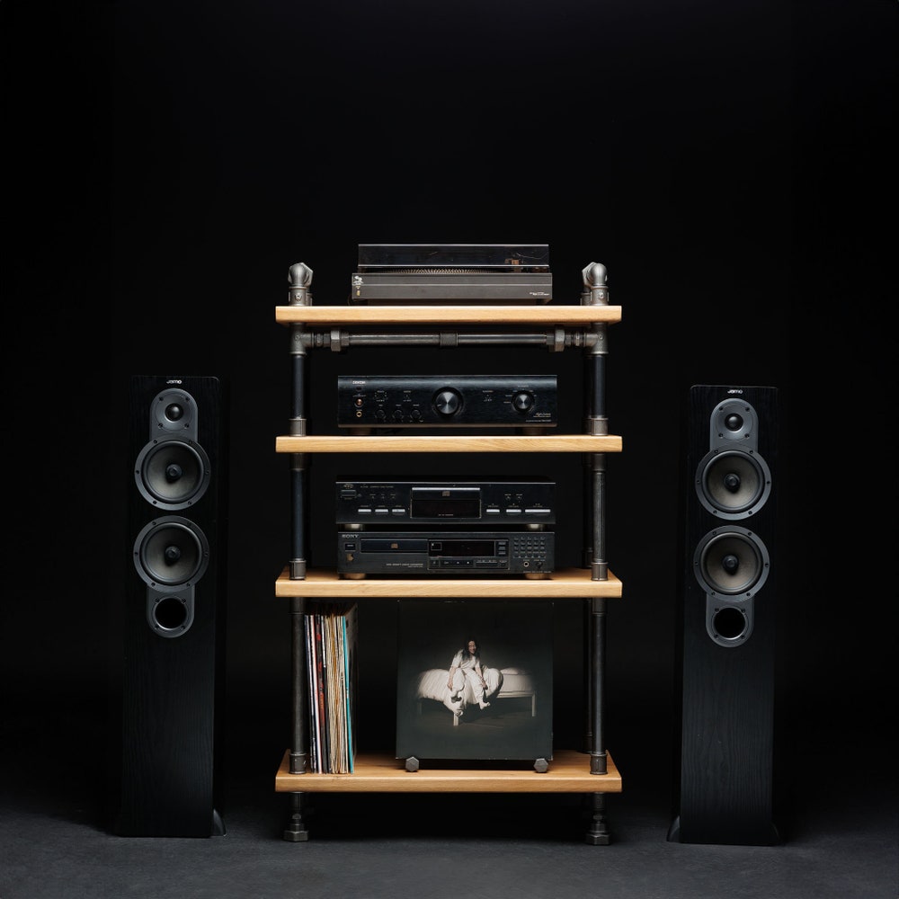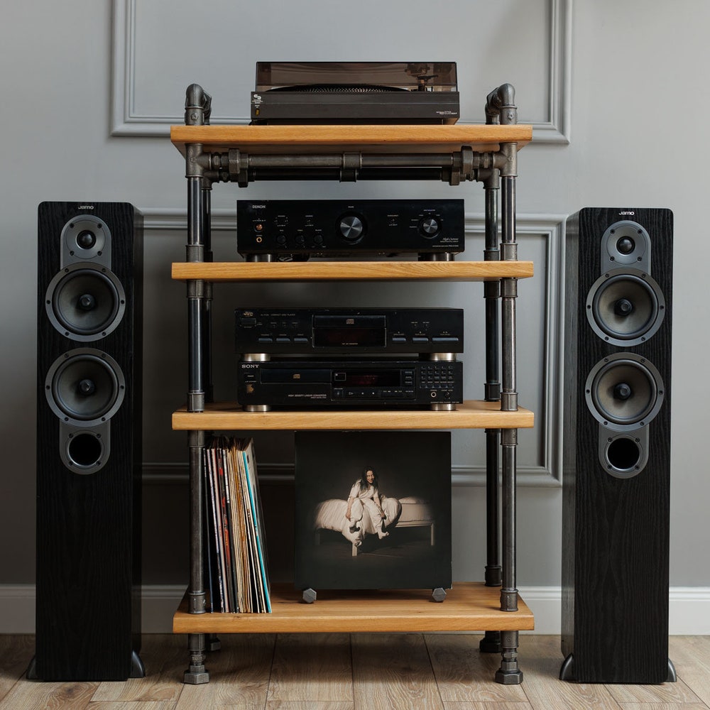 2 IN 1 Registered design stand, 5 Tier Oak Black rods stand, audio rack / Record player stand / Turntable stand / Threaded rod shelf