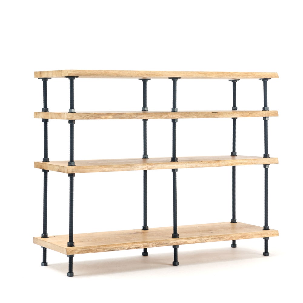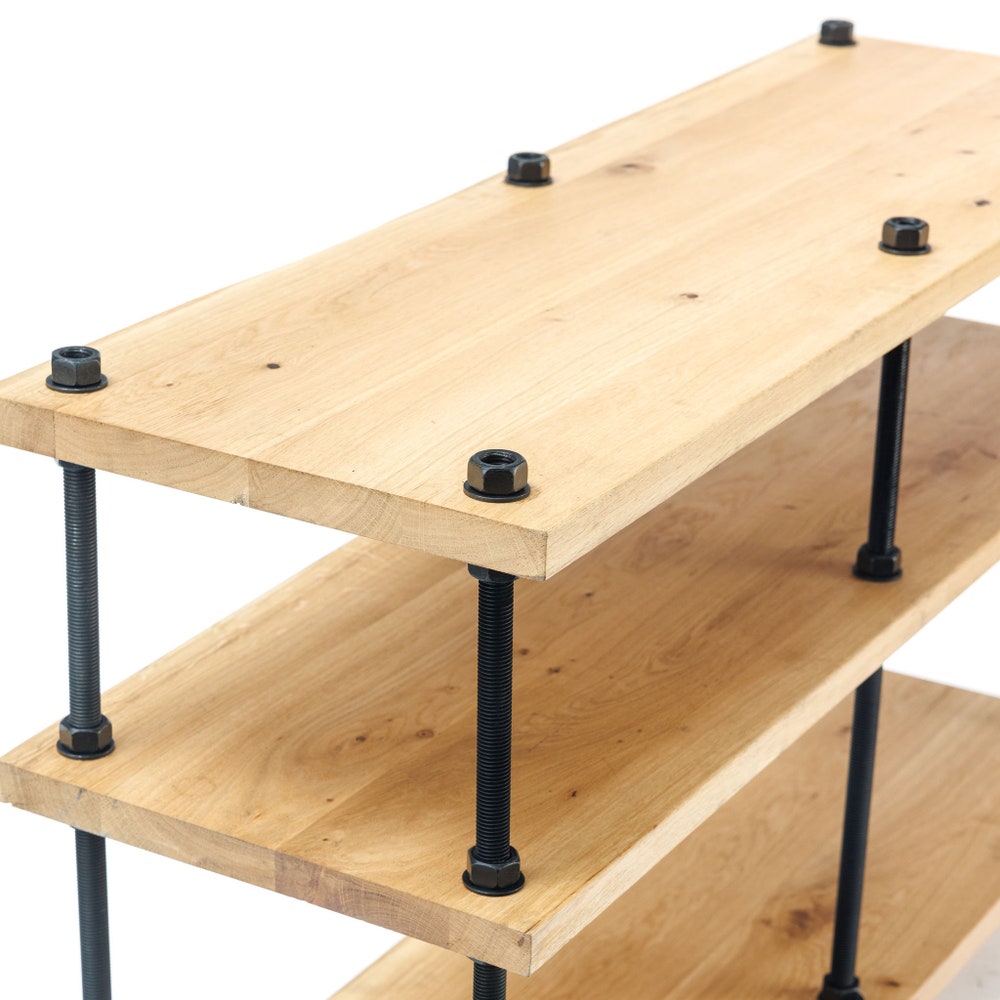 – 50 kg – 3 tier rack standard dimensions 118*40 cm from industrial pipe/threaded rods/ solid beech wood panels.
