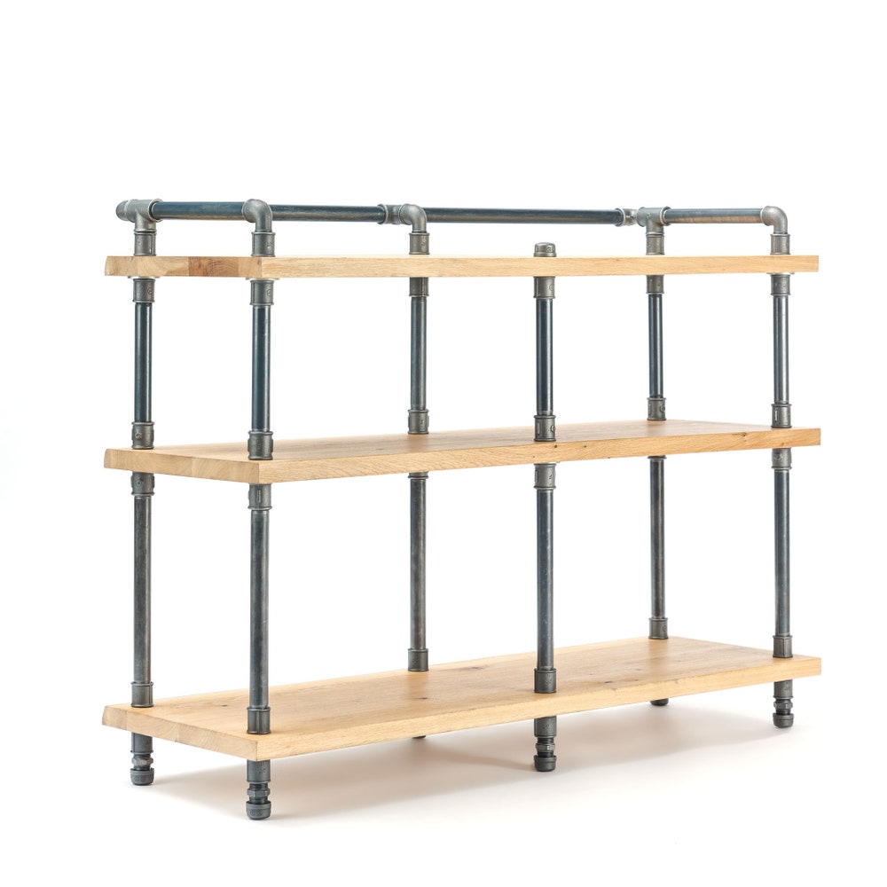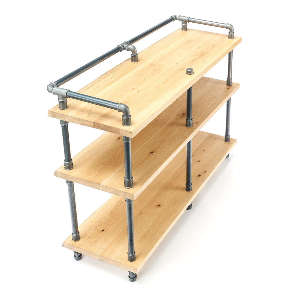 – 50 kg – 3 tier rack standard dimensions 118*40 cm from industrial pipe/threaded rods/ solid beech wood panels.