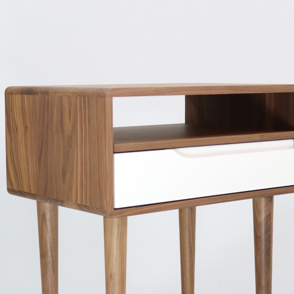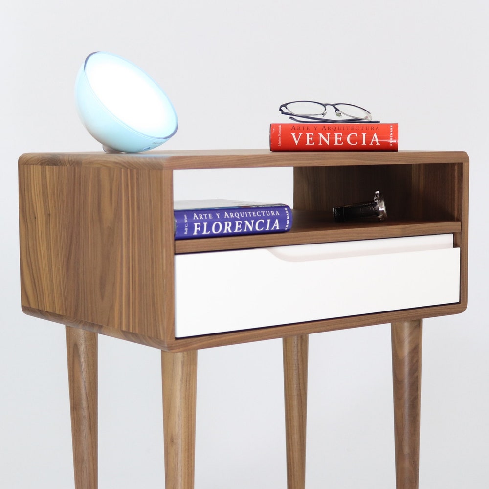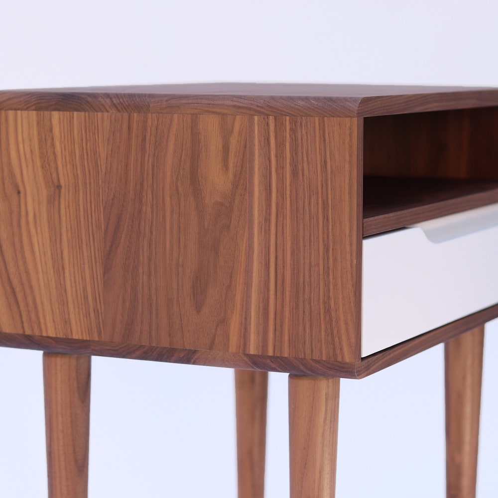 Nightstand, Bedside table, side table with shelf and white lower drawer in solid Oak or Walnut.