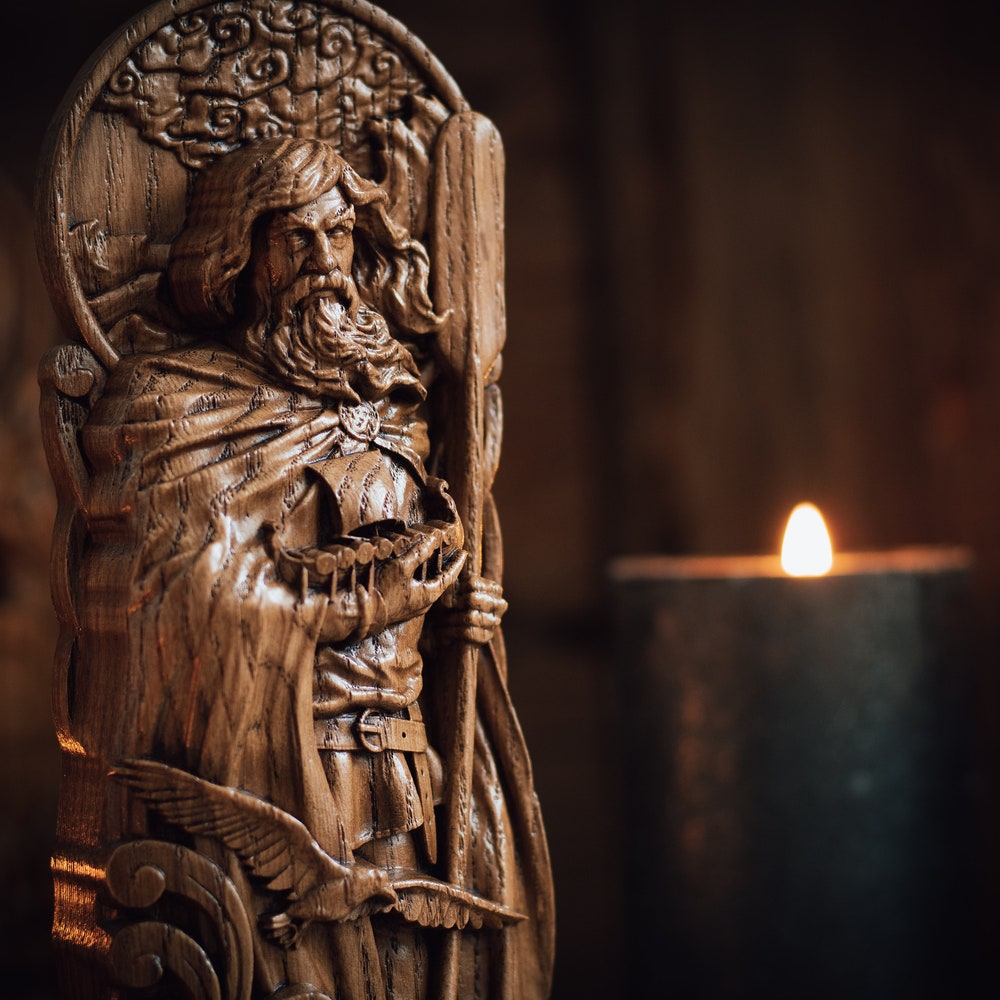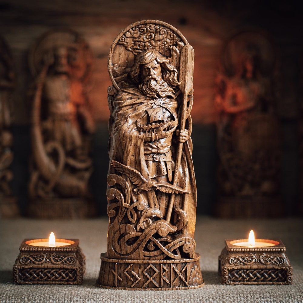 Bragi statue, norse gods, wood carving altar heathen asatru viking god and goddes sculpture wooden scandinavian pantheon