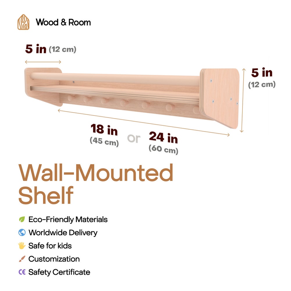 The Listing consists:ONE Wall-mounted shelf with Hooks (SMALL size) This wall-mount shelf with hooks is a versatile piece of furniture designed to provide storage and organization in a nursery or child’s room. It includes shelves for displaying items and hooks for hanging accessories or clothing. DIMENSIONS:Small Wall-mounted shelf with Hooks – 18 in * 5 […]