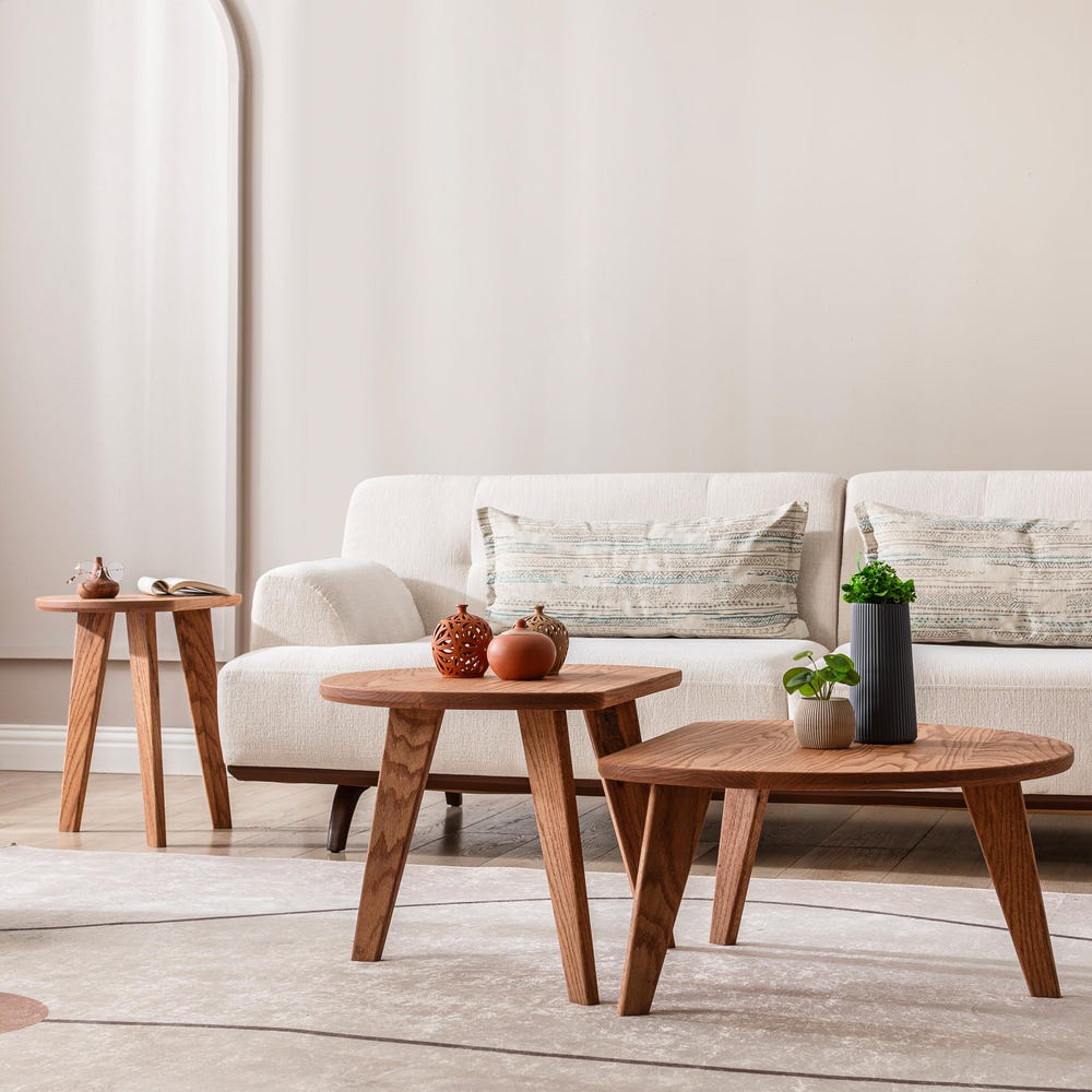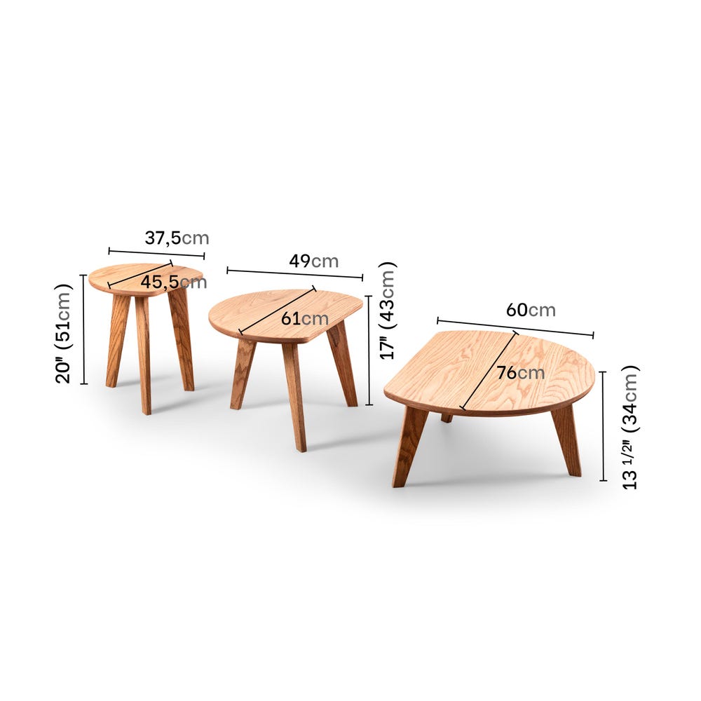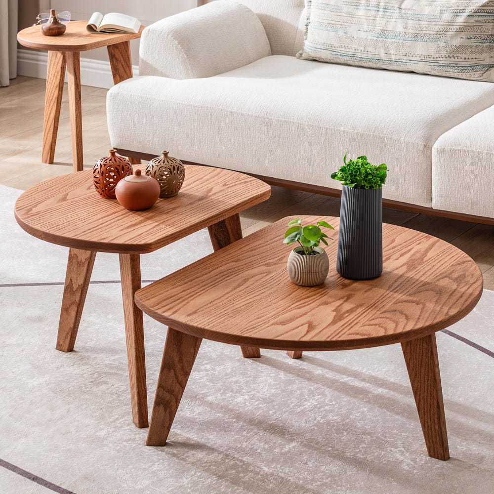 Oak Coffee Table Set is designed to bring a touch of natural elegance to your living room. The set created to serve your total ease with it’s 3 components in different heights and tabletop sizes. The low coffee table with larger top will be the central item that will stand in front of your sofa. The medium one which is comparatively higher will complete the total look at the center and at the same time it will be located near the sofa as a nesting table. The highest wooden coffee table can both be placed at the center and next to the sofa that can be used as end table.