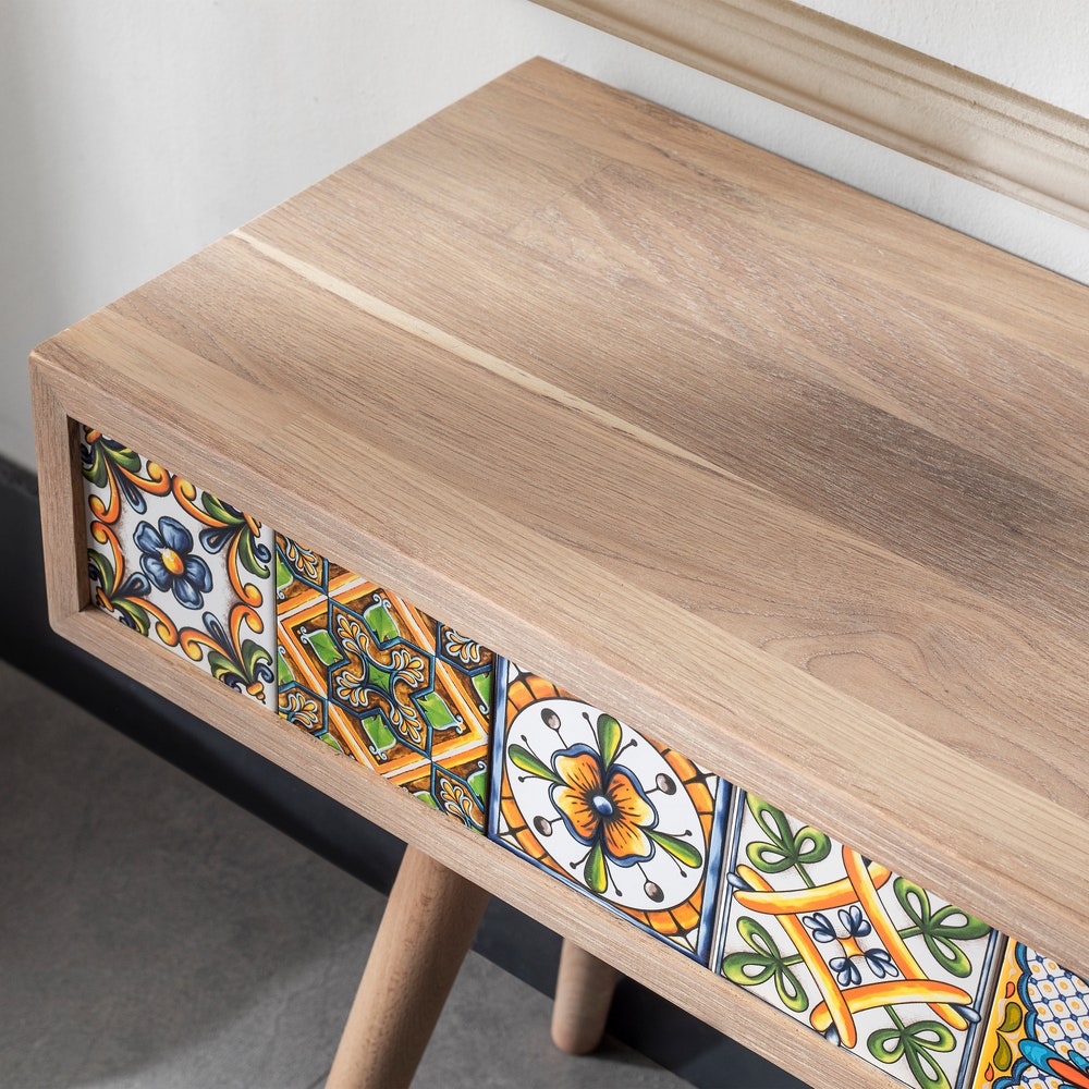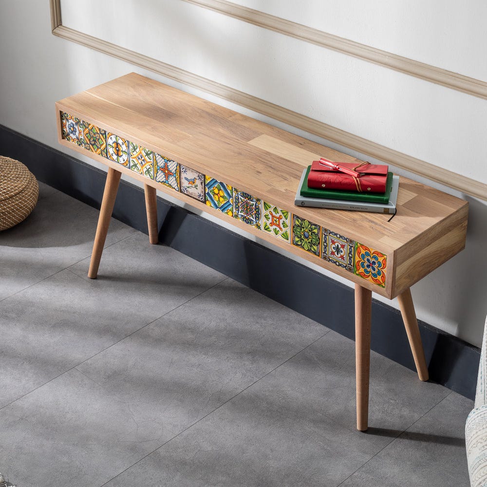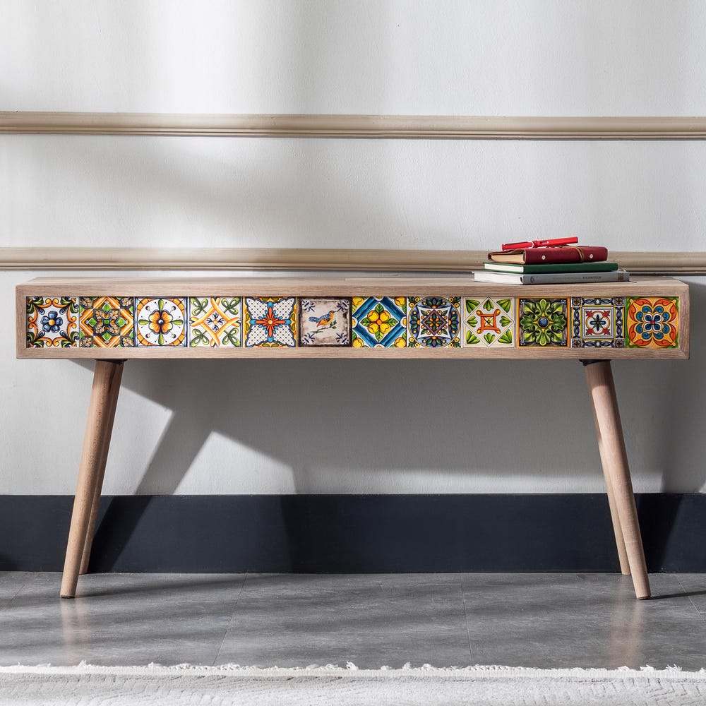 Oak Coffee Table with Mexican Tiles, Wooden End Table, White Oak Side Table with Talavera Tiles, Hallway Console, Custom Entryway Stand
