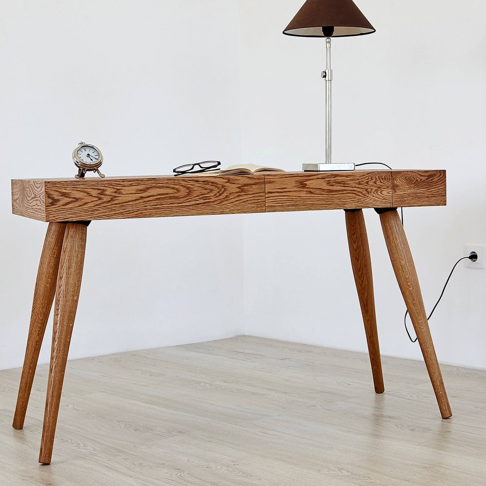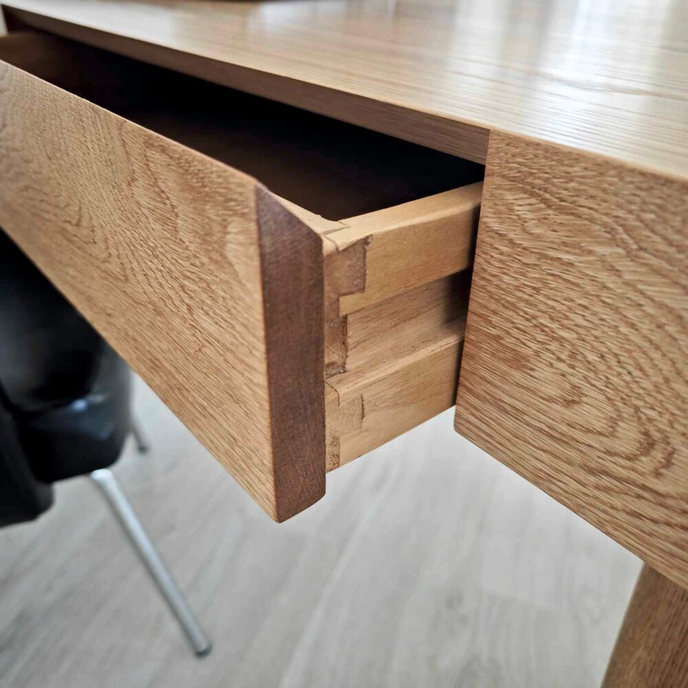 Oak desk with pure, minimalist lines and finished with natural products. Our objective is to develop a piece of furniture with the equipment and functionality offered by the drawer it has and the stability provided by the new fastening system for our legs. For a uniform look, feel free to pair this piece with other products from our collection.