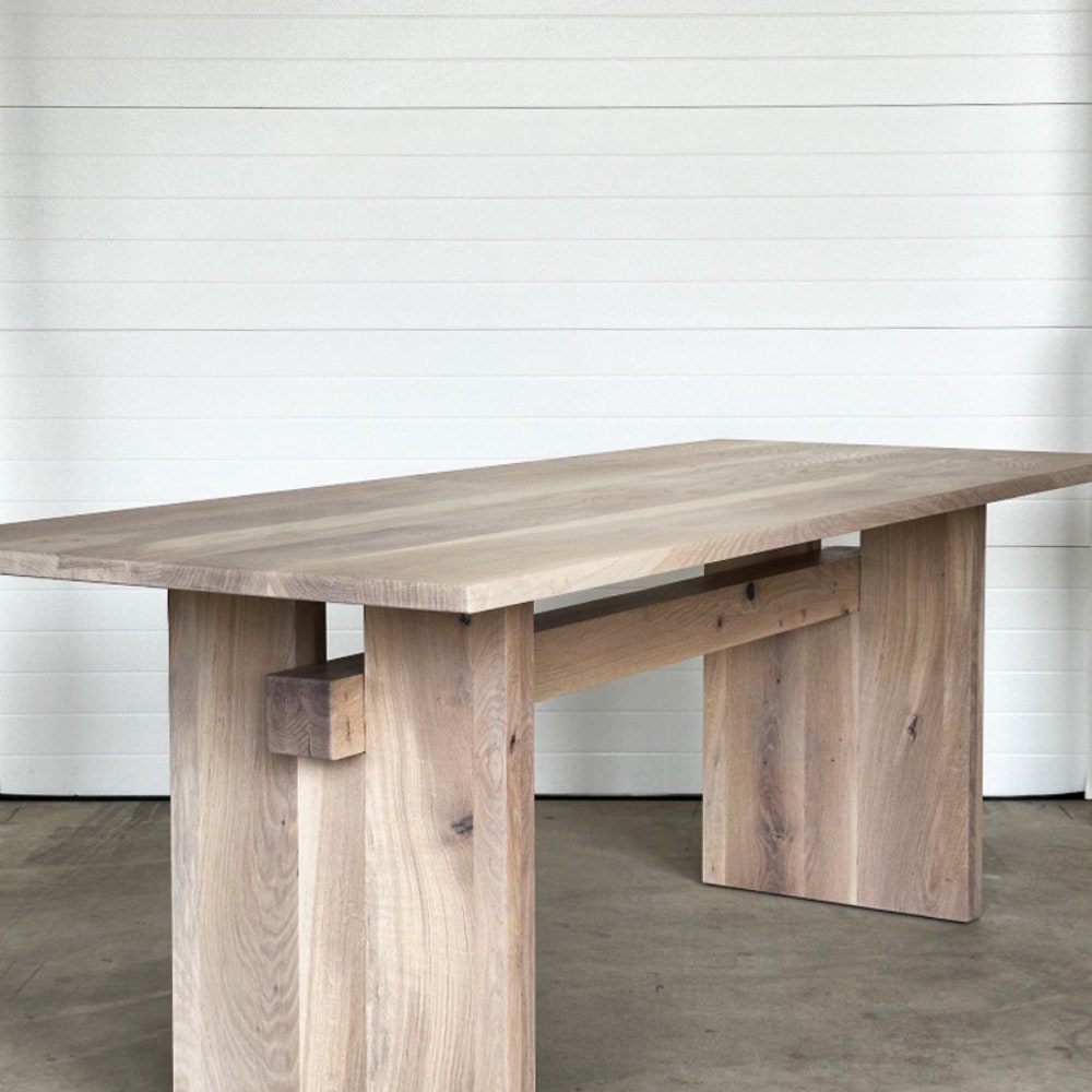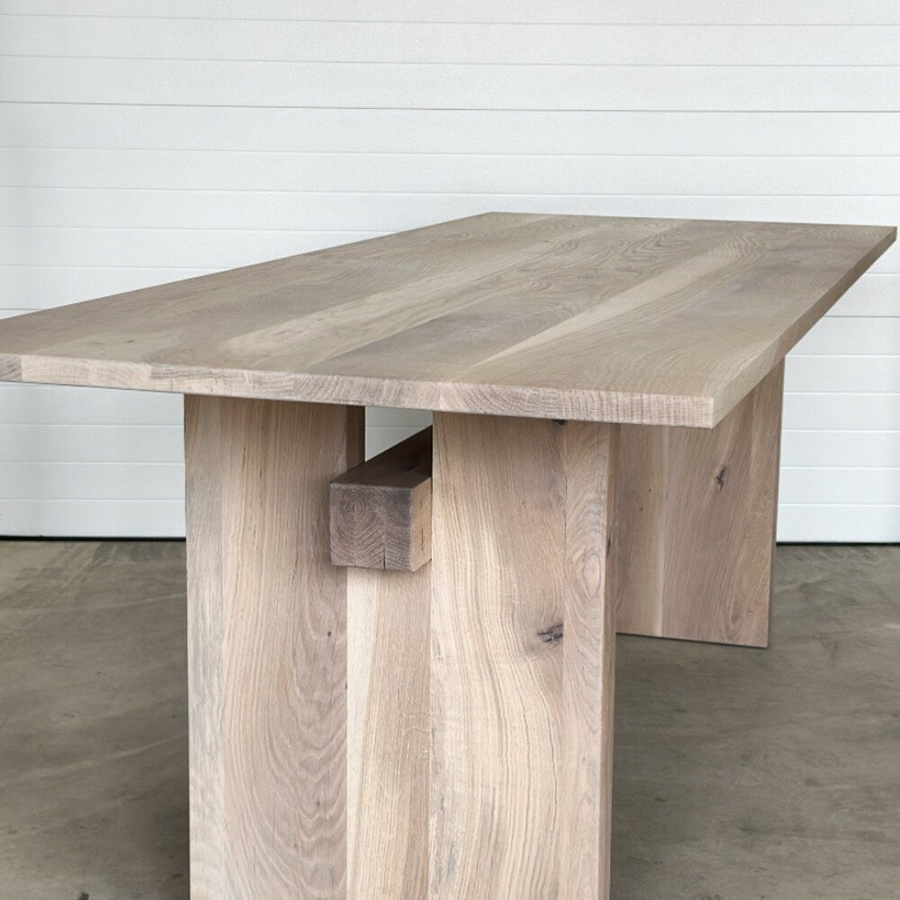 This oak dining table features a striking intersecting solid wood beam, complemented by thick plank-style legs for a heavy and organic design.