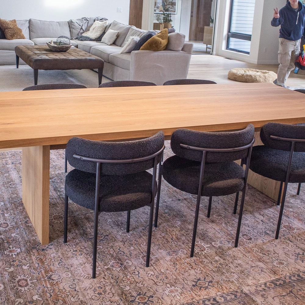 This oak dining table is made of solid oak. The 42” x 108” size we photographed is perfect for 10-12 people. Because we build each table to order, we can build your table in exactly the size you need. If your size isn’t listed or if you have any questions, message us. We’re here to help!