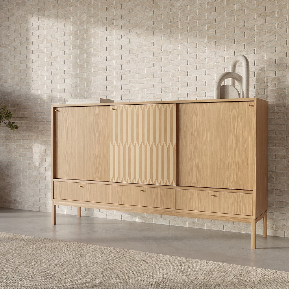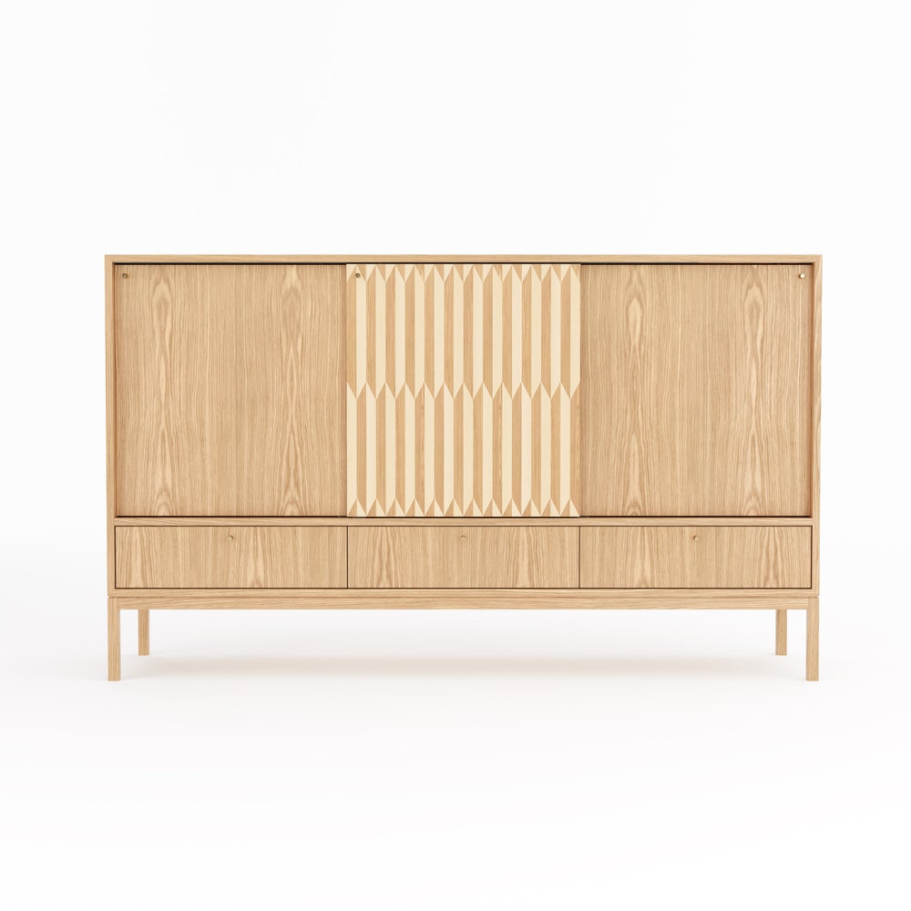 Oak highboard with three inlaid sliding doors and three drawers in mid century modern style, credenza, dresser, commode, made of oak veneer