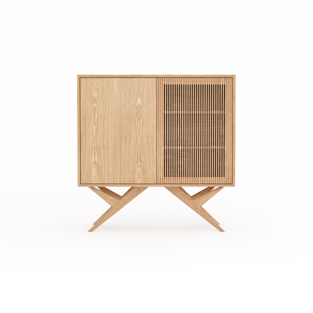 Oak highboard with two slatted doors and organic shape base in mid century modern style, credenza, dresser, commode, media cabinet console
