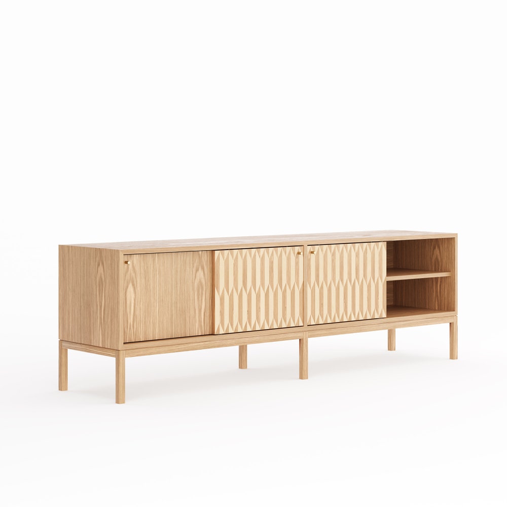 Oak long sideboard TV stand with three inlaid sliding doors in mid century modern style, credenza, dresser, commode, oak inlay