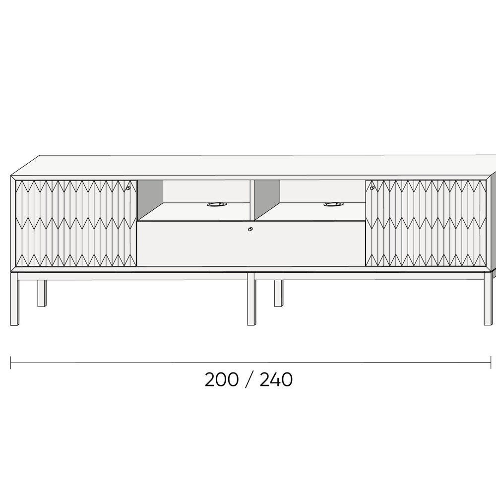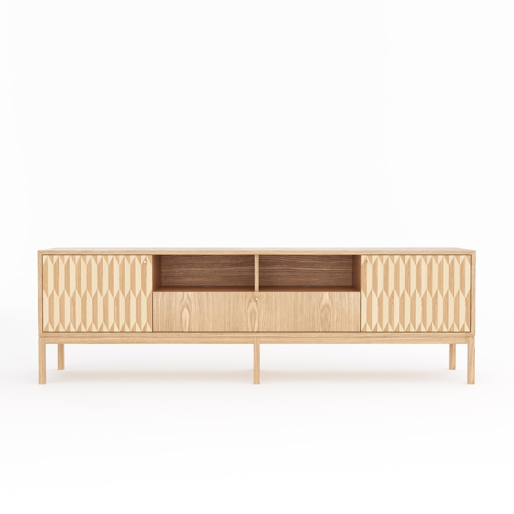 Beautiful long oak sideboard, TV stand with two inlaid doors and one drawer in mid century modern style.Brass handles and two cable holes in the middle.Doors are inlaid (oak + maple veneer).Sideboard, made of solid oak wood and wood covered with natural oak veneer. One adjustable shelf behind each door.Handmade in Poland. Dimensions:width: 200 cm […]